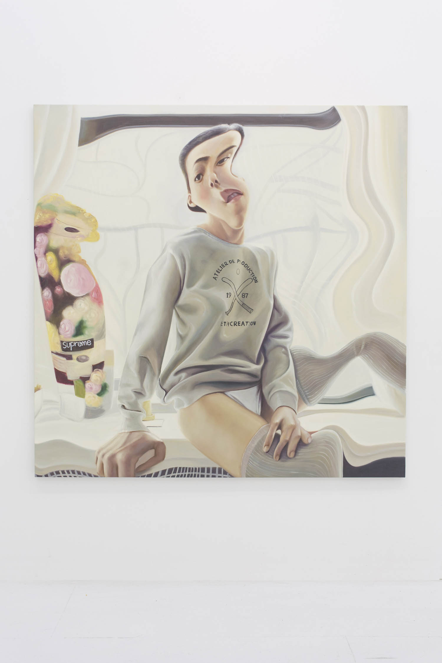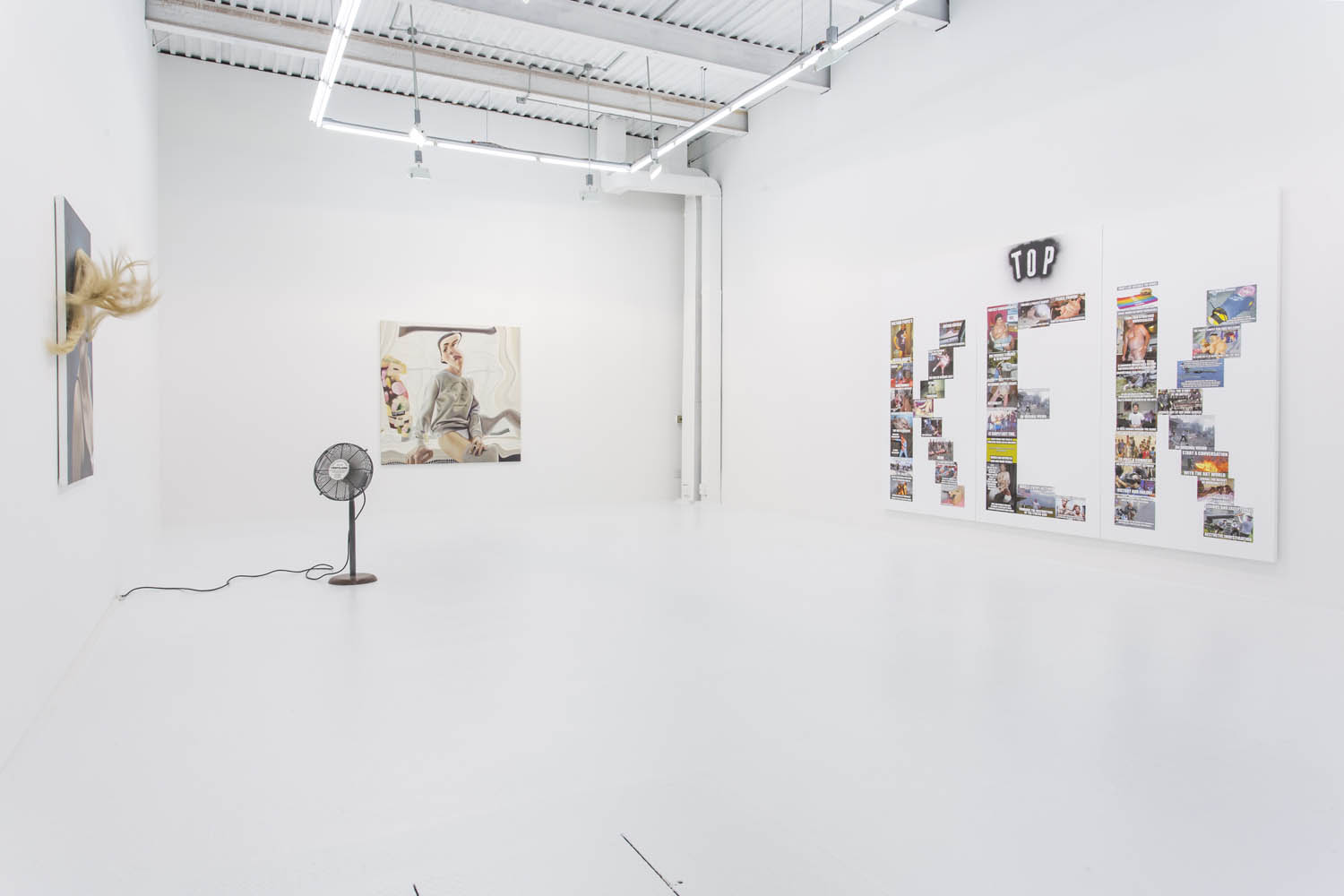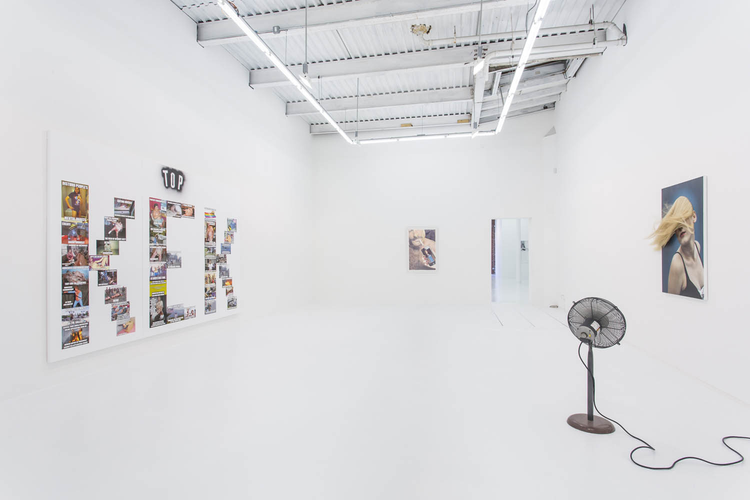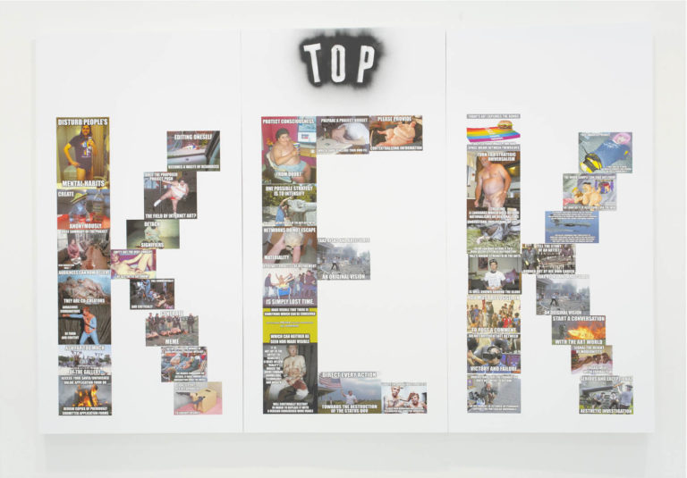 Other works in the show are about digital photography as a genre and what people like to use it for. In Mark Flood’s debased TOP KEK piece, revolting memes are collected and printed on canvas where the text has been changed to a series of equally disgusting instructions on how to be a successful artist. The way a photo is used in a meme as a suggestible blank is here corrupted to expose the corruption of today’s artistic careerism. Ryder Ripps exhibits a painting from a series of works about a particularly awful Instagram account of a self-help fitness model where he digitally manipulates her selfies and renders them in paint. These distortions evoke early experiments in warping emulsion photography from the 1930s, while being about the particularly contemporary kind of mise en abyme of getting lost in the horrors of Instagram, a hall of mirrors made of selfies.