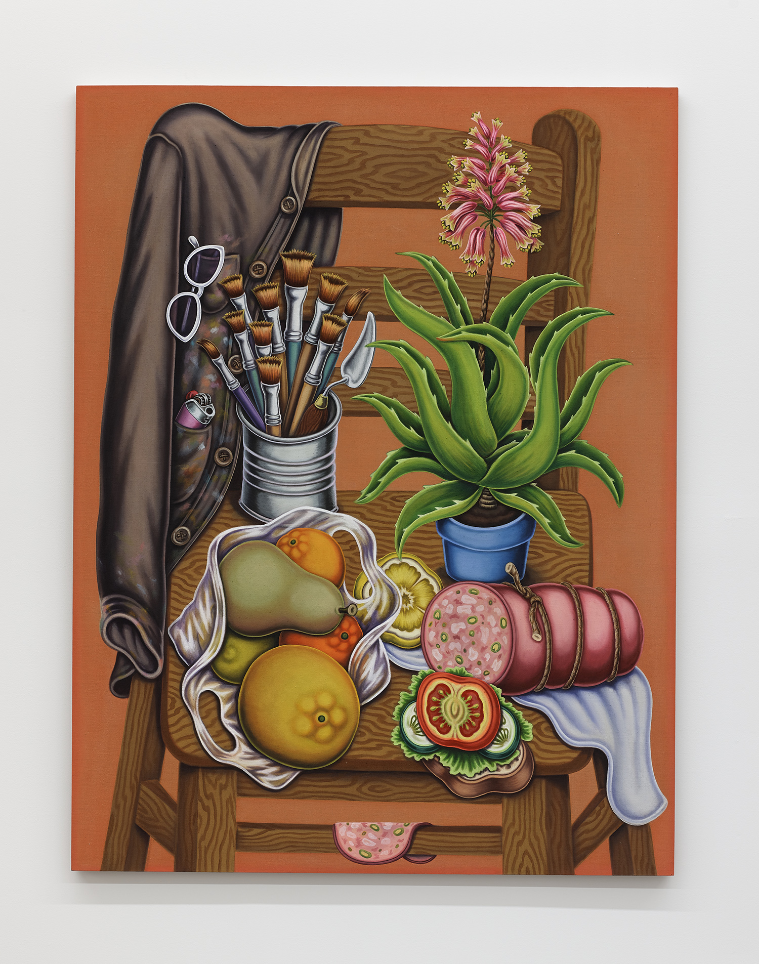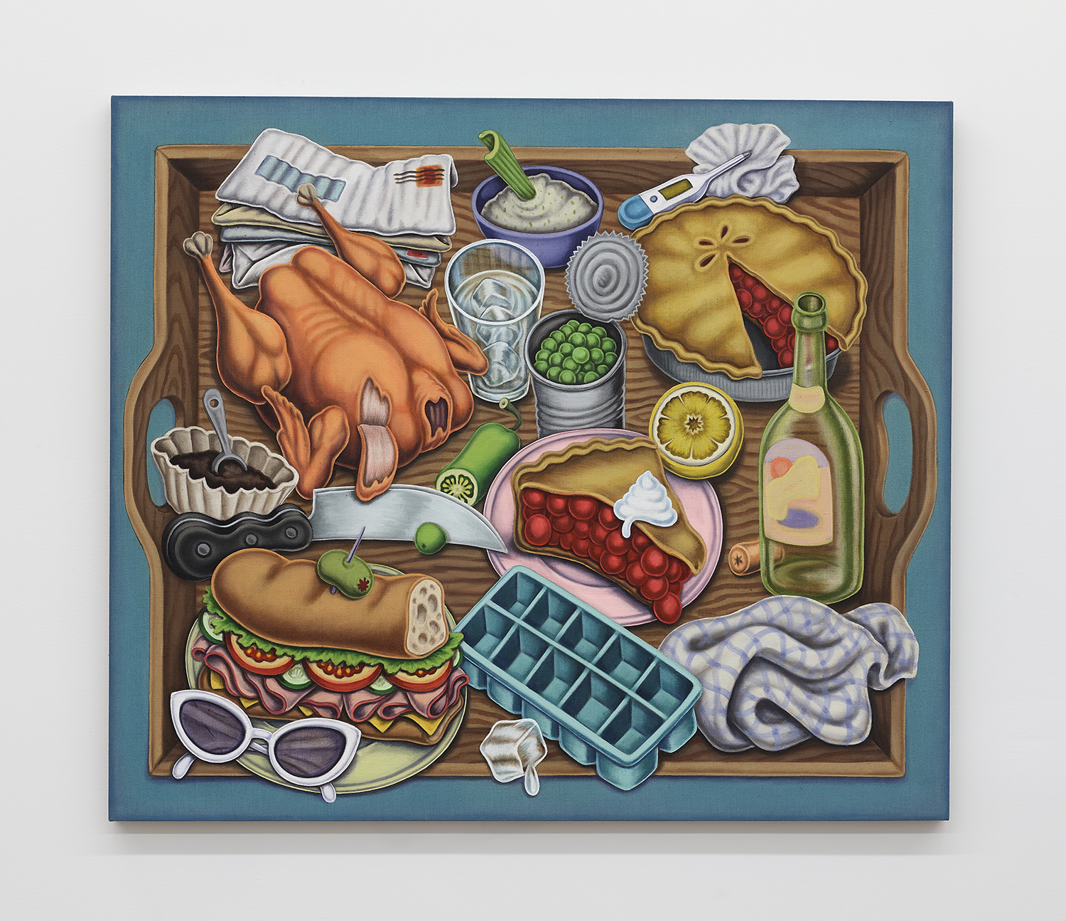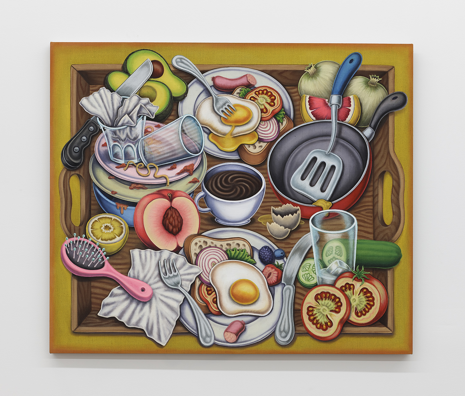 Of course, with Pedro there is always a bit of “agro” in the “dolce”: most melons are stabbed through with knives, his rotisserie chicken is extra carcass-like: a thermometer and Kleenex grace the breakfast try, while a hairbrush next to a lone spaghetti noodle looks extra disturbing. Cigarettes, oxycodone and nail clippers surround his salad, and what is more poignant than the one sad flap of bologna dangling from the lower rung of his chair? The artist has said these works show the continuity of virtues and vices: the sweet is not so sweet without the sour.