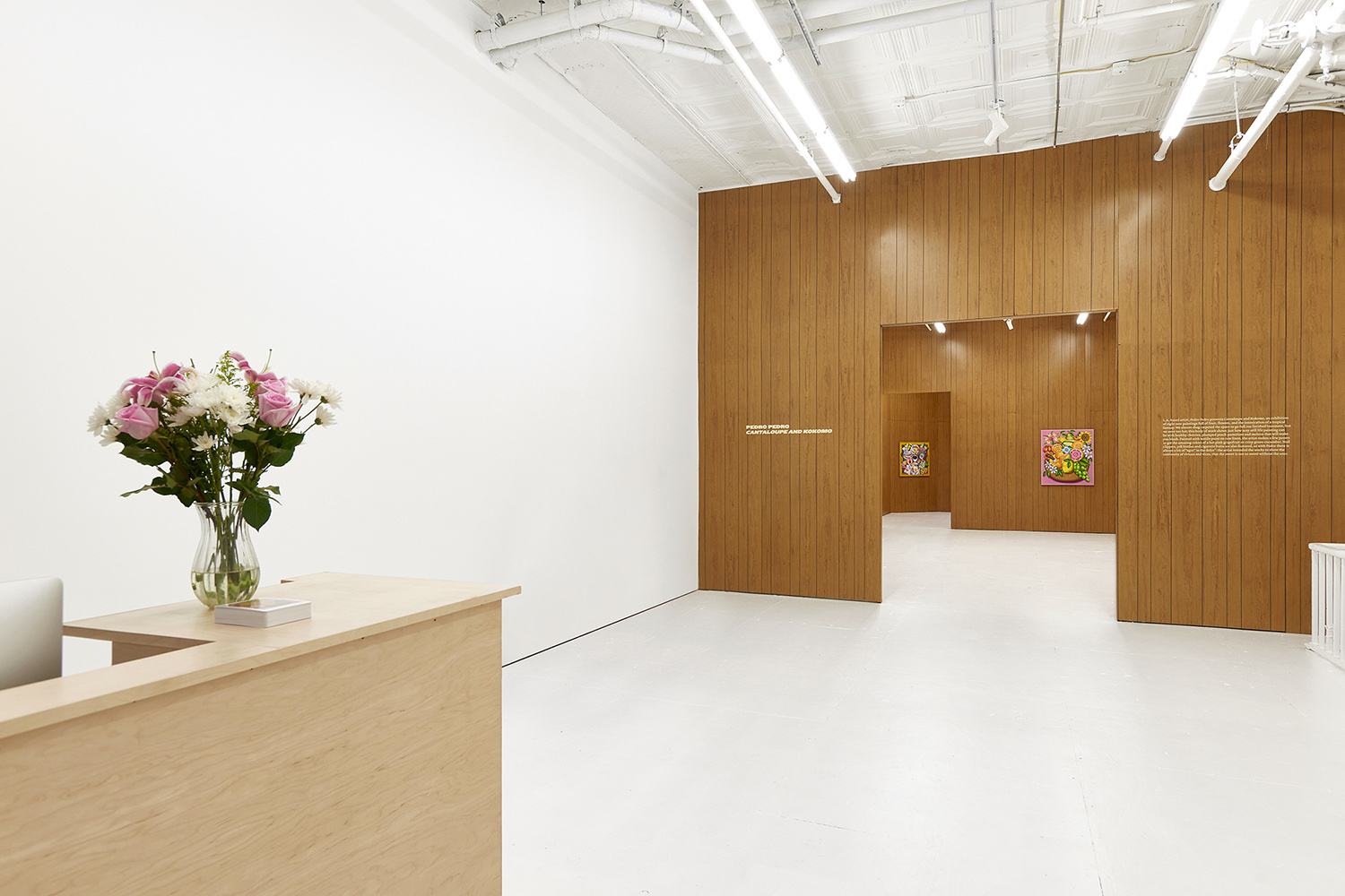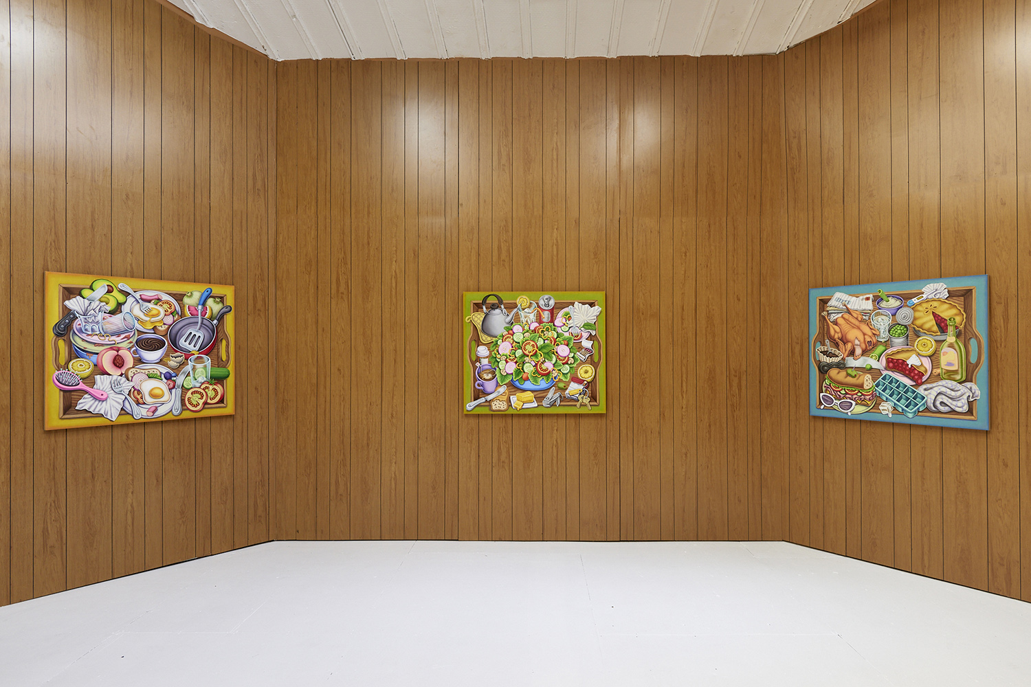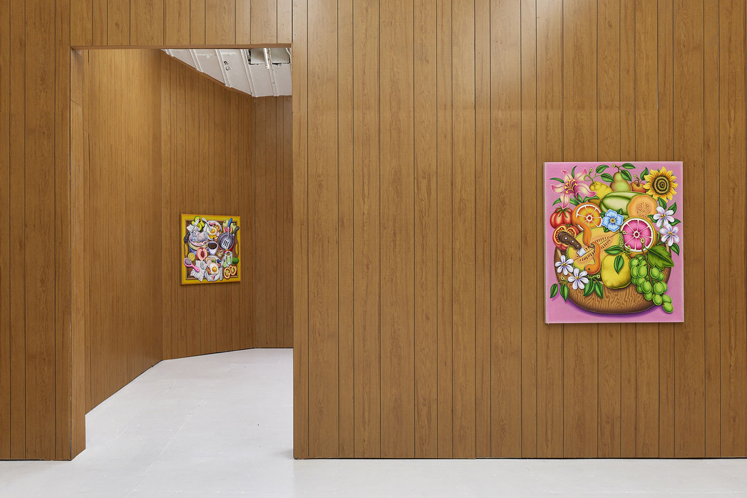 On the faux-wood-paneled walls of the gallery, seven of these eight compositions feature wood grain; breakfast trays, bowls, tables and chairs are covered with the squiggly pattern of Pedro-painted wood. We almost shag carpeted the space to go full 70s finished basement, but we were too hot. The vintage vibe in the works is highlighted as these brand-new pieces def have a broken-in vibe: their muted tonality and soft focus comes from Pedro’s technique of applying textile paint onto unprimed linen. Instead of the paint sitting on top of the gessoed fabric these works have the pigment soak into the fibers, dyeing them. The artist paints the image in a few passes to get these gorgeous colors; from hot pink grapefruit to spring pea green, cherry pie red to bright lemon yellow.