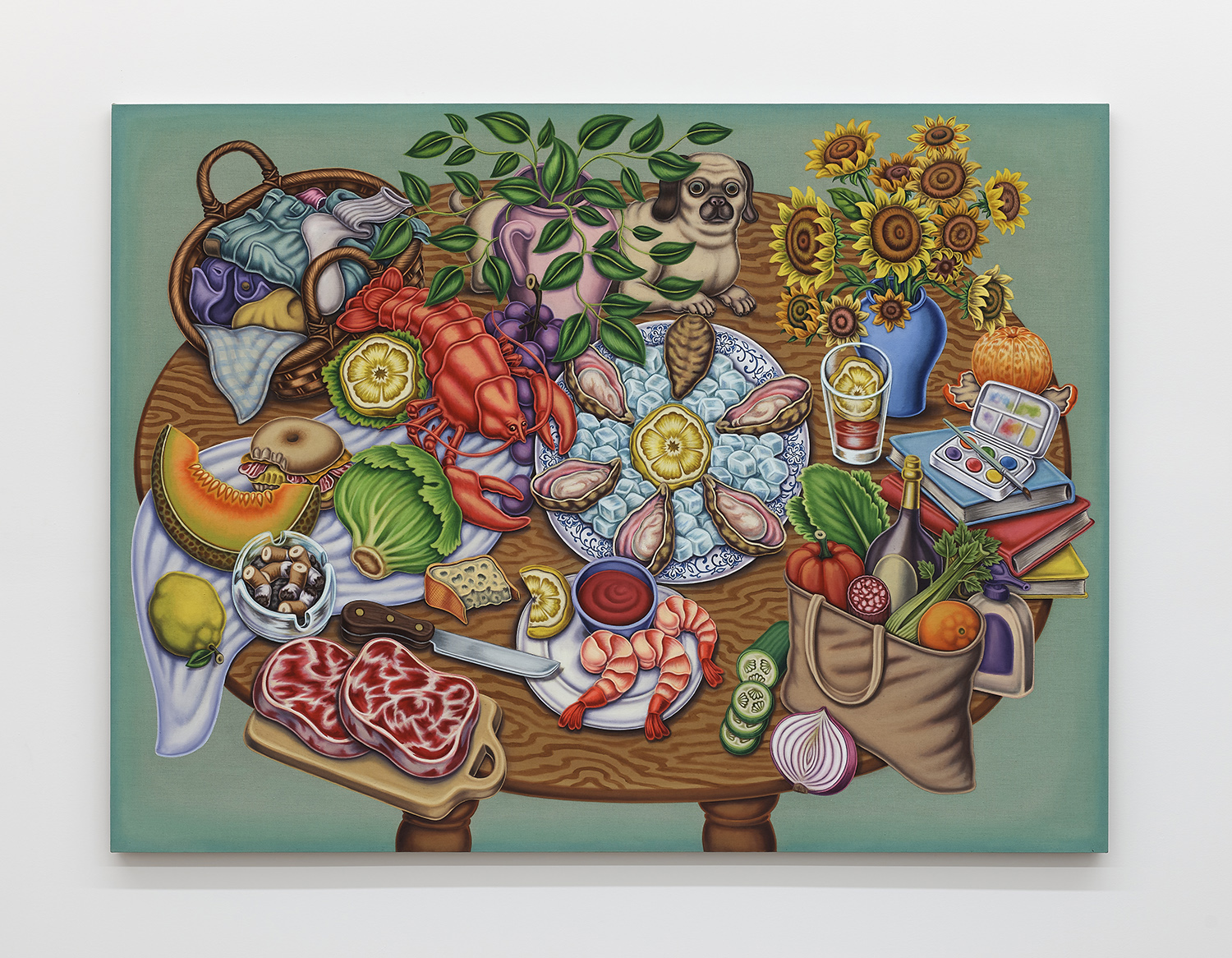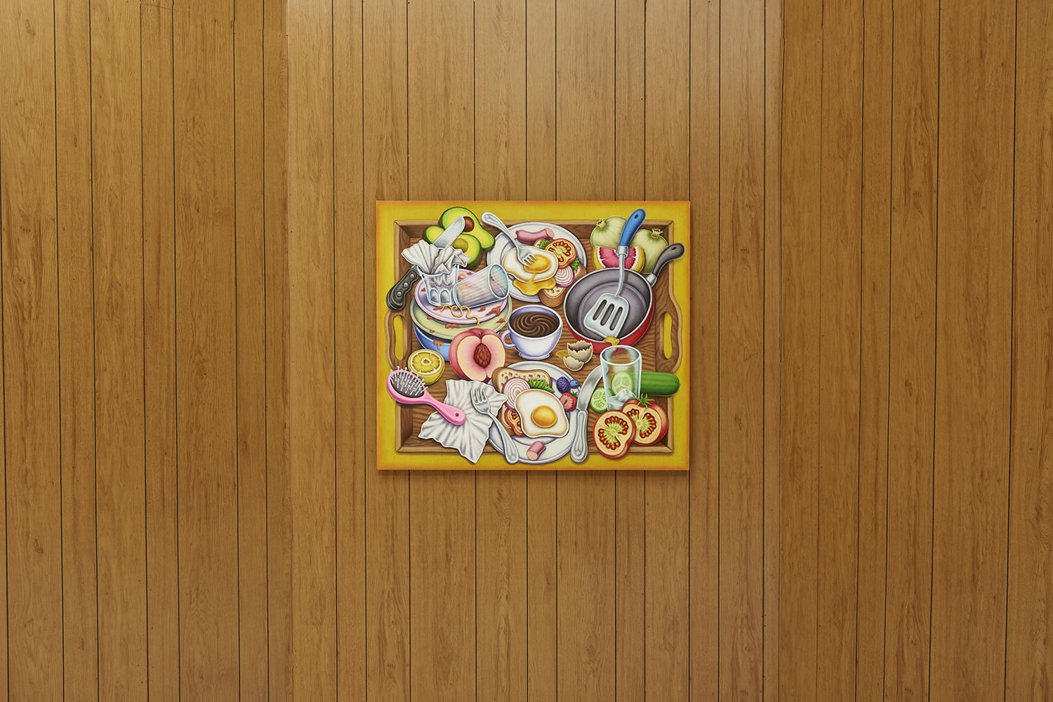 Los Angeles-based artist Pedro Pedro (b. 1986) specializes in capturing the playful anxiety of our everyday milieu. His still life paintings include fruit bowls, lavish spreads of food or clothes chaotically strewn about. In Pedro’s painted universe, wholesomeness coexists with disquiet tension, underscored by the artist’s skewed perspective and flat planes upon which all objects look ready to fall off the canvas. Most important to Pedro’s practice is his intuition: drafted from a collage of images, his scenes come together as he goes along, allowing his inner thoughts to shine through while also leaving space for our own.