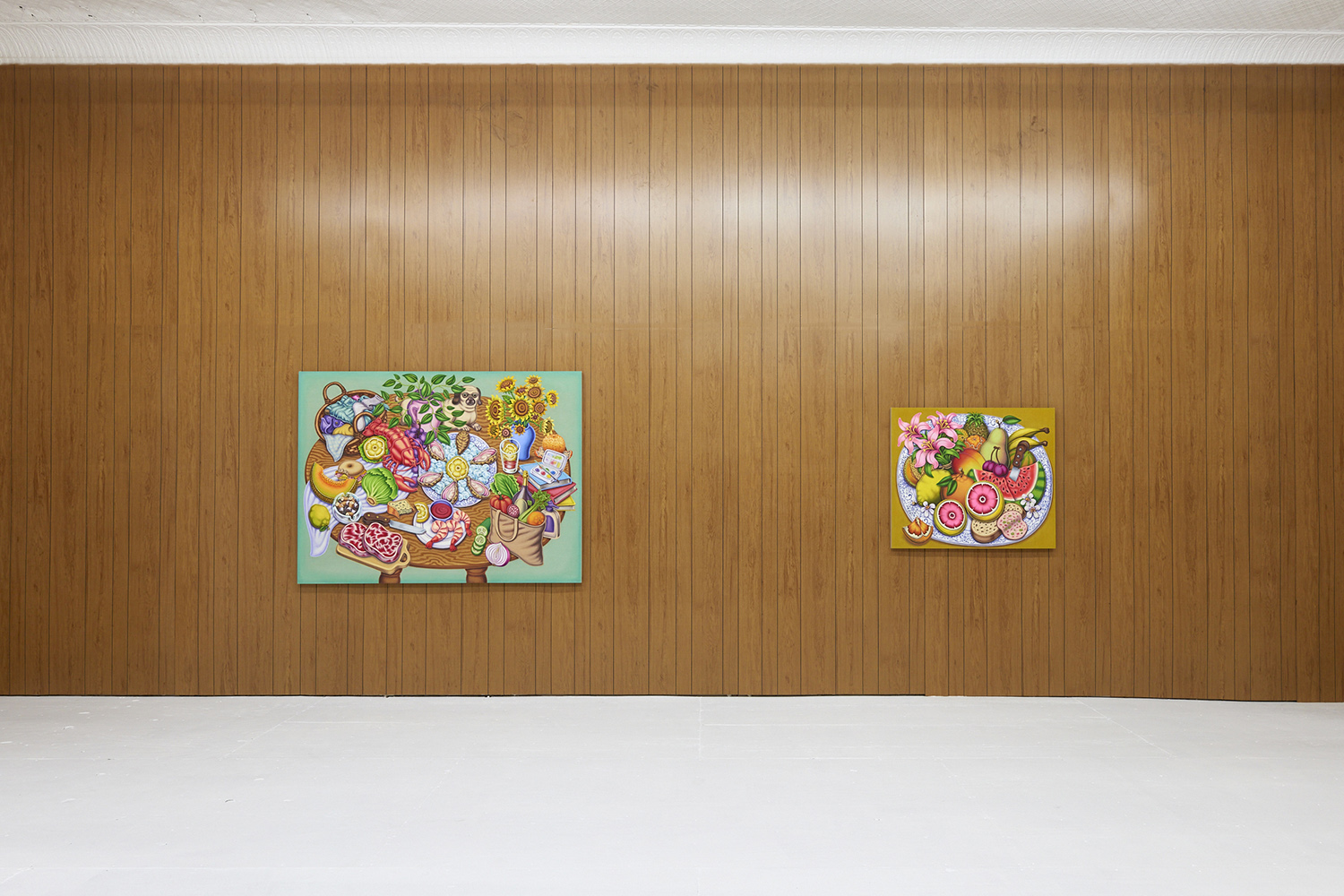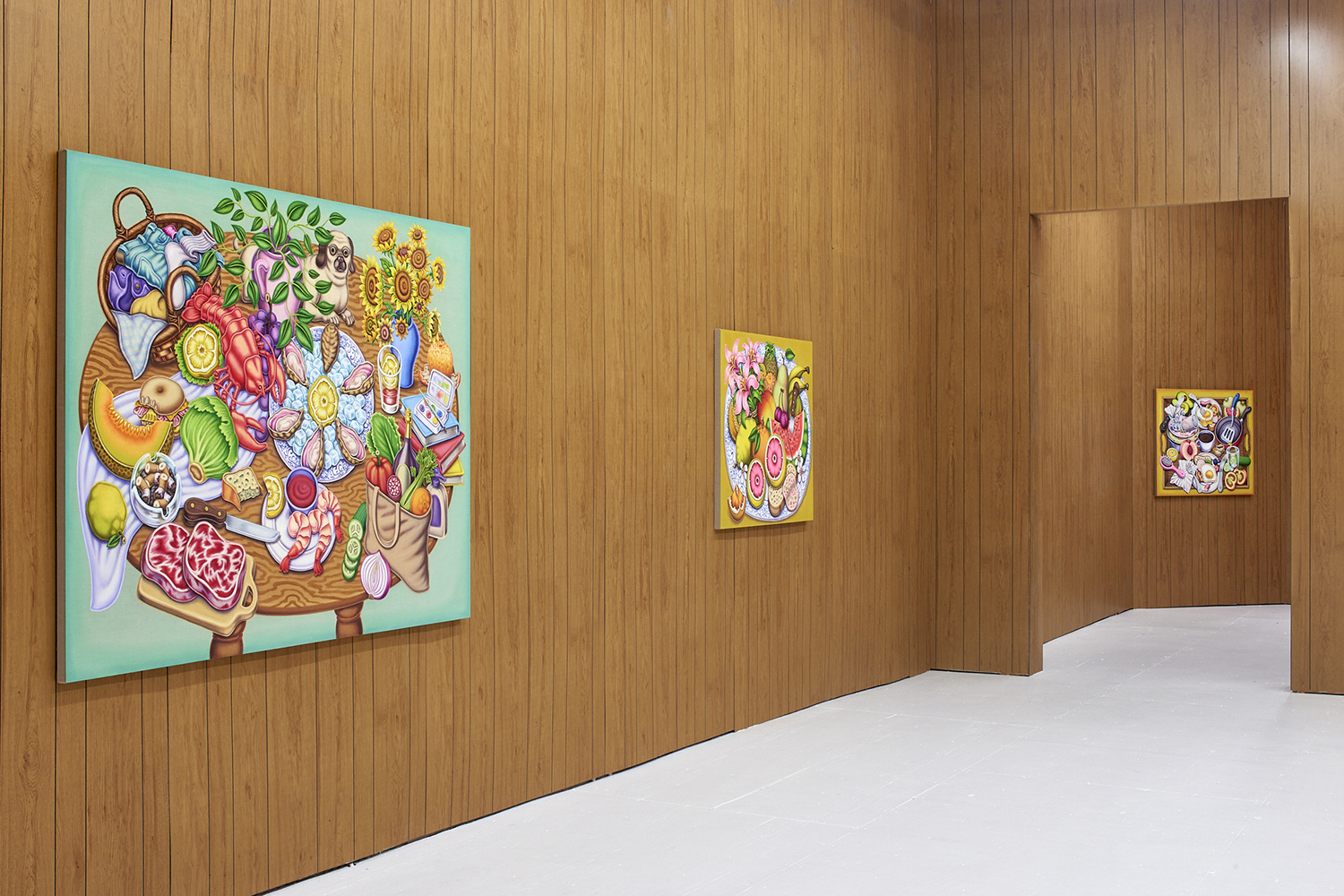 Speaking of hot, this body of work shows just how sexy still life painting can be. The works have healthy cherries and peach posteriors with melons that will make you blush. A tied-up hog of lunch meat and the puffed pink buttholes of his grapefruit halves are not shy. A drop of whipped cream, a dripping ice cube, a slippery egg yolk—there’s literally a bottle of lotion on the lunch table: everything is engorged and there are emollients everywhere.