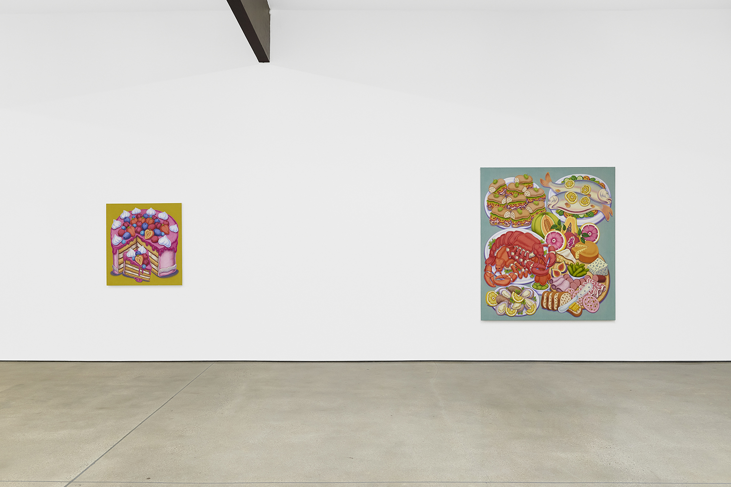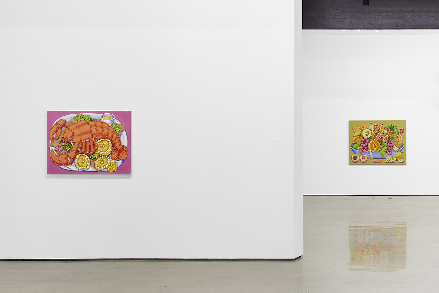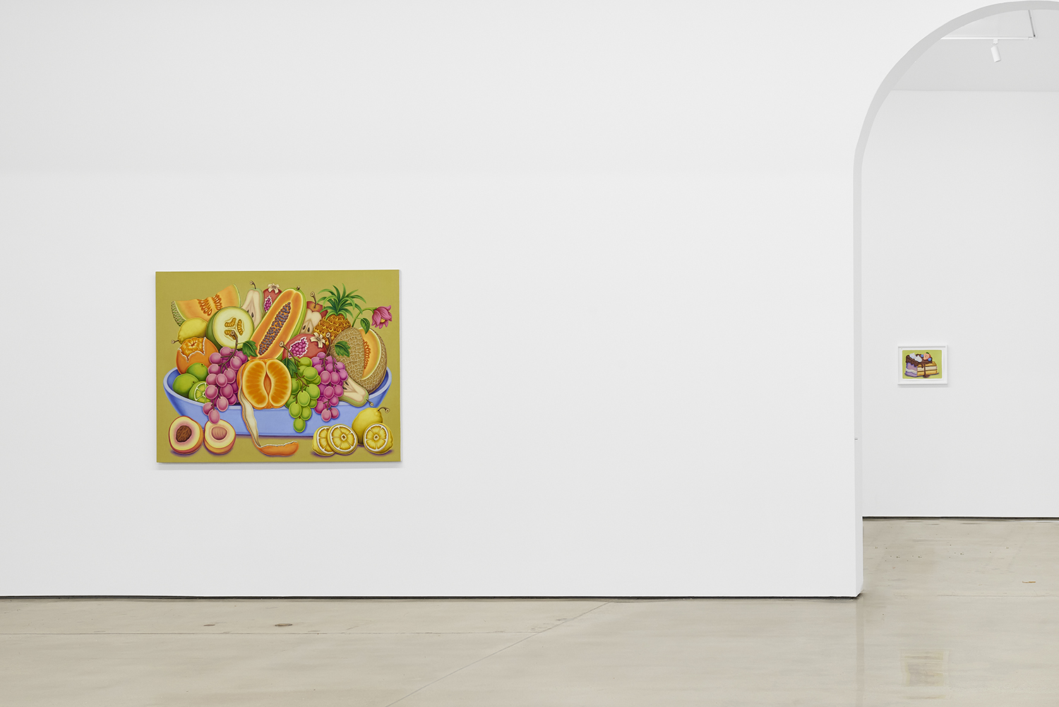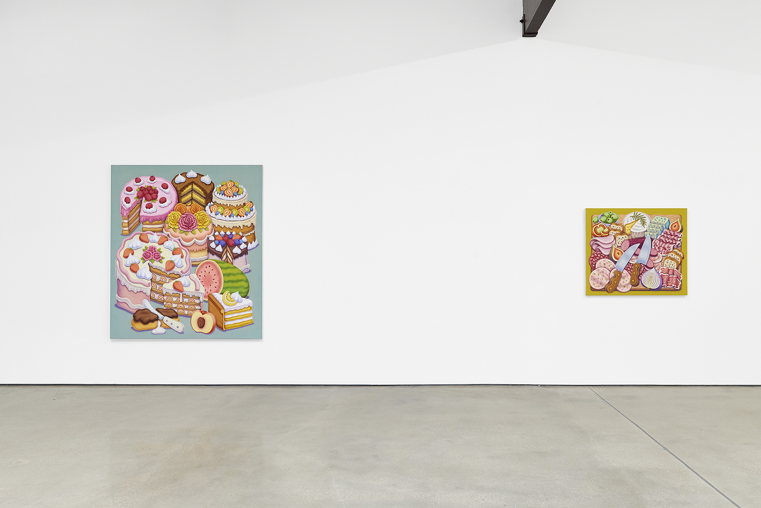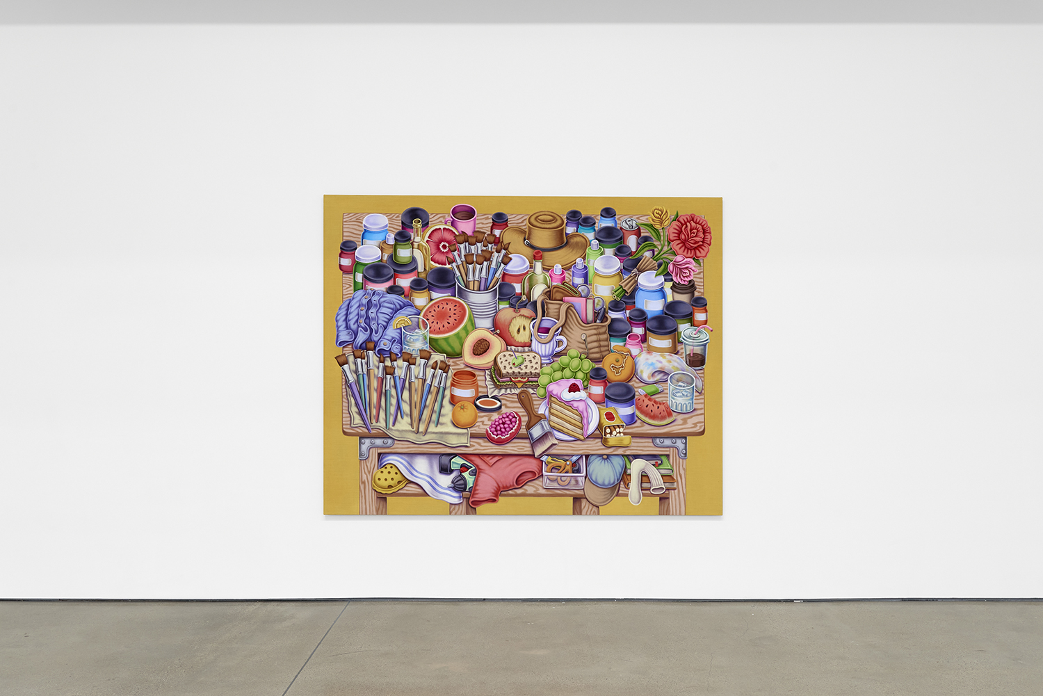 For his third solo show with The Hole, LA-based artist Pedro Pedro (b. 1986) includes a variety of his signature imagery, creating indulgent and delicious paintings awaiting consumption. While the paintings are bountiful—charcuterie and cheese, stacks of seafood, soft and sugary cakes, citrus stacked to the ceiling—there is a lingering restraint, with just a slice or two taken from each. Where are the people to feast on the fruit, scarf the seafood, smoke the strewn cigarettes or to paint with the plentiful pots of paint on Pedro’s tables?