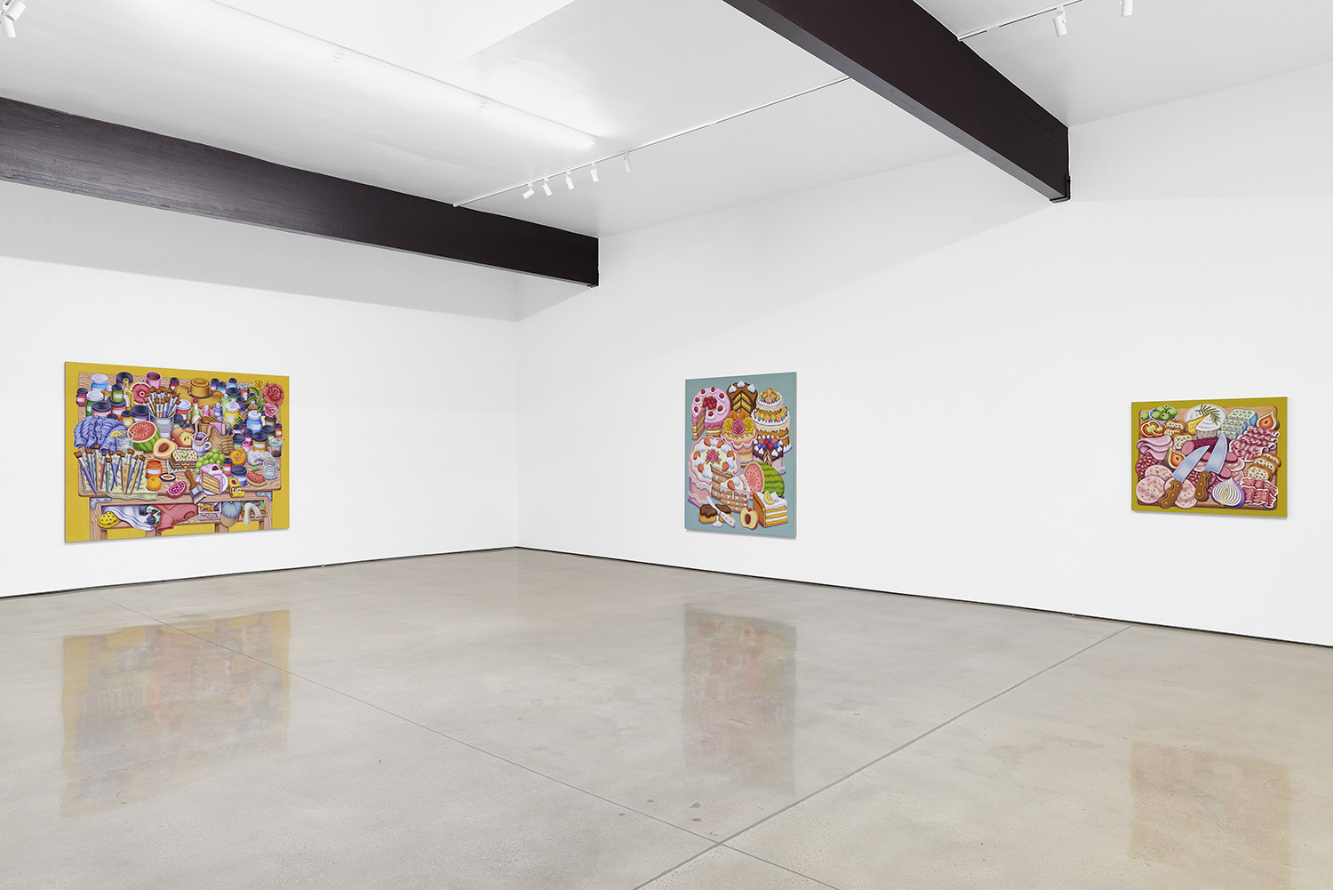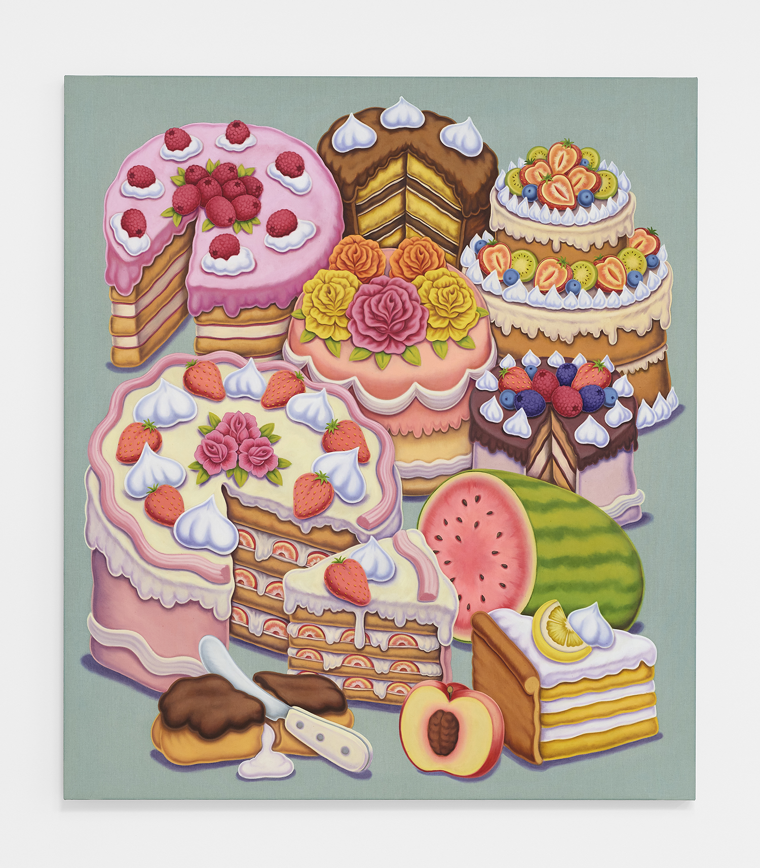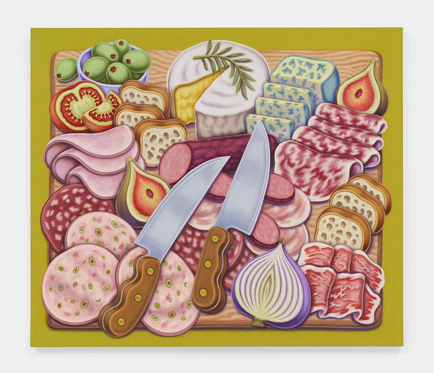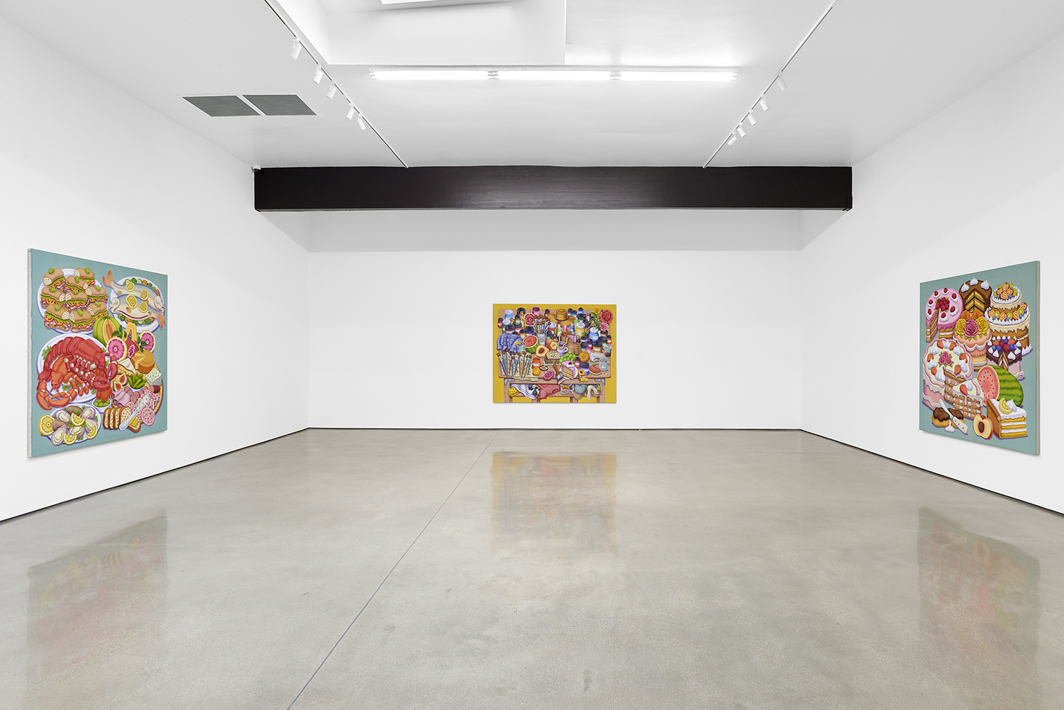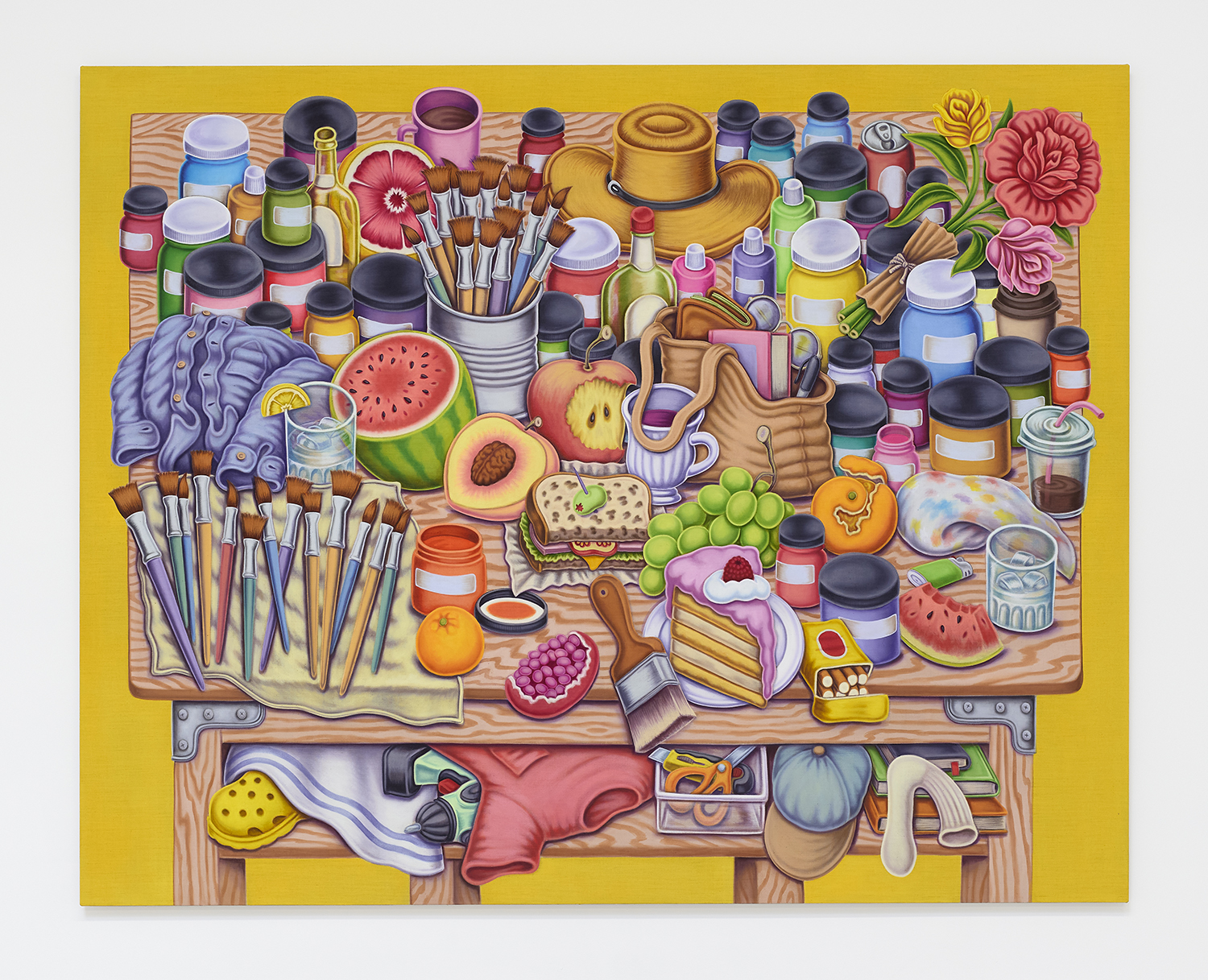 For his third solo show with The Hole, LA-based artist Pedro Pedro (b. 1986) includes a variety of his signature imagery, creating indulgent and delicious paintings awaiting consumption. While the paintings are bountiful—charcuterie and cheese, stacks of seafood, soft and sugary cakes, citrus stacked to the ceiling—there is a lingering restraint, with just a slice or two taken from each. Where are the people to feast on the fruit, scarf the seafood, smoke the strewn cigarettes or to paint with the plentiful pots of paint on Pedro’s tables?