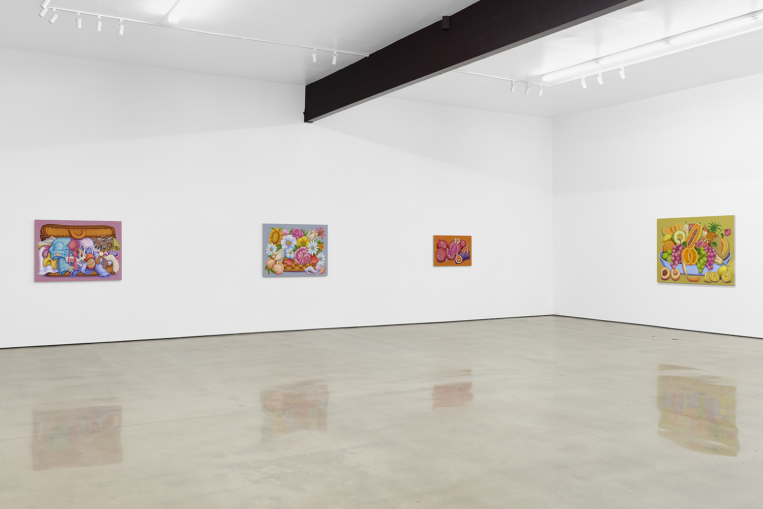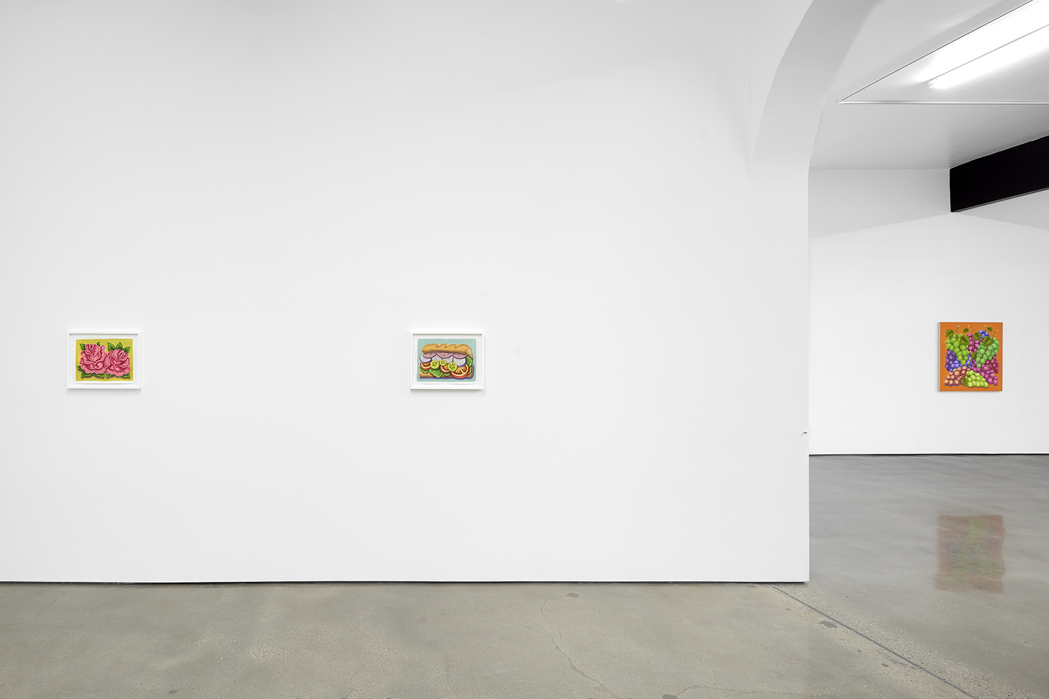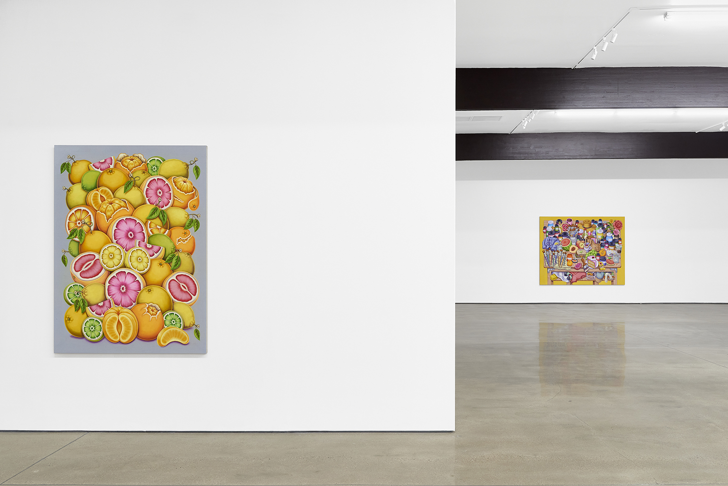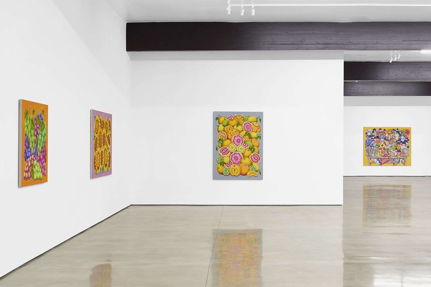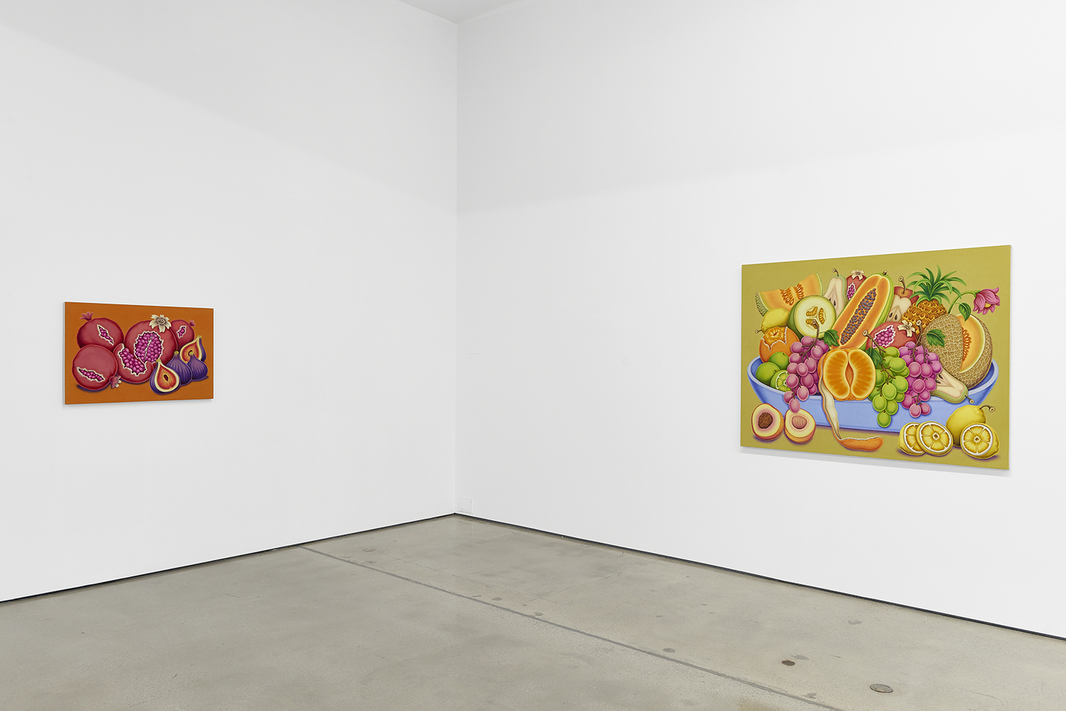For his third solo show with The Hole, LA-based artist Pedro Pedro (b. 1986) includes a variety of his signature imagery, creating indulgent and delicious paintings awaiting consumption. While the paintings are bountiful—charcuterie and cheese, stacks of seafood, soft and sugary cakes, citrus stacked to the ceiling—there is a lingering restraint, with just a slice or two taken from each. Where are the people to feast on the fruit, scarf the seafood, smoke the strewn cigarettes or to paint with the plentiful pots of paint on Pedro’s tables?