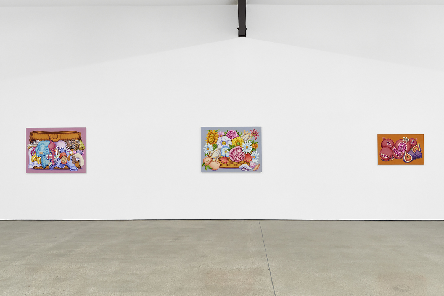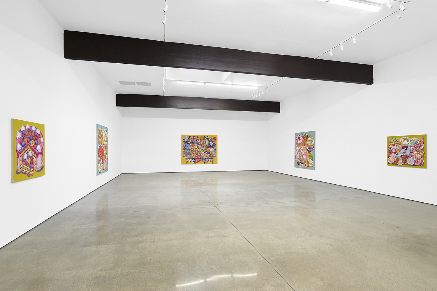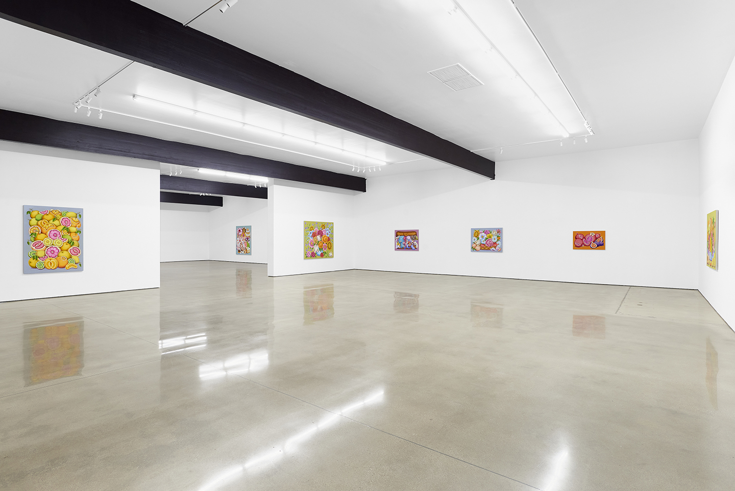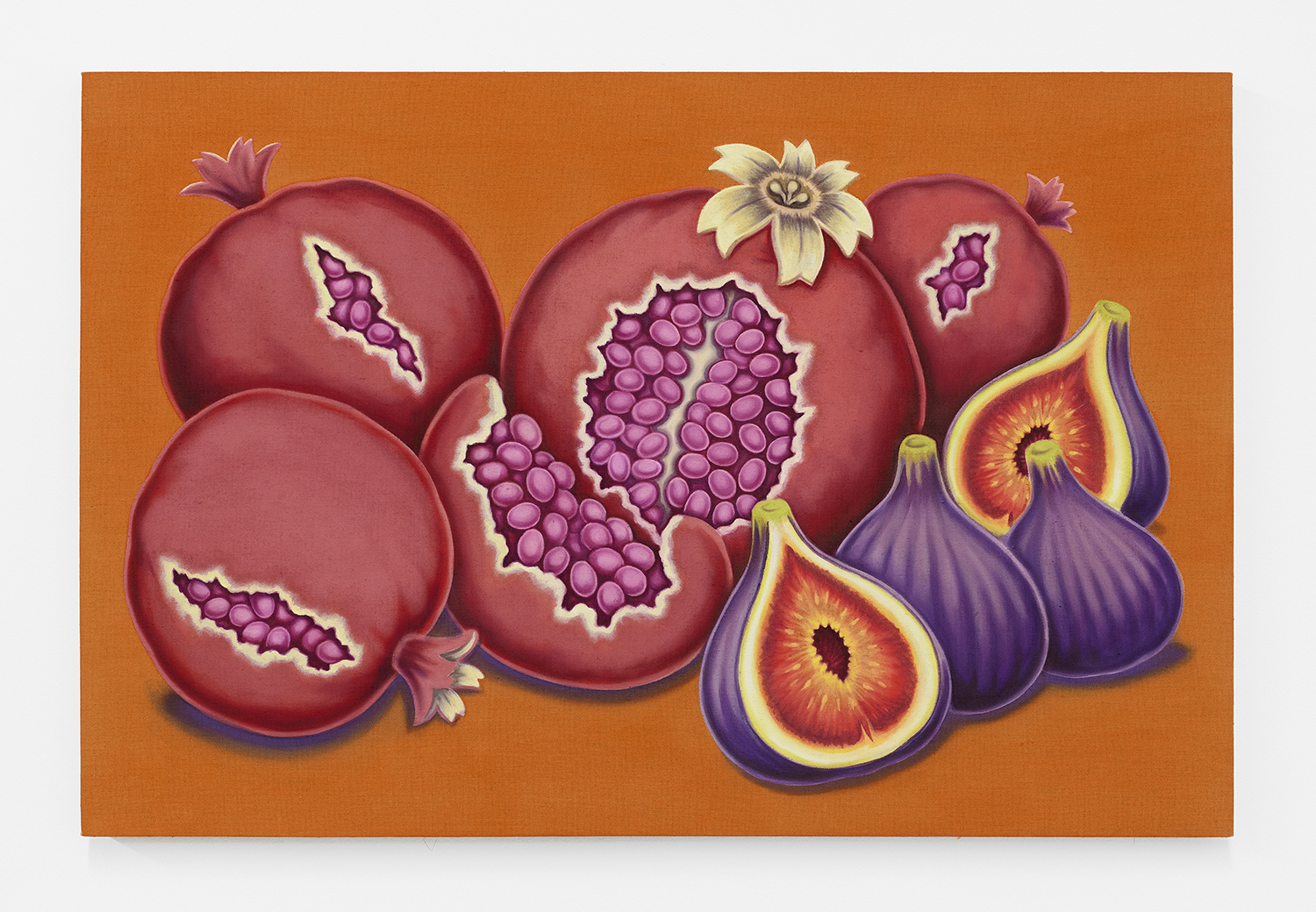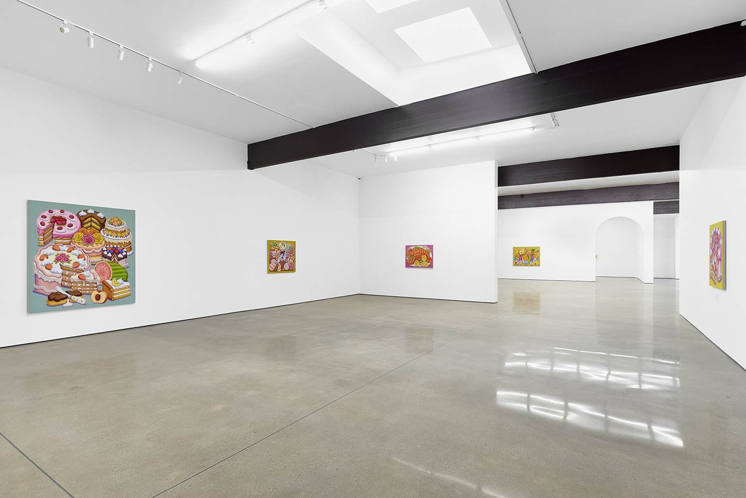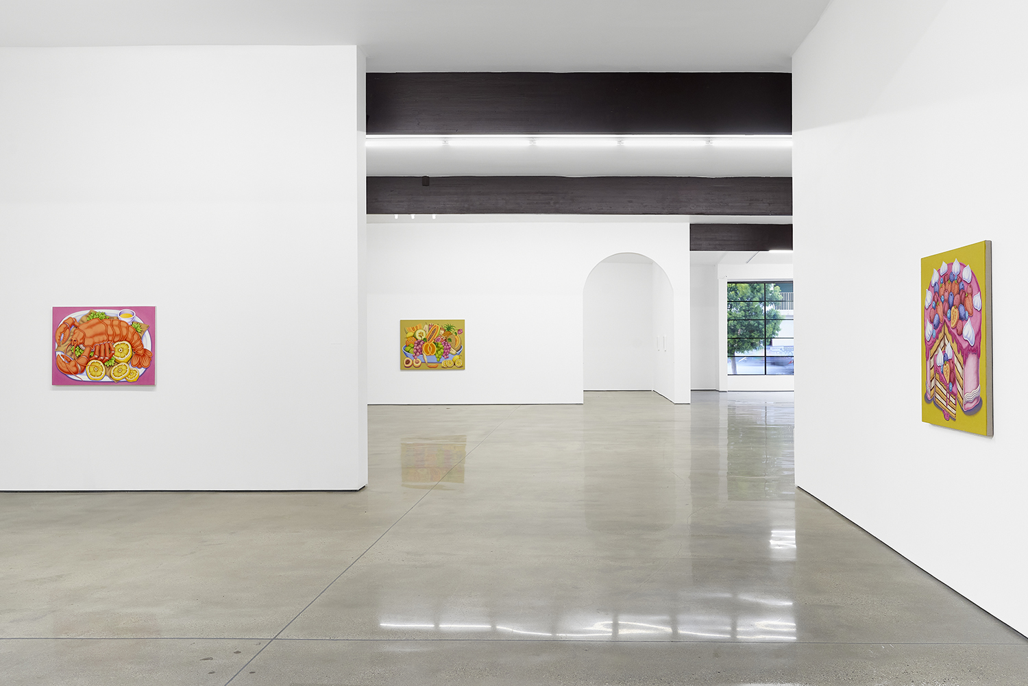 For his third solo show with The Hole, LA-based artist Pedro Pedro (b. 1986) includes a variety of his signature imagery, creating indulgent and delicious paintings awaiting consumption. While the paintings are bountiful—charcuterie and cheese, stacks of seafood, soft and sugary cakes, citrus stacked to the ceiling—there is a lingering restraint, with just a slice or two taken from each. Where are the people to feast on the fruit, scarf the seafood, smoke the strewn cigarettes or to paint with the plentiful pots of paint on Pedro’s tables?