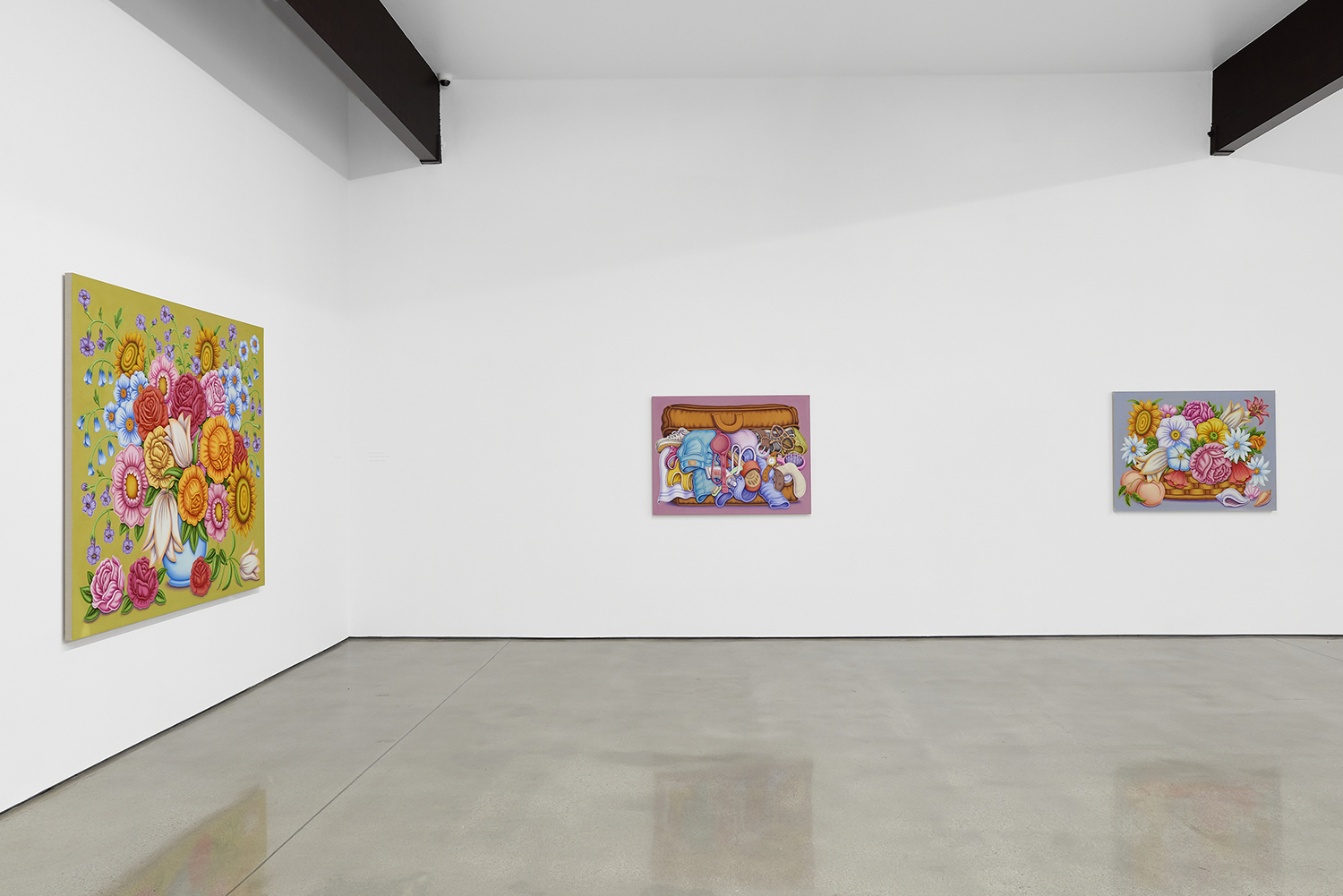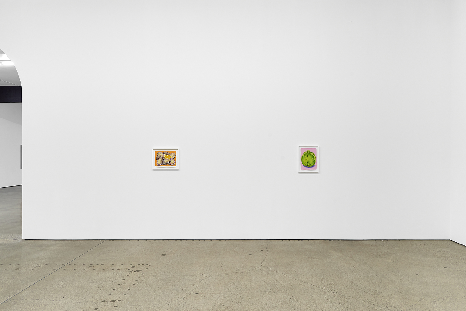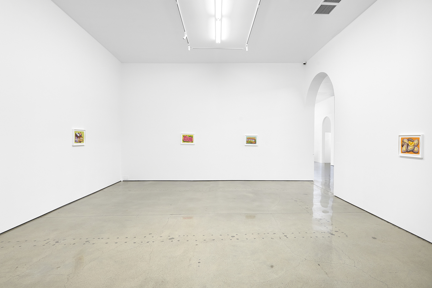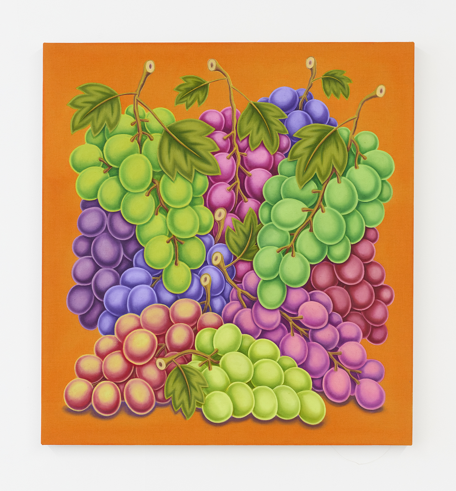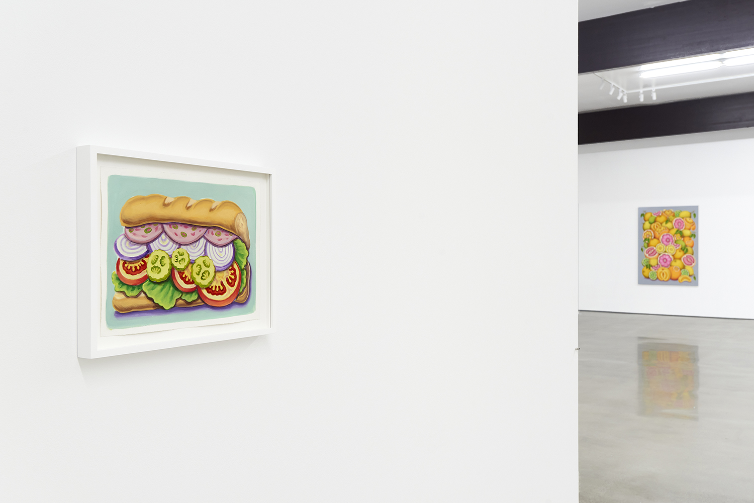 For his third solo show with The Hole, LA-based artist Pedro Pedro (b. 1986) includes a variety of his signature imagery, creating indulgent and delicious paintings awaiting consumption. While the paintings are bountiful—charcuterie and cheese, stacks of seafood, soft and sugary cakes, citrus stacked to the ceiling—there is a lingering restraint, with just a slice or two taken from each. Where are the people to feast on the fruit, scarf the seafood, smoke the strewn cigarettes or to paint with the plentiful pots of paint on Pedro’s tables?