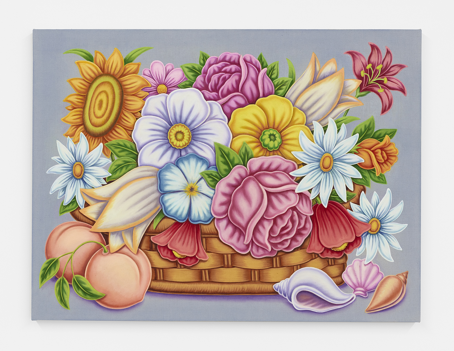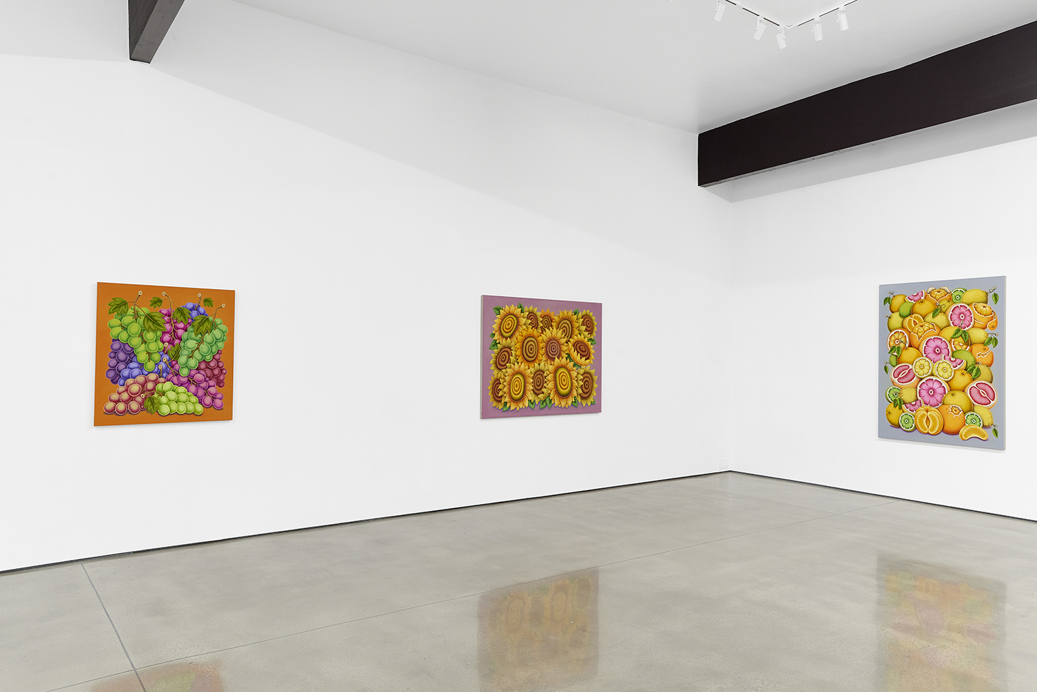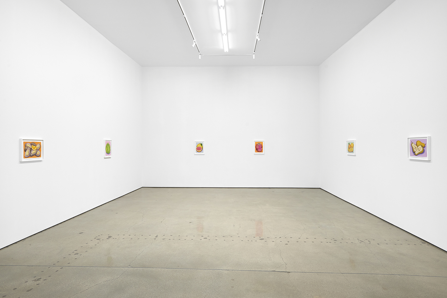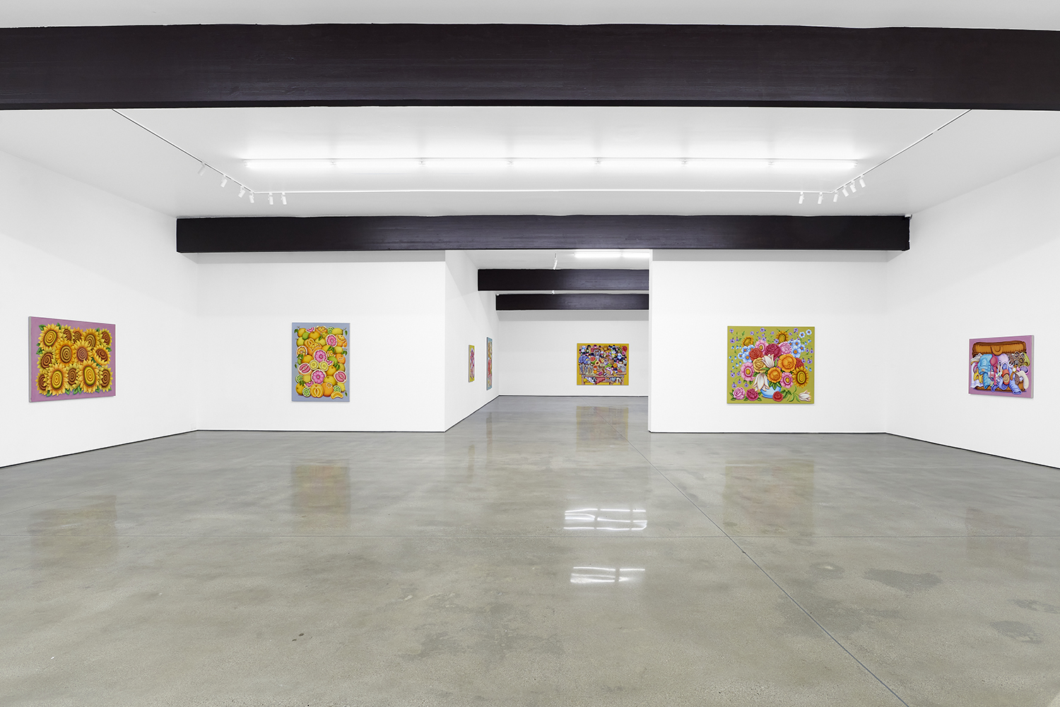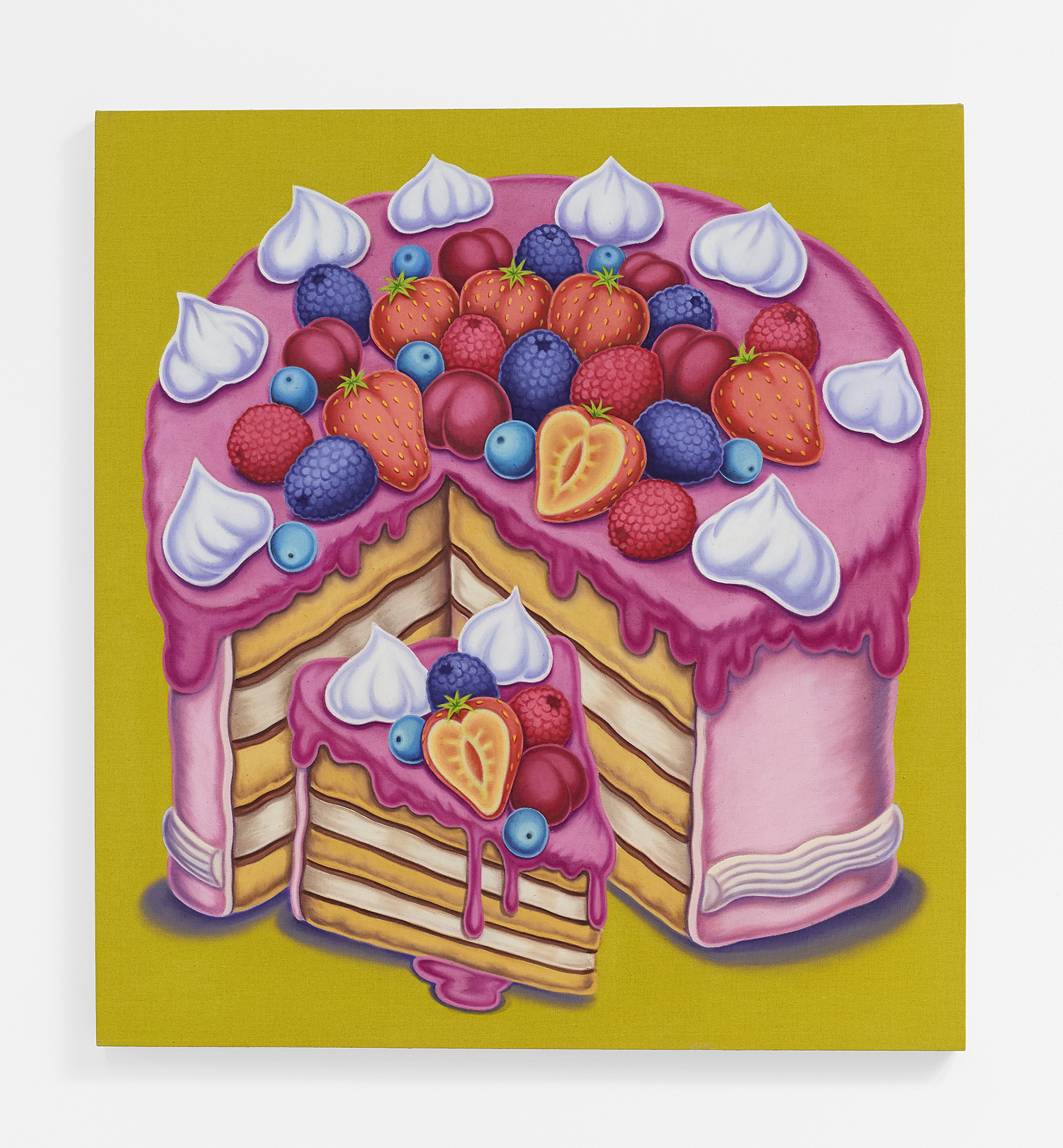 For his third solo show with The Hole, LA-based artist Pedro Pedro (b. 1986) includes a variety of his signature imagery, creating indulgent and delicious paintings awaiting consumption. While the paintings are bountiful—charcuterie and cheese, stacks of seafood, soft and sugary cakes, citrus stacked to the ceiling—there is a lingering restraint, with just a slice or two taken from each. Where are the people to feast on the fruit, scarf the seafood, smoke the strewn cigarettes or to paint with the plentiful pots of paint on Pedro’s tables?
