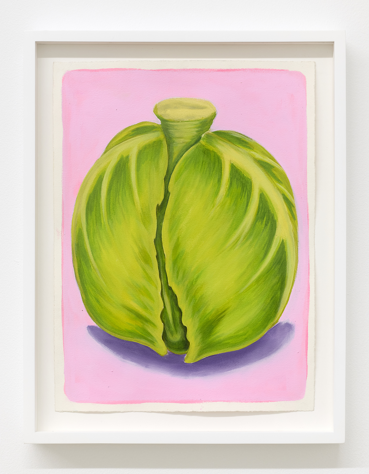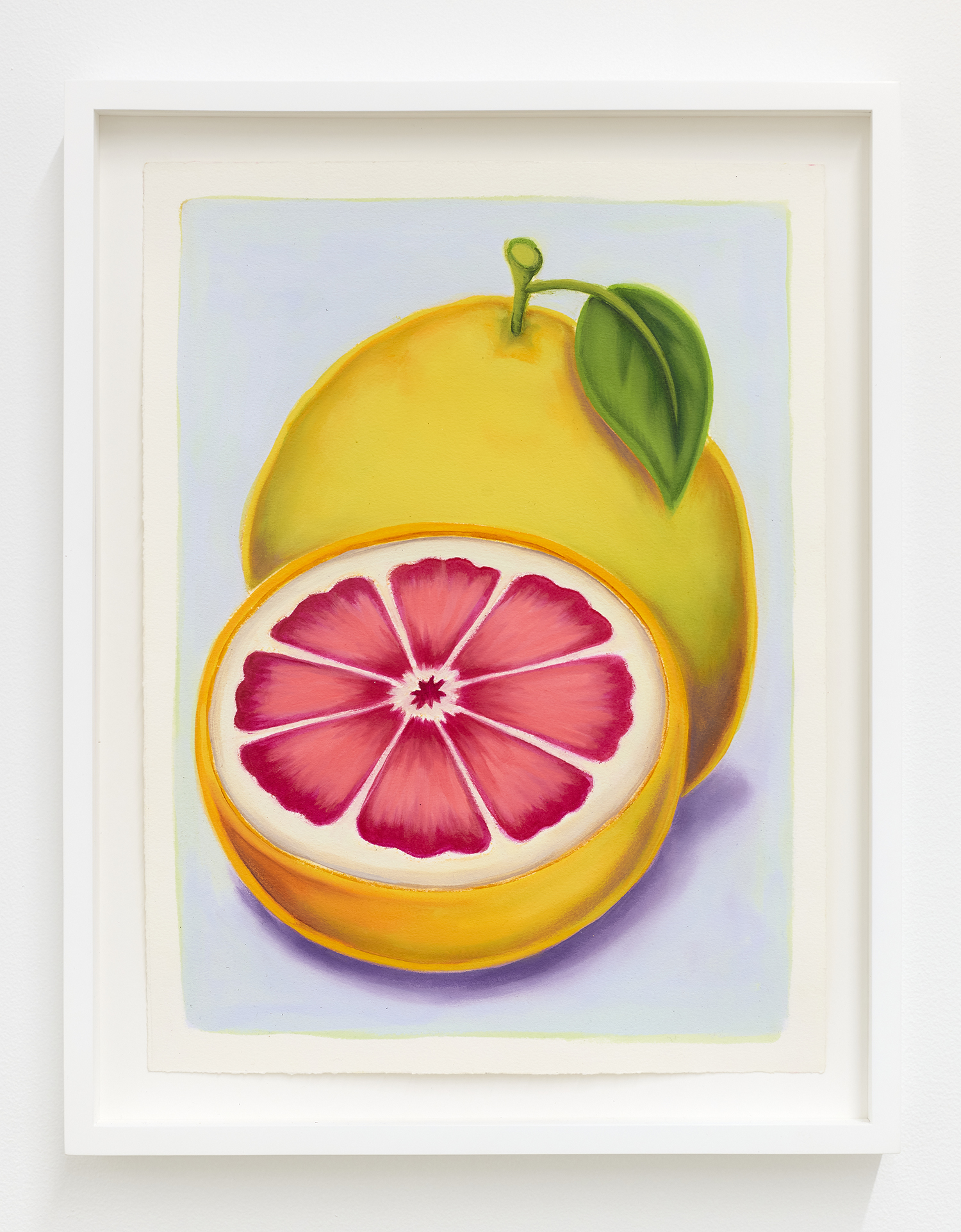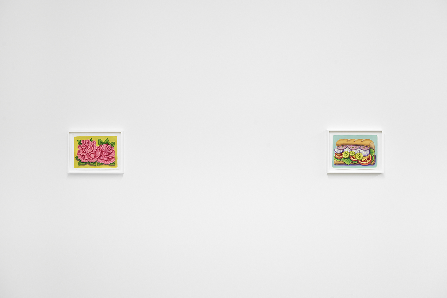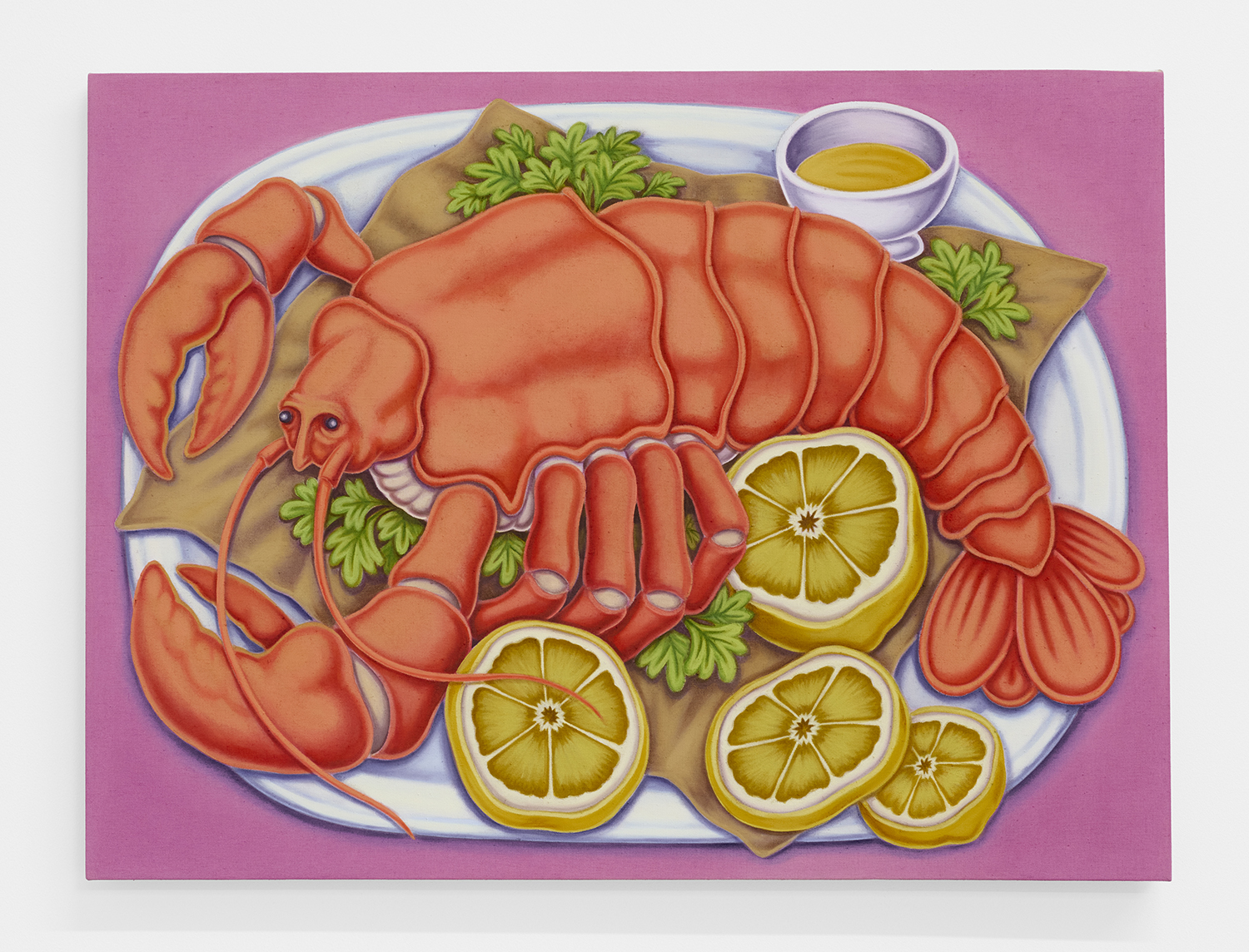 With fourteen paintings and nine paintings on paper, we are treated to an abbondanza of works, the most he has shown at one time. The paintings’ muted tonality and soft focus comes from Pedro’s technique of applying textile paint onto unprimed linen. Instead of the paint sitting on top of the white gessoed fabric, these works have the pigment soak into the fibers, dyeing them. The artist paints the image in multiple passes to get these gorgeous colors; from hot pink grapefruit to pea green pickles, deep red lobster or bright lemon yellow.