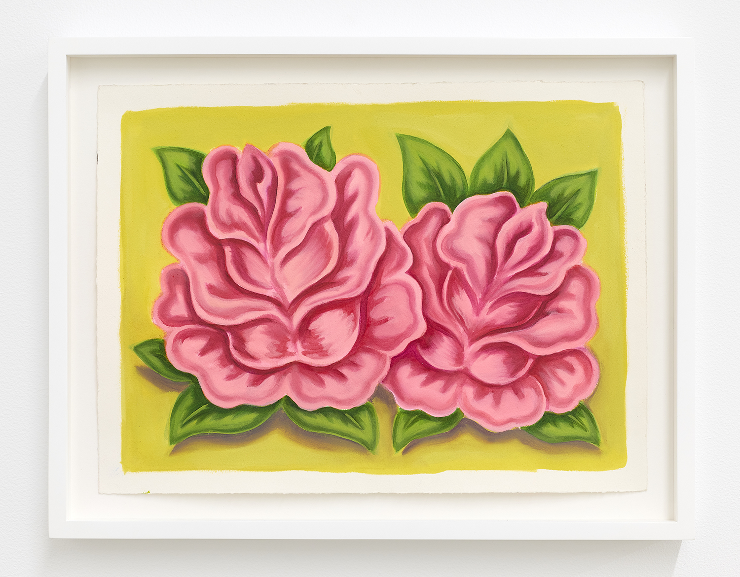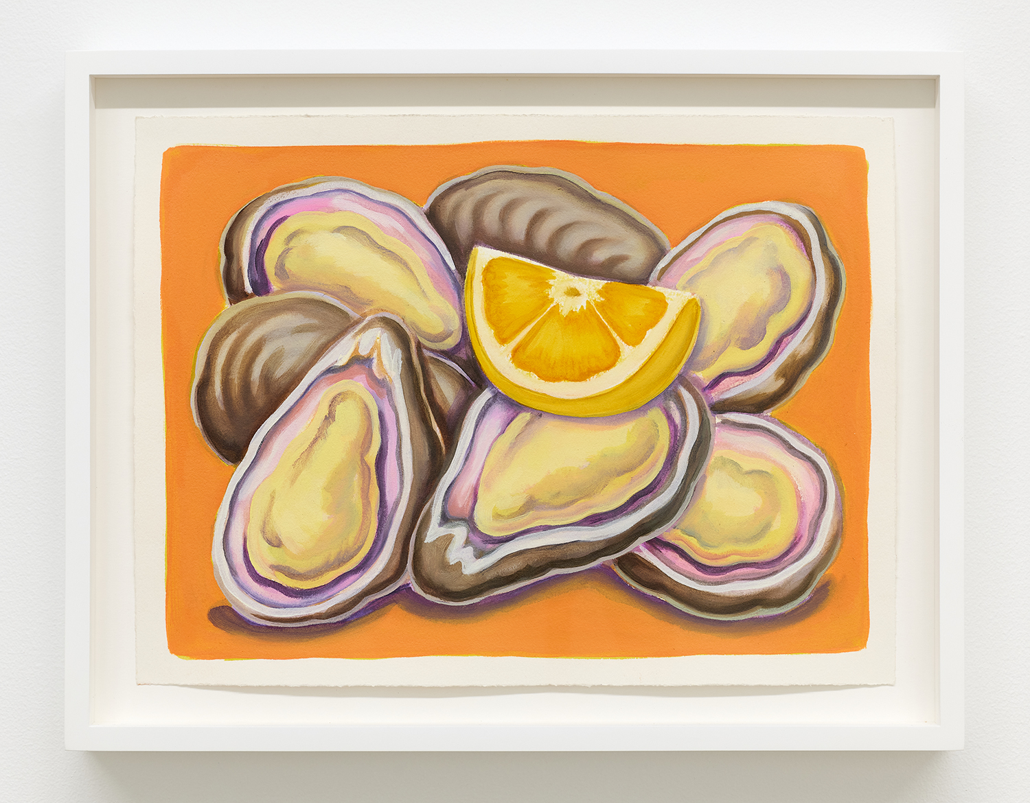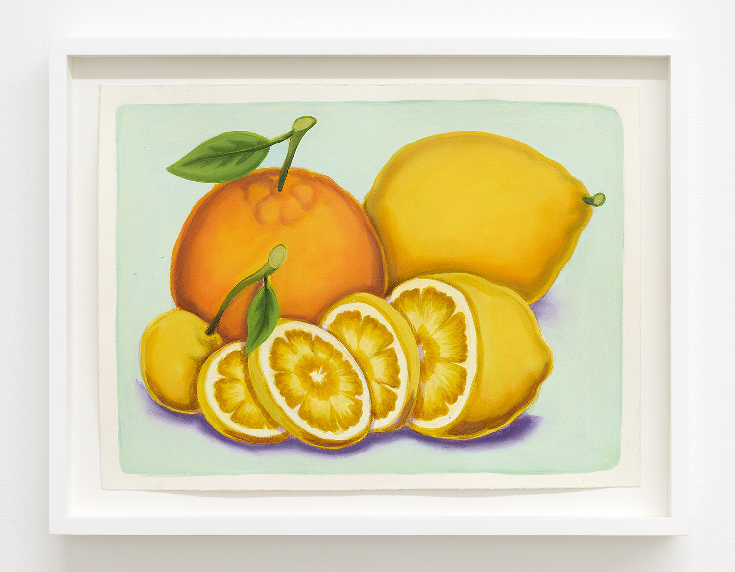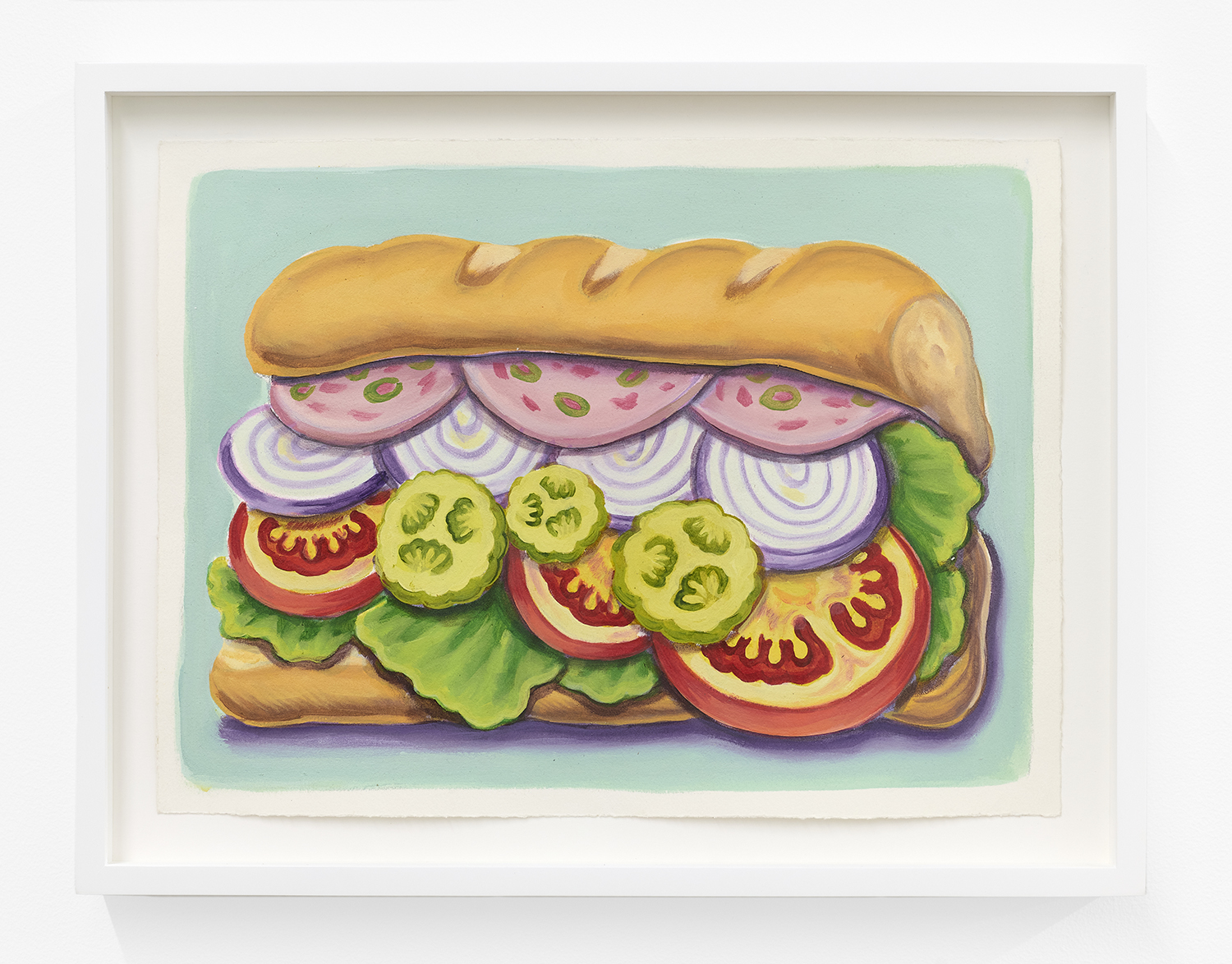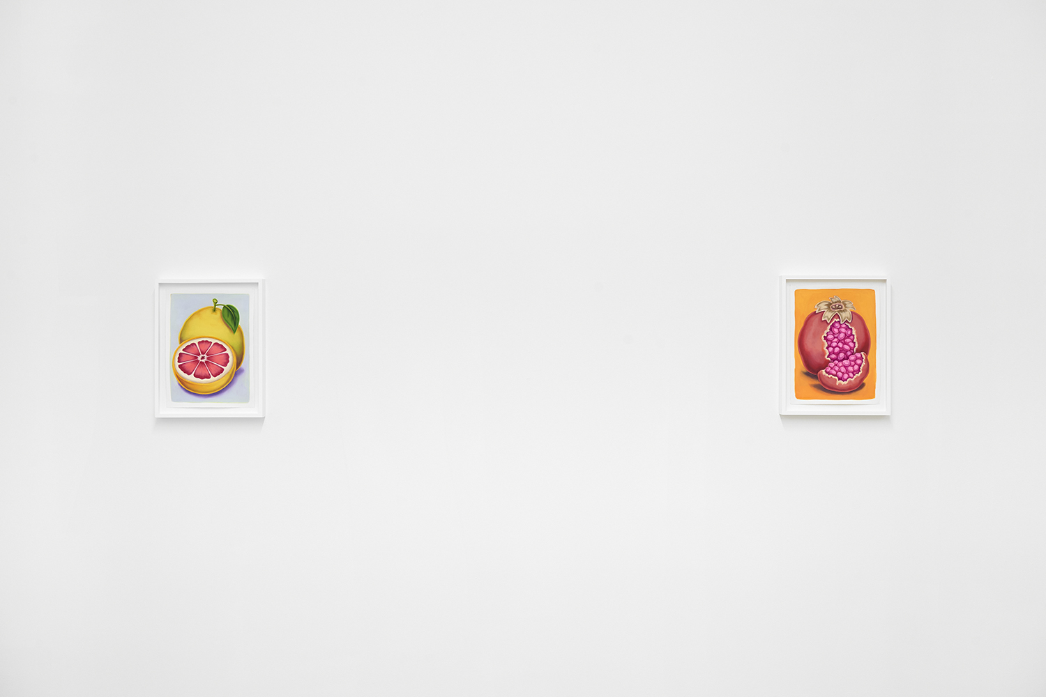 With fourteen paintings and nine paintings on paper, we are treated to an abbondanza of works, the most he has shown at one time. The paintings’ muted tonality and soft focus comes from Pedro’s technique of applying textile paint onto unprimed linen. Instead of the paint sitting on top of the white gessoed fabric, these works have the pigment soak into the fibers, dyeing them. The artist paints the image in multiple passes to get these gorgeous colors; from hot pink grapefruit to pea green pickles, deep red lobster or bright lemon yellow.