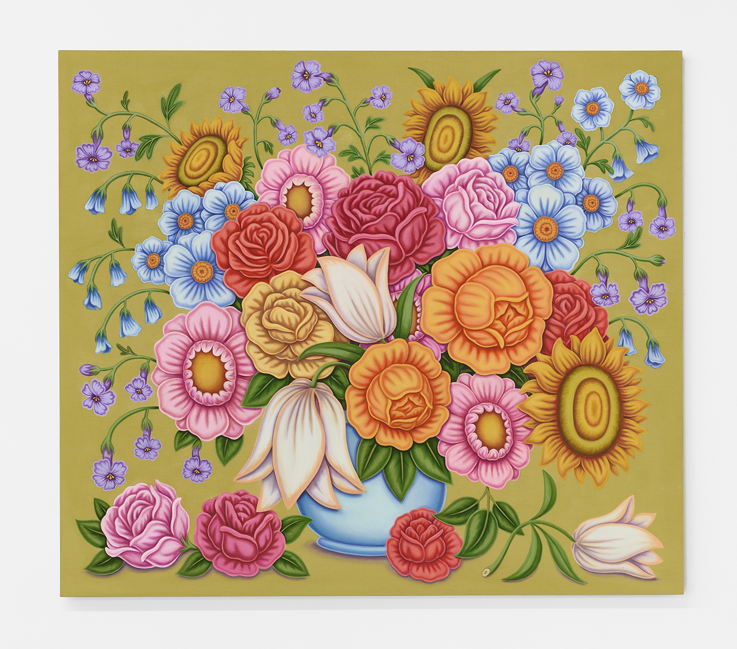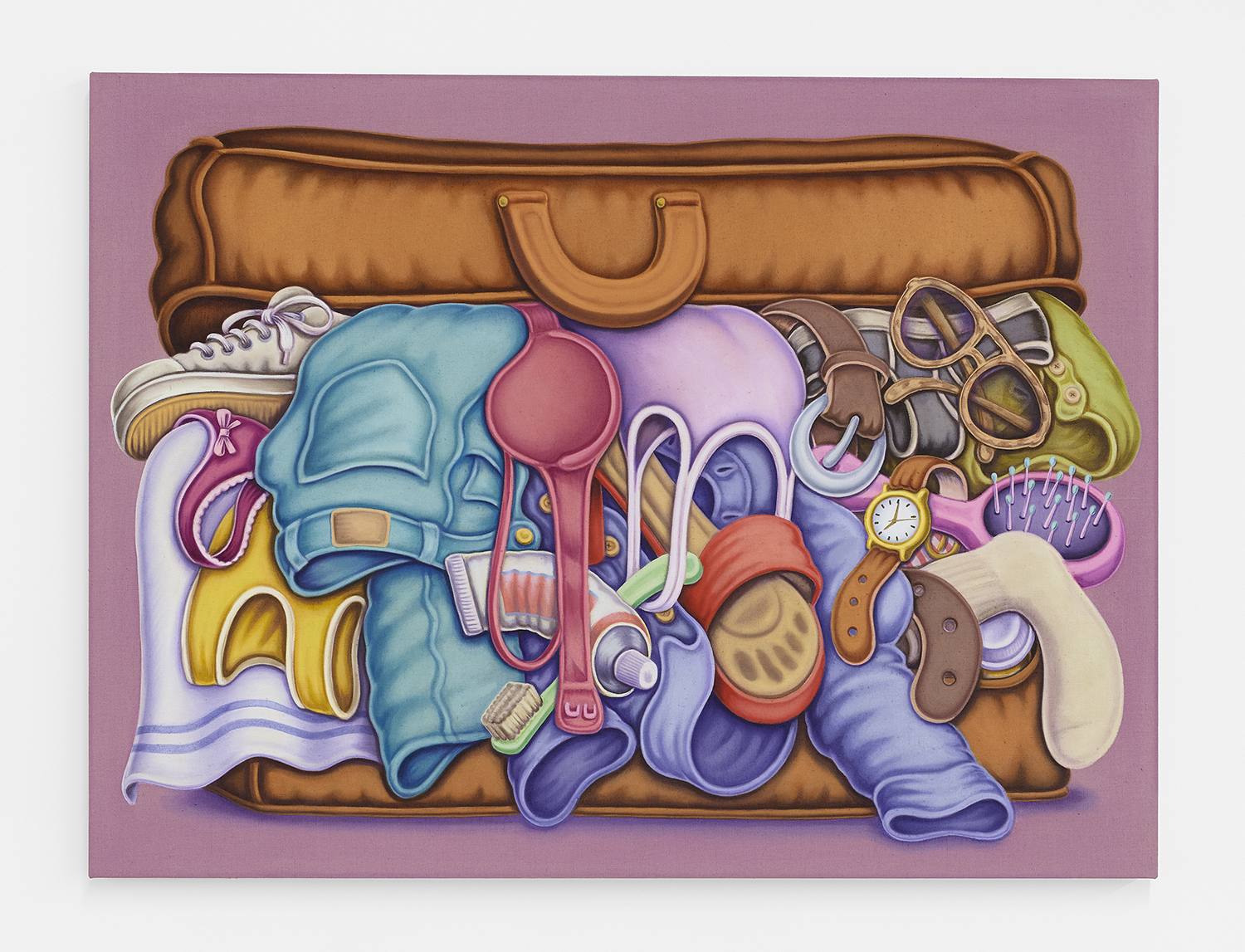 In Pedro’s universe, wholesomeness coexists with disquiet. This tension is underscored by the artist’s skewed perspective and flat planes, upon which all objects are plopped as if ready to fall off the canvas. Some of the juxtapositions give pause: sharp knives close to plump peaches, a lighter and an oily paint rag, stinky sandals precariously close to a toothbrush. Most important to Pedro’s practice, however, is his intuition, drafted from a collage of images with scenes that come together as he goes along, allowing his inner thoughts to shine through, while also leaving space for our own.