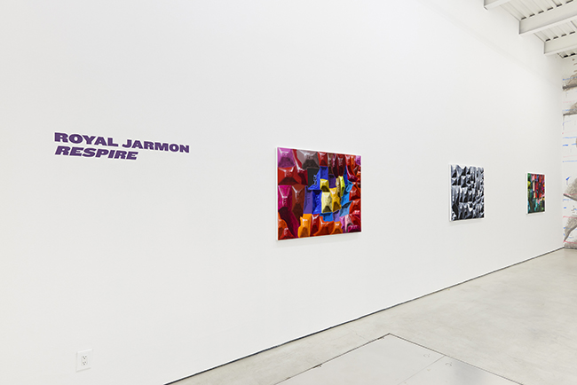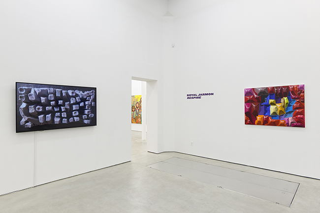 Jarmon’s stop-motion animation of the “keyboard” being pressed helps demonstrate the implied motion of the paintings; instead of clicking keys however, here the states rise and fall in a rhythmic way similar to breathing: the title of the piece—and the show—Respire. Evocatively, this work makes the map of the country appear as a living, breathing organism, and ultimately the viewer can’t help but project some thoughts about America onto them: I think about Americans from coast to coast, staying at home and all breathing together.
