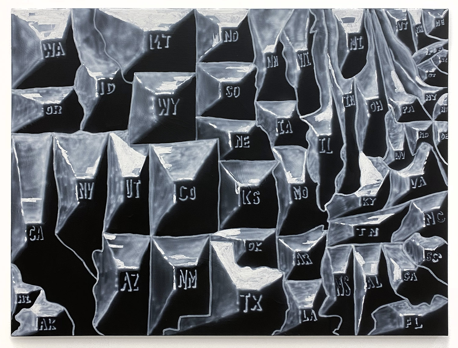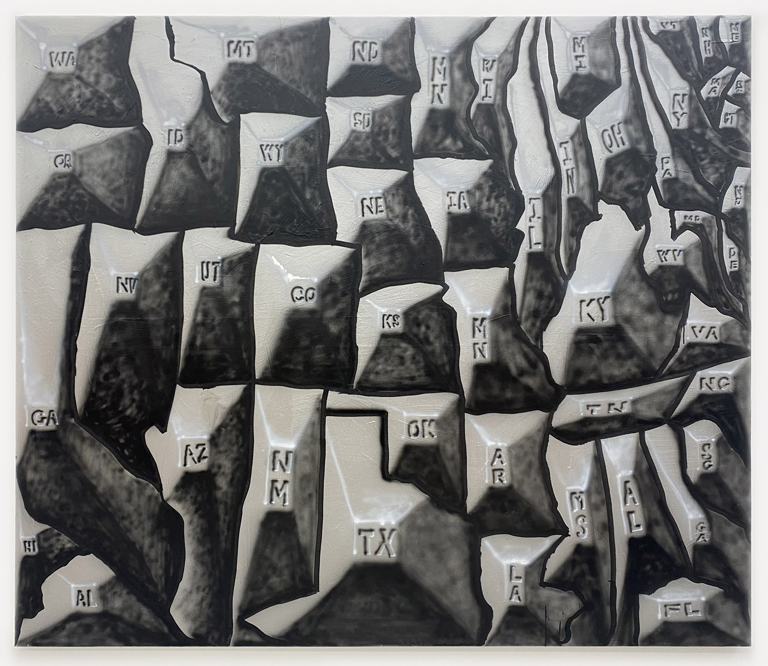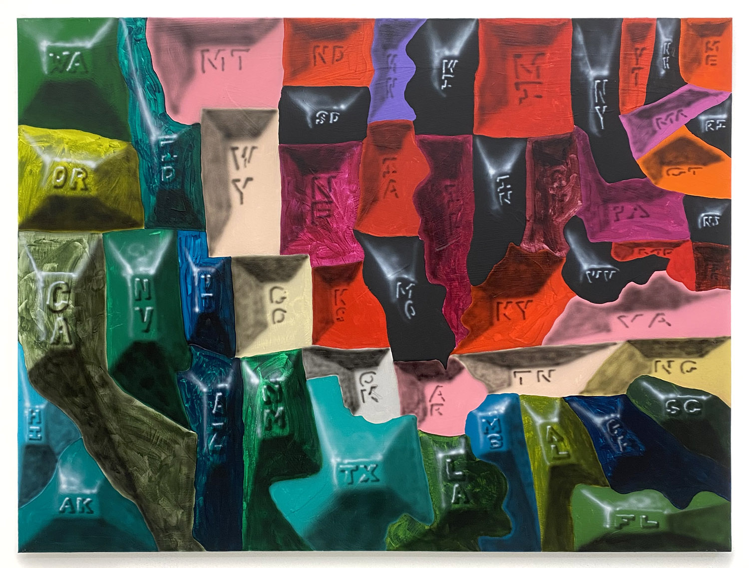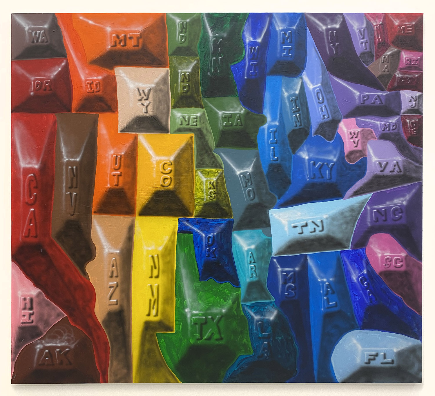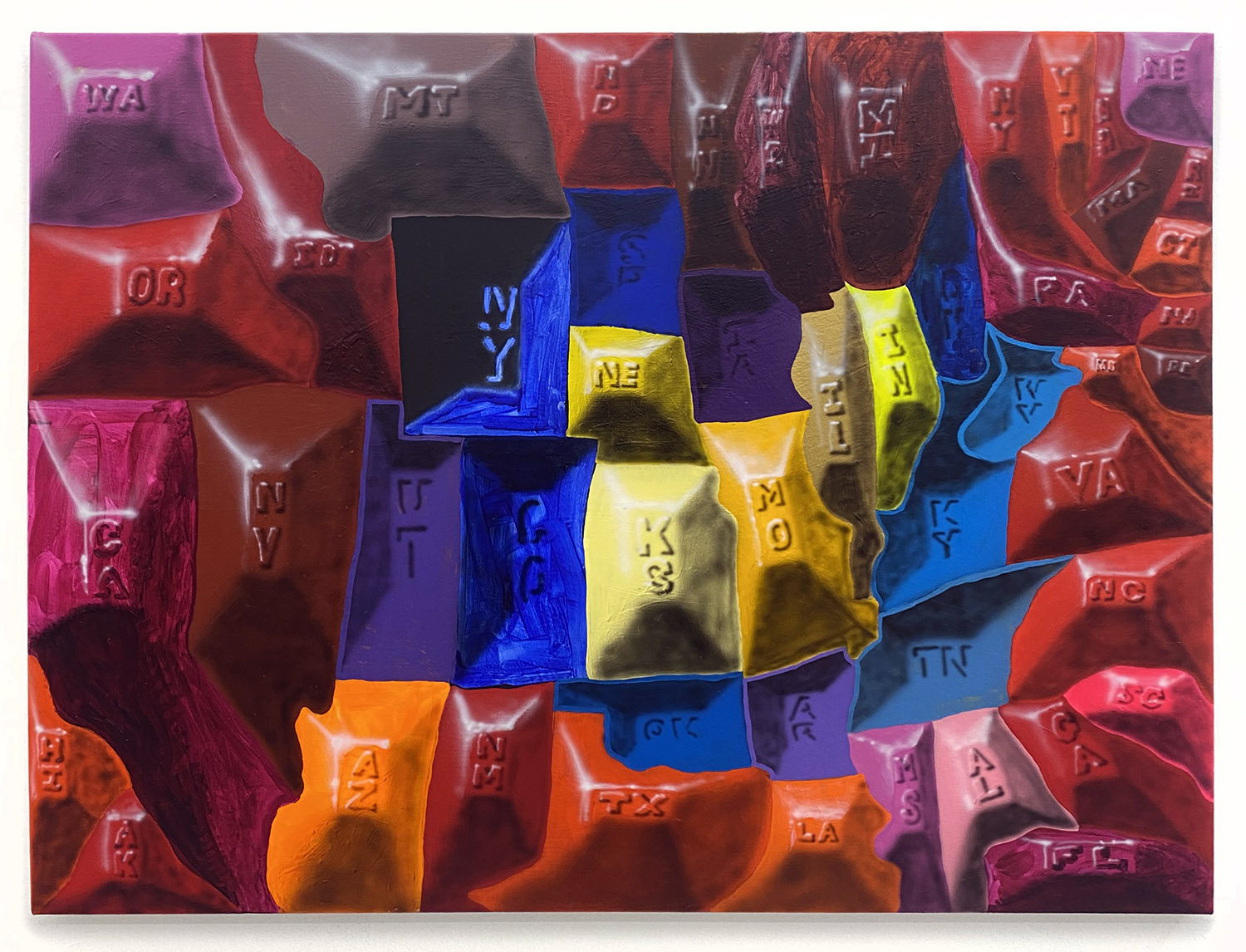 The works include spray, paint marker and traditional brushwork; aggressively applied and rough. The states are barely reminiscent of their actual geographical borders but are each labeled by their two-letter abbreviation and vaguely where they should be. The compositions crowd into the canvas, airtight, a tectonic impossibility using every available inch.