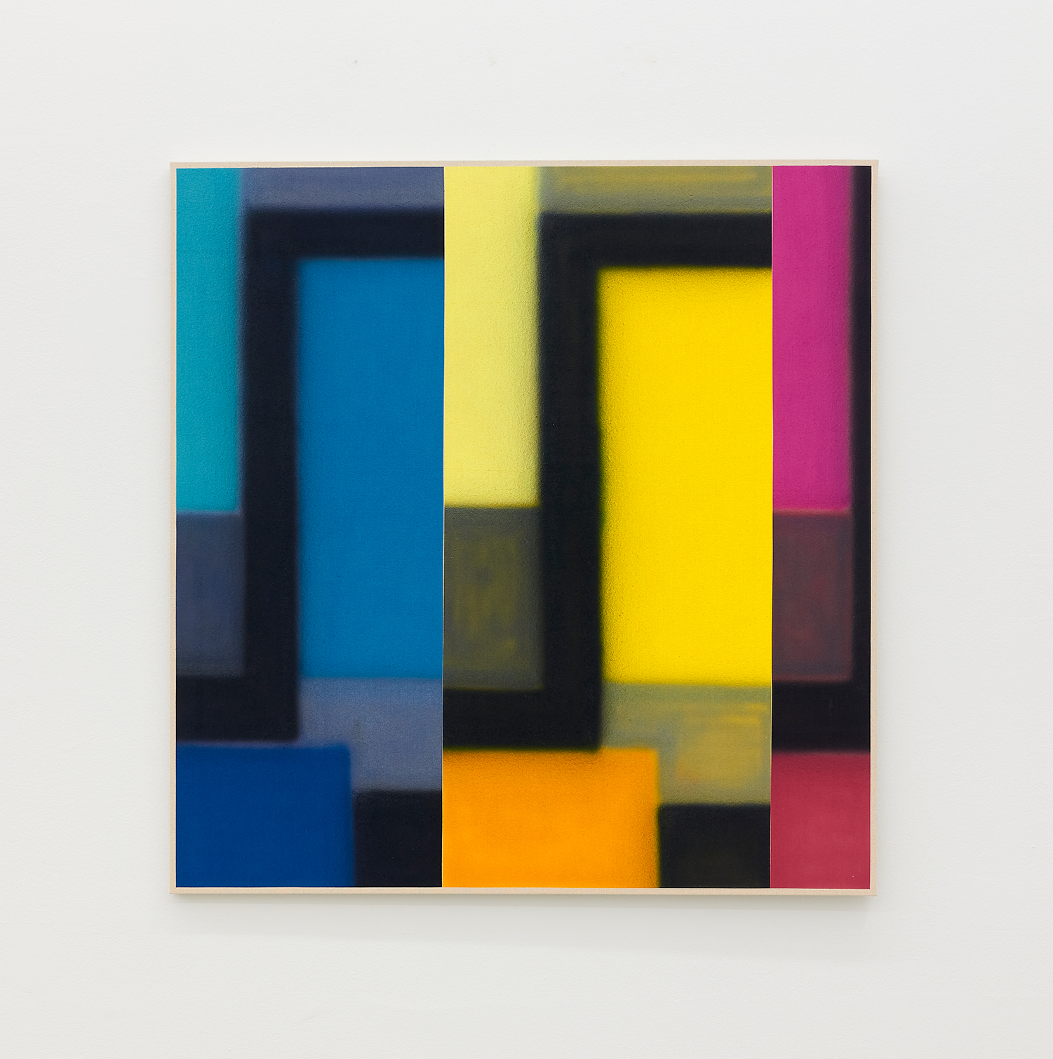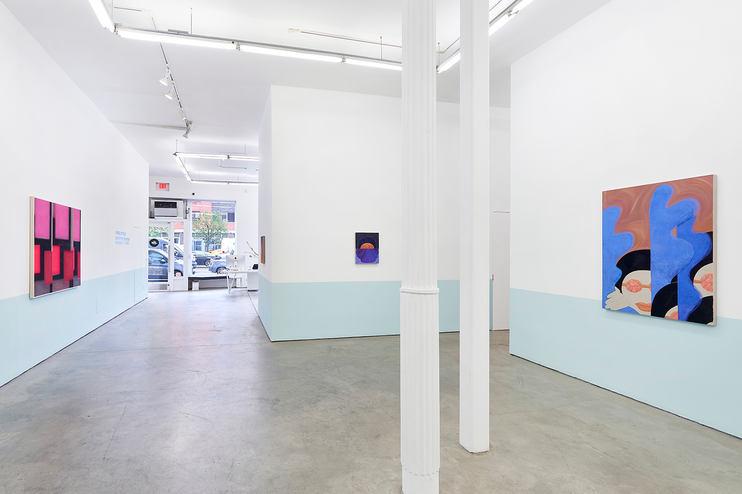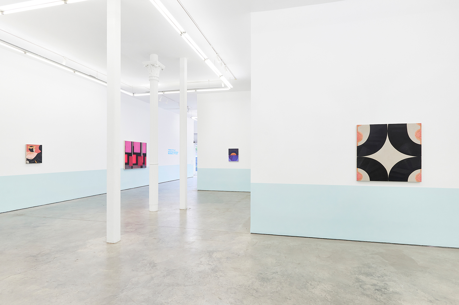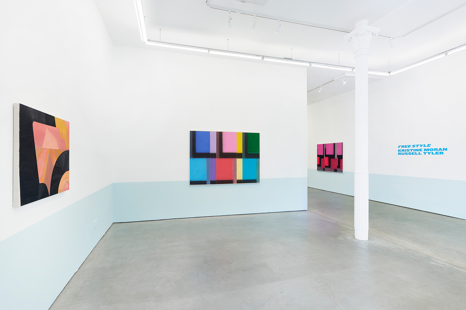For this exhibition we juxtapose eight new paintings by Canadian artist Kristine Moran with six new acrylic paintings by Brooklyn-based artist Russell Tyler. The repeated geometric shapes across these fourteen paintings resonate in surprising ways, as Moran’s abstracted swimmers splash into the black-edged rectangles of Tyler’s proliferating polygons. Hung in a gallery painted three feet up each wall with aqua blue, the show wades into the territory between figuration and abstraction with interesting results.