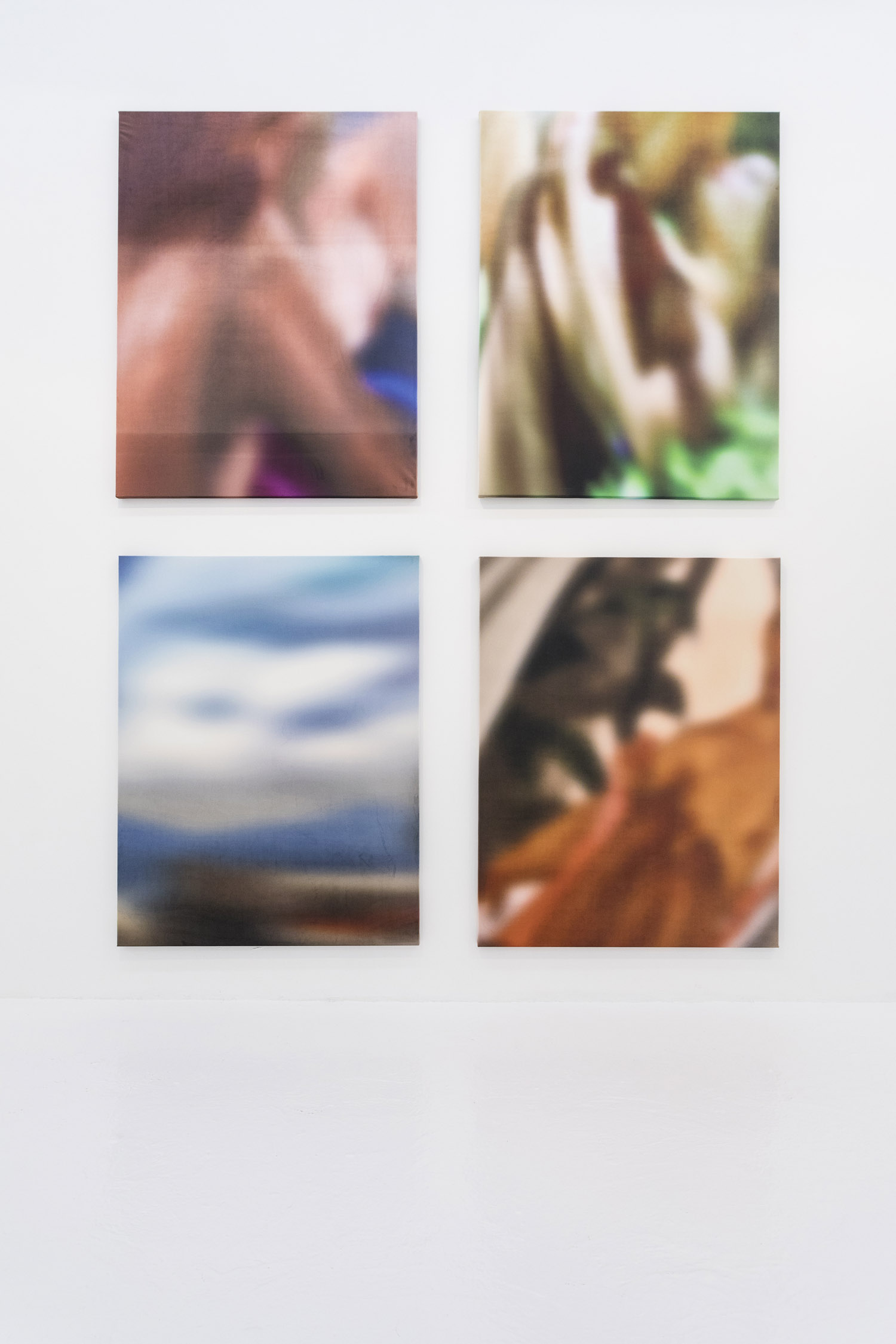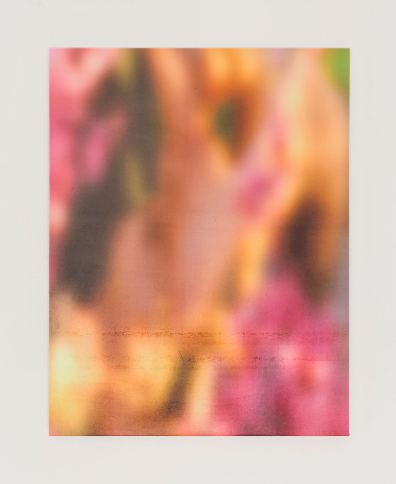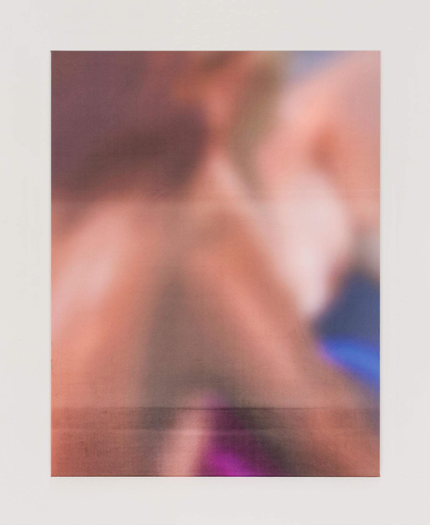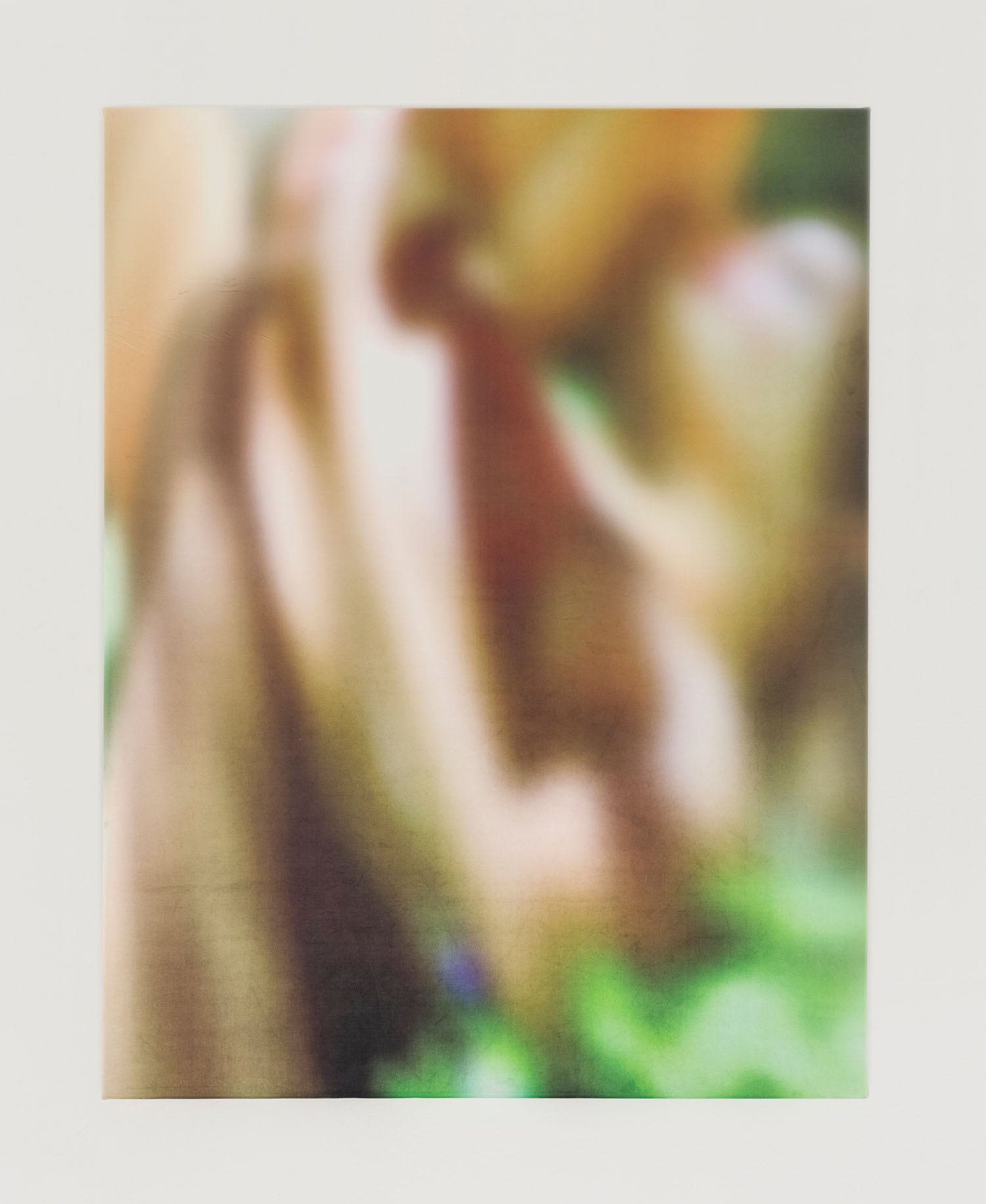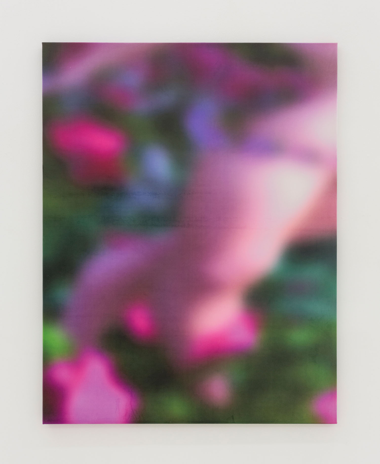 Works on synthetic suede are hung in large window-pane shapes on the walls opening up our big white box to views of the outside world. Mimicking loading images in new browser windows, the paintings look like they are still rendering, about to snap into focus for a view of the tantalizing outdoors. Perpetually blurred, super saturated dye-transfer prints mimic screenic color, glow and intensity while being tactile, soft and fuzzy physical objects. Many works look like the sky or trees, bodies in motion, people and plants, suggestively out of focus.