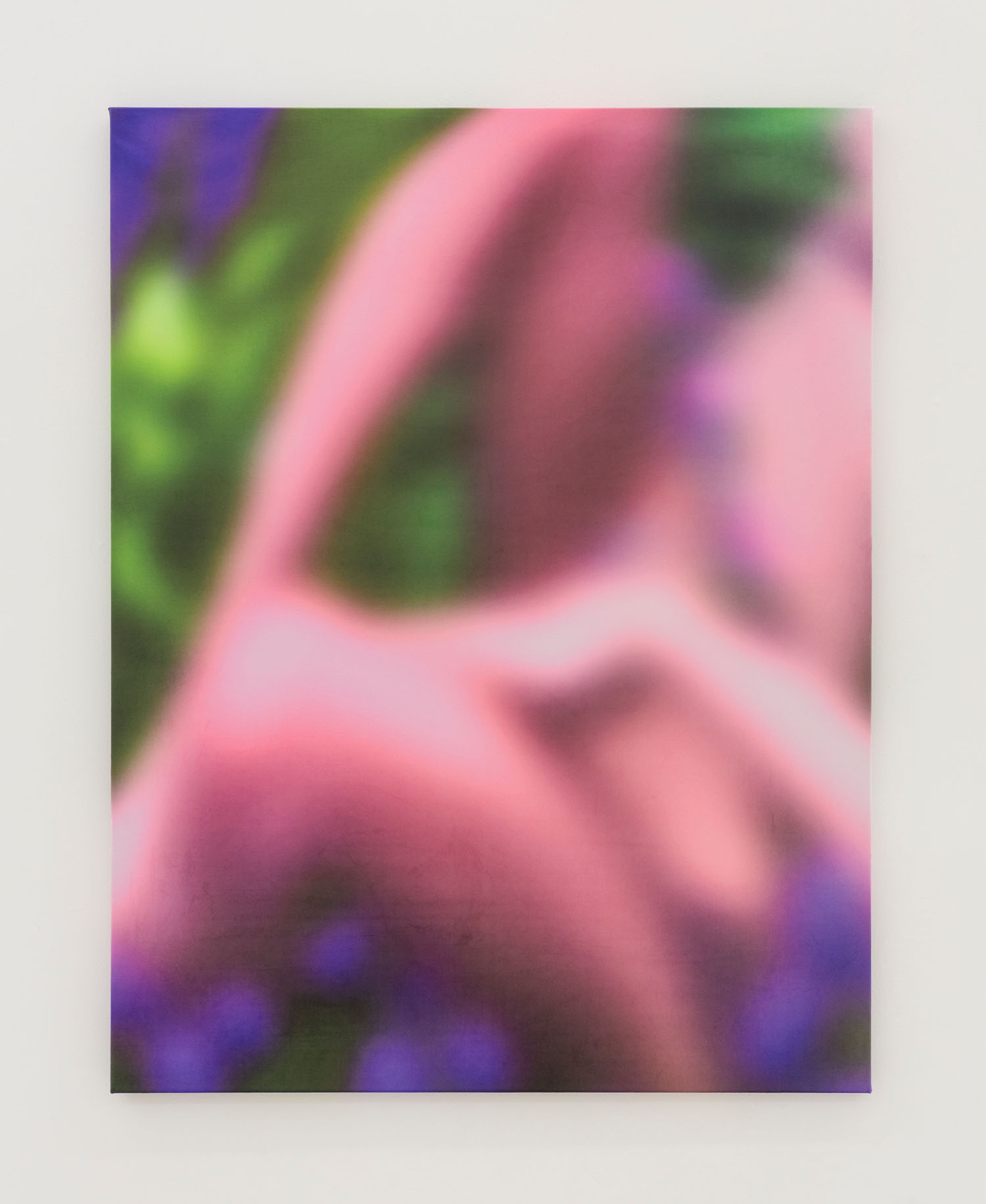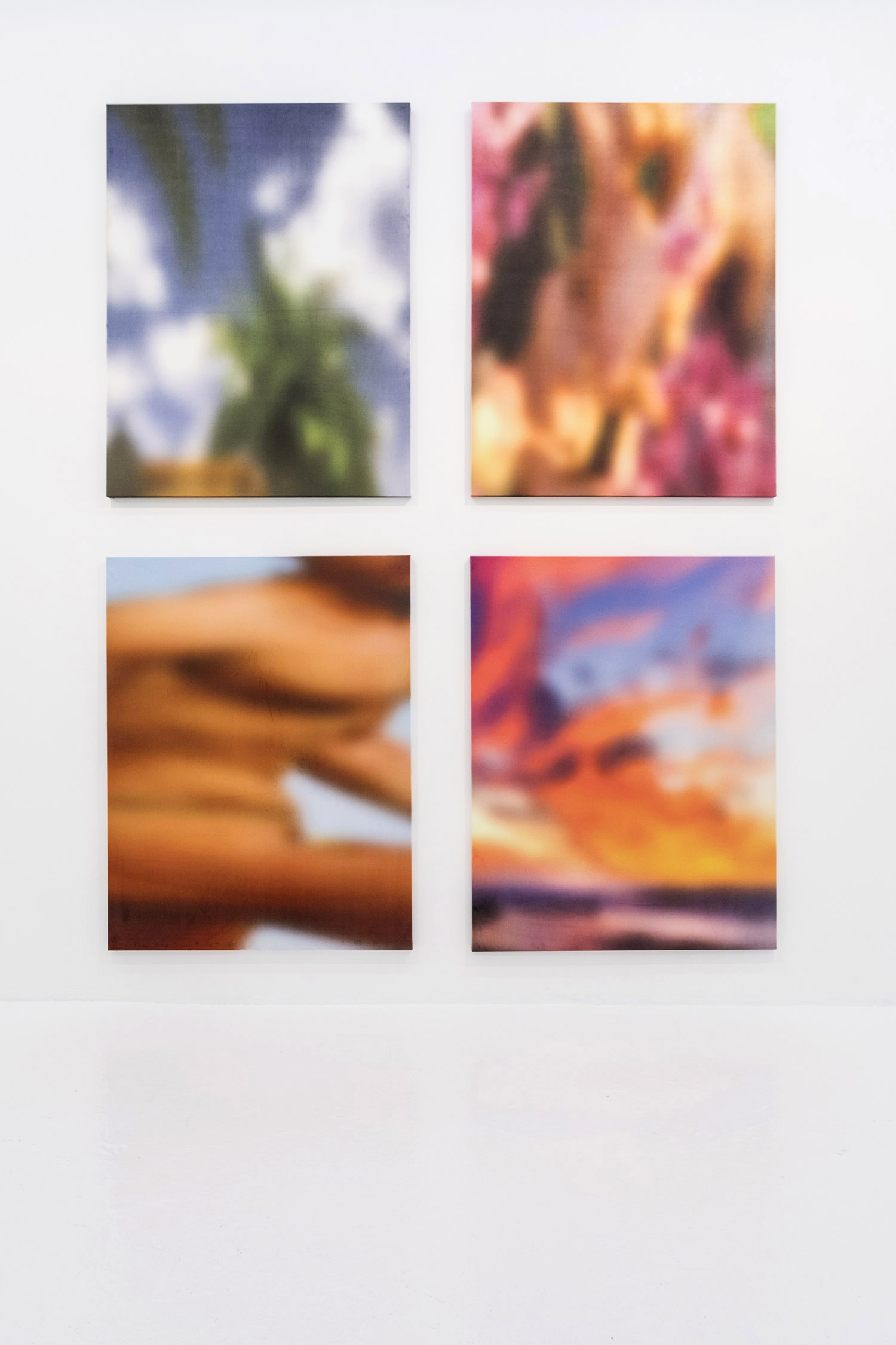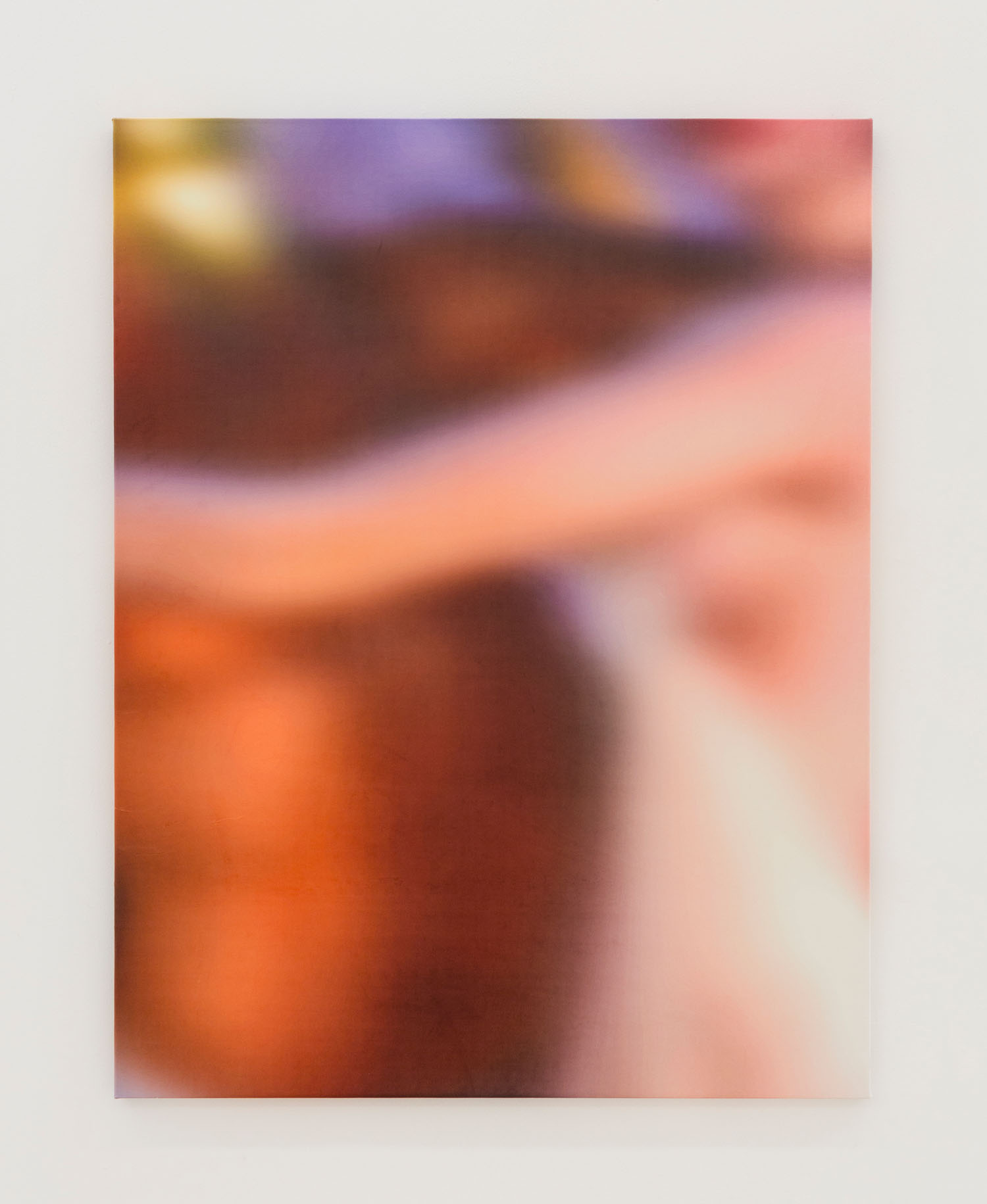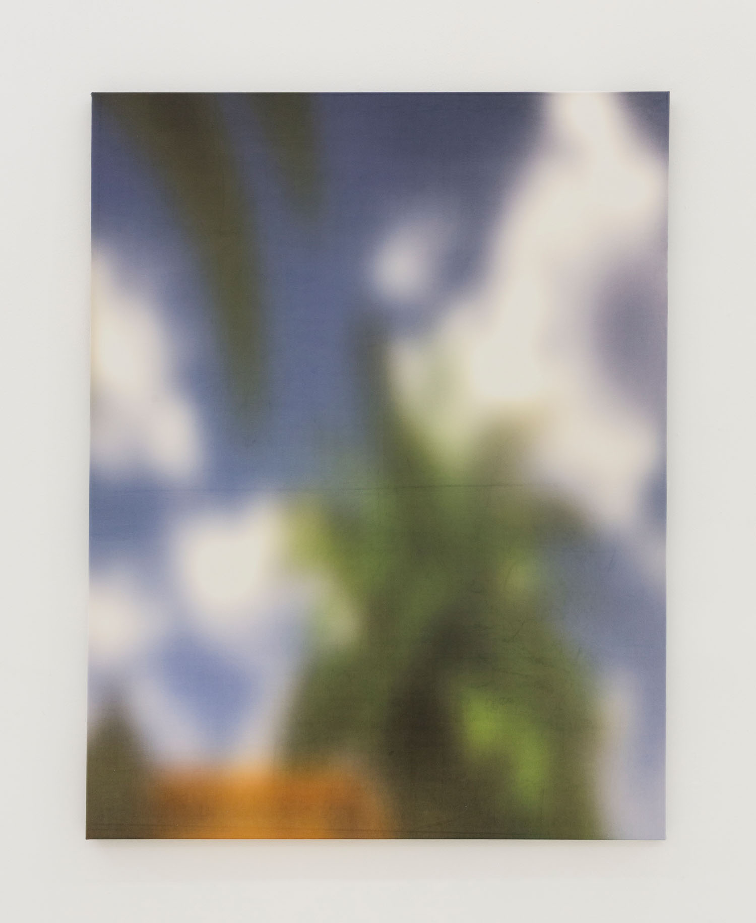 Works on synthetic suede are hung in large window-pane shapes on the walls opening up our big white box to views of the outside world. Mimicking loading images in new browser windows, the paintings look like they are still rendering, about to snap into focus for a view of the tantalizing outdoors. Perpetually blurred, super saturated dye-transfer prints mimic screenic color, glow and intensity while being tactile, soft and fuzzy physical objects. Many works look like the sky or trees, bodies in motion, people and plants, suggestively out of focus.