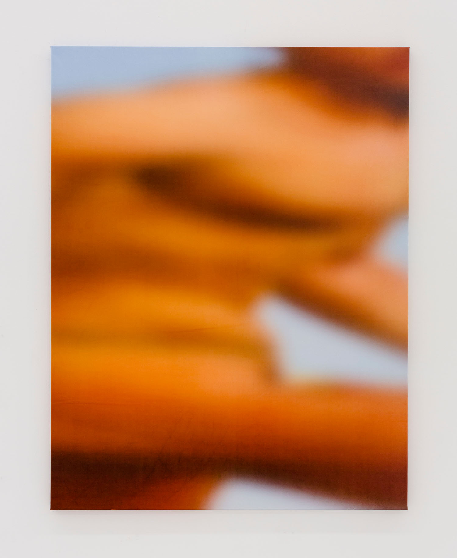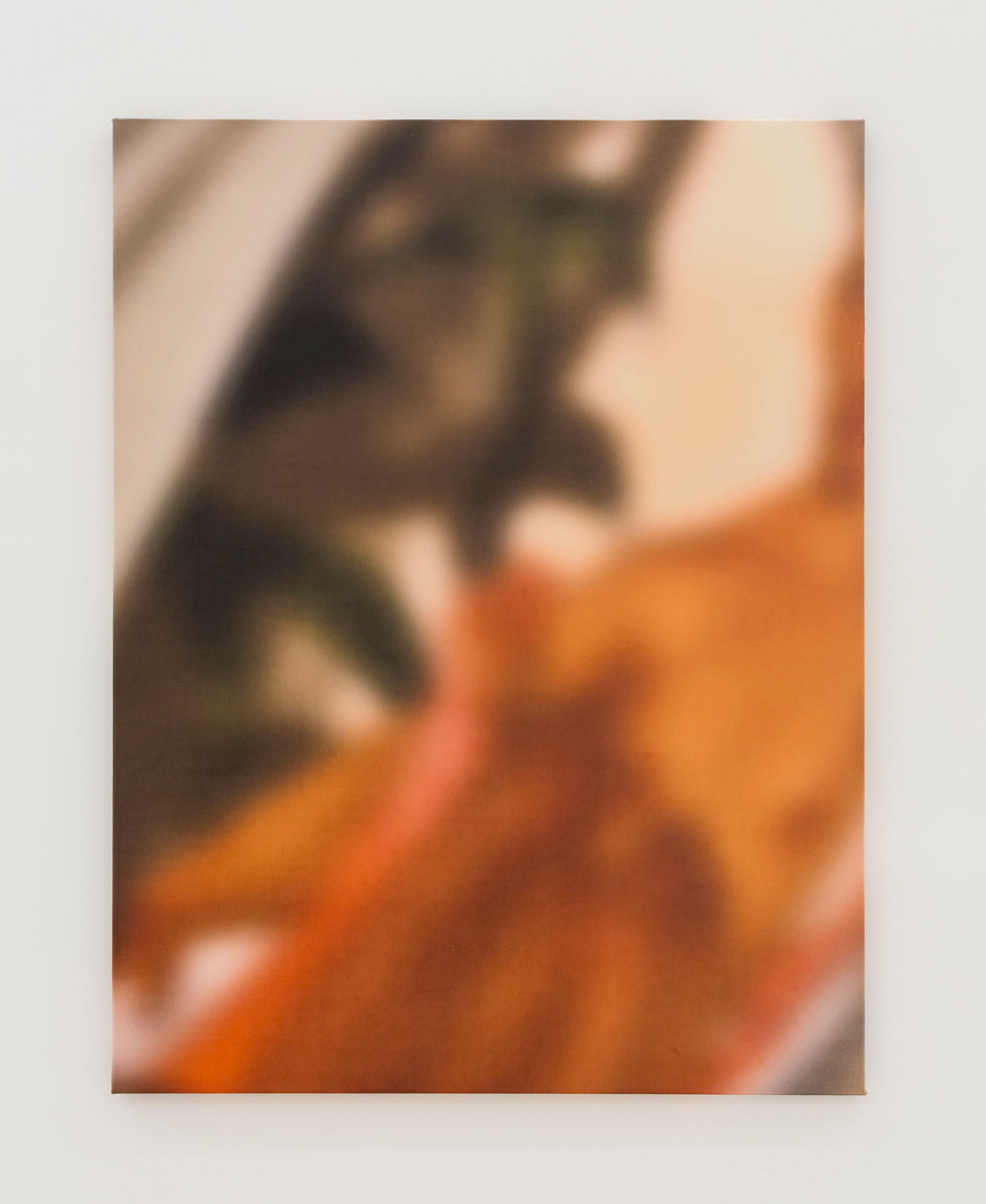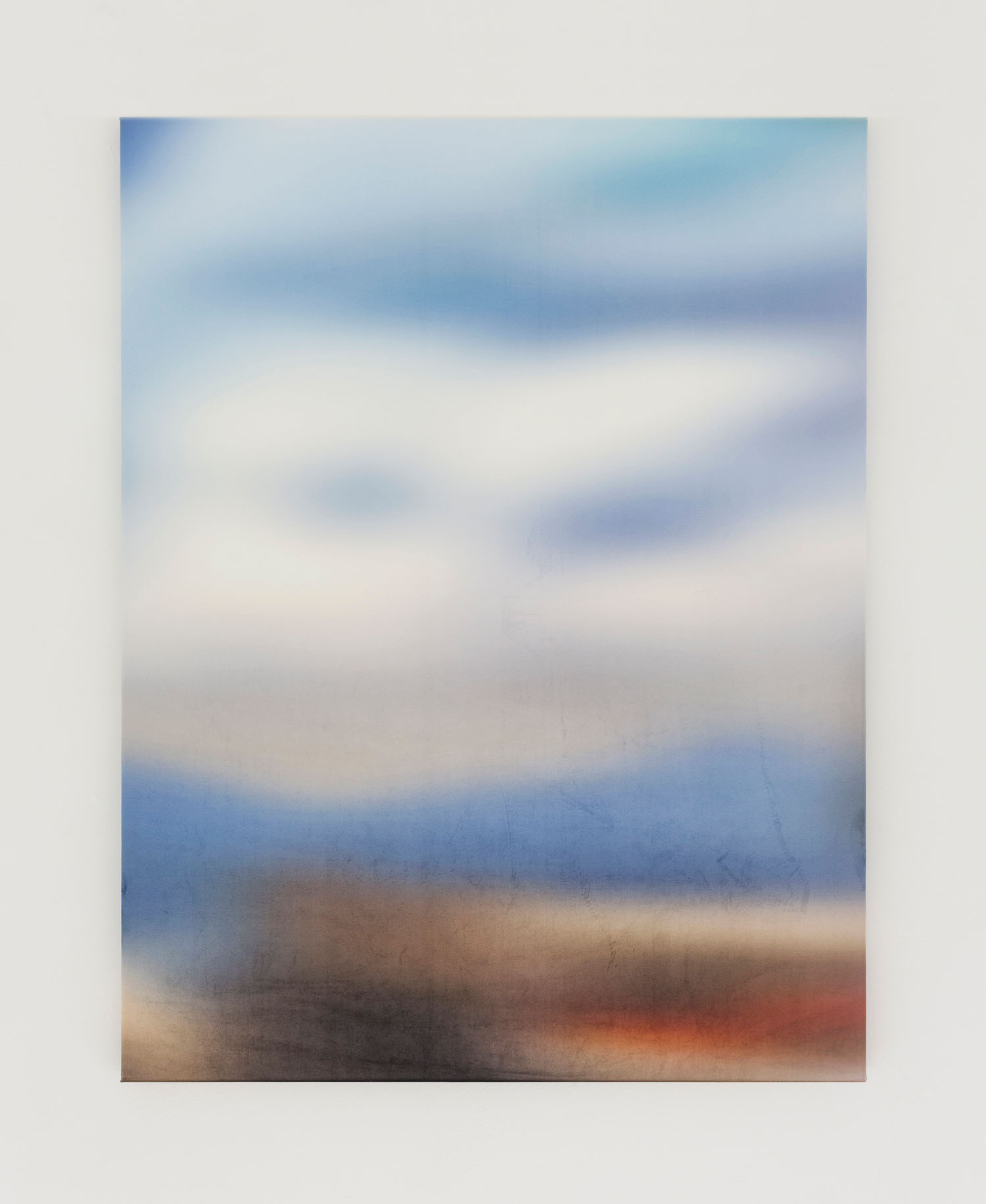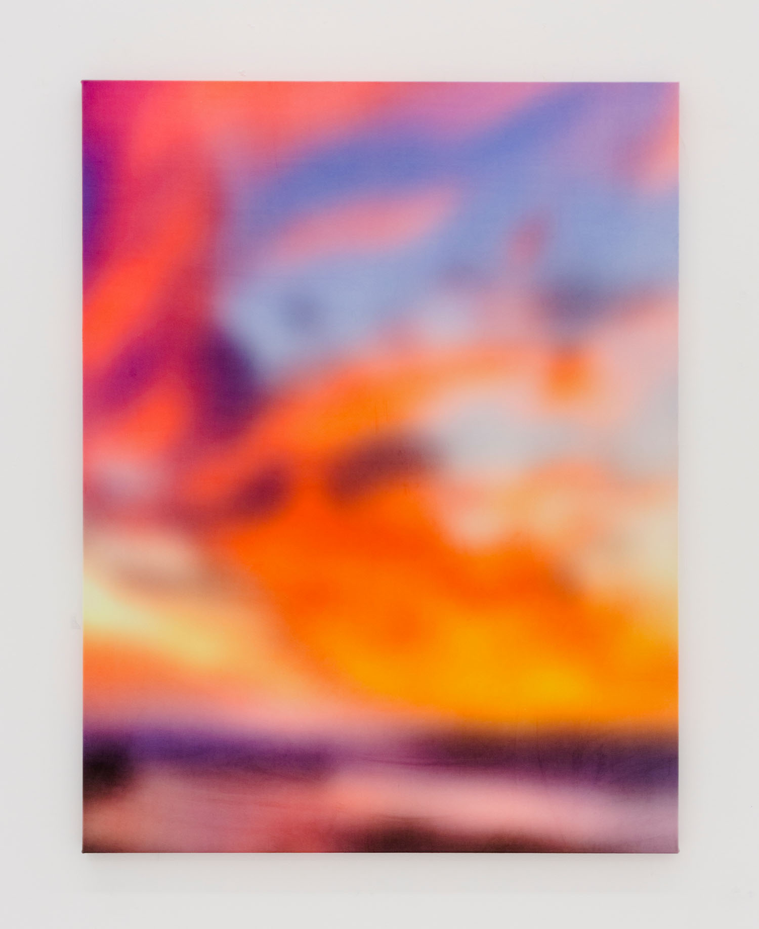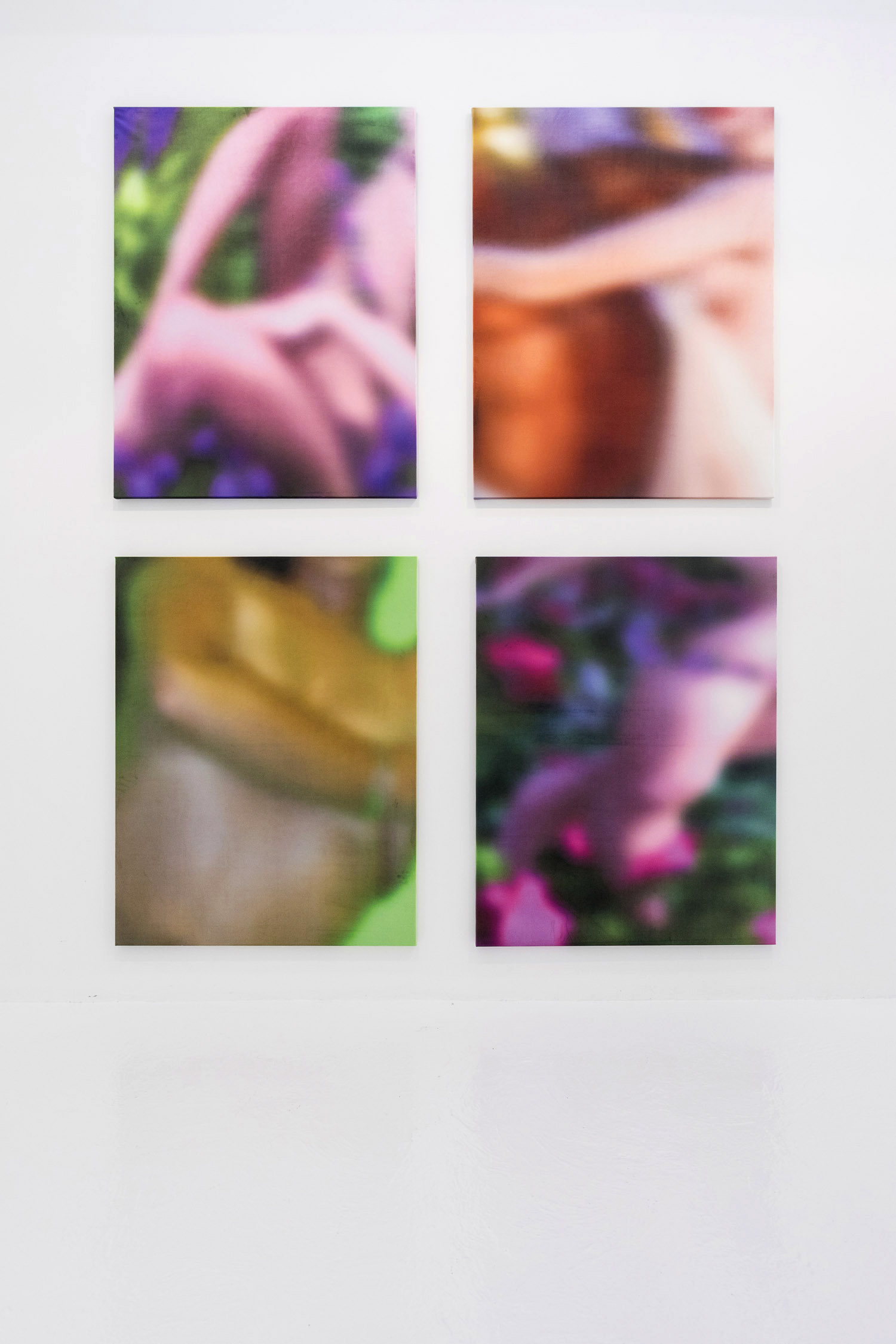 Works on synthetic suede are hung in large window-pane shapes on the walls opening up our big white box to views of the outside world. Mimicking loading images in new browser windows, the paintings look like they are still rendering, about to snap into focus for a view of the tantalizing outdoors. Perpetually blurred, super saturated dye-transfer prints mimic screenic color, glow and intensity while being tactile, soft and fuzzy physical objects. Many works look like the sky or trees, bodies in motion, people and plants, suggestively out of focus.