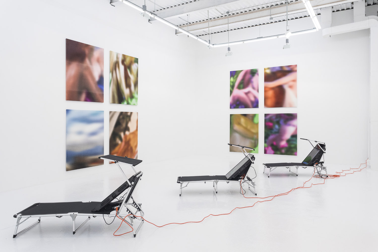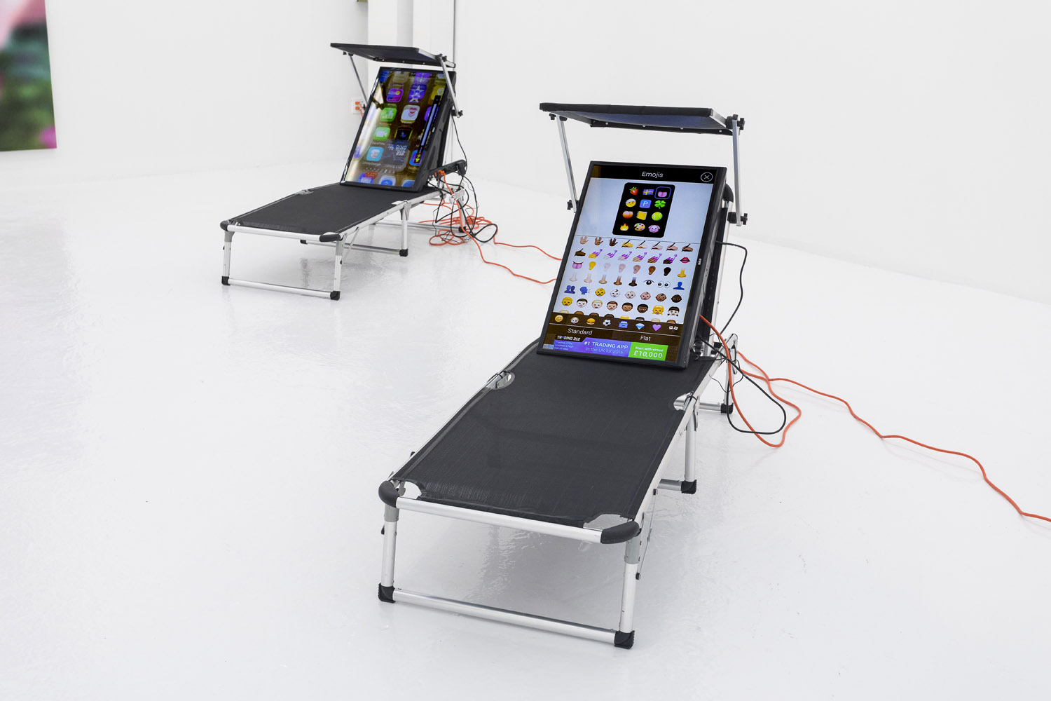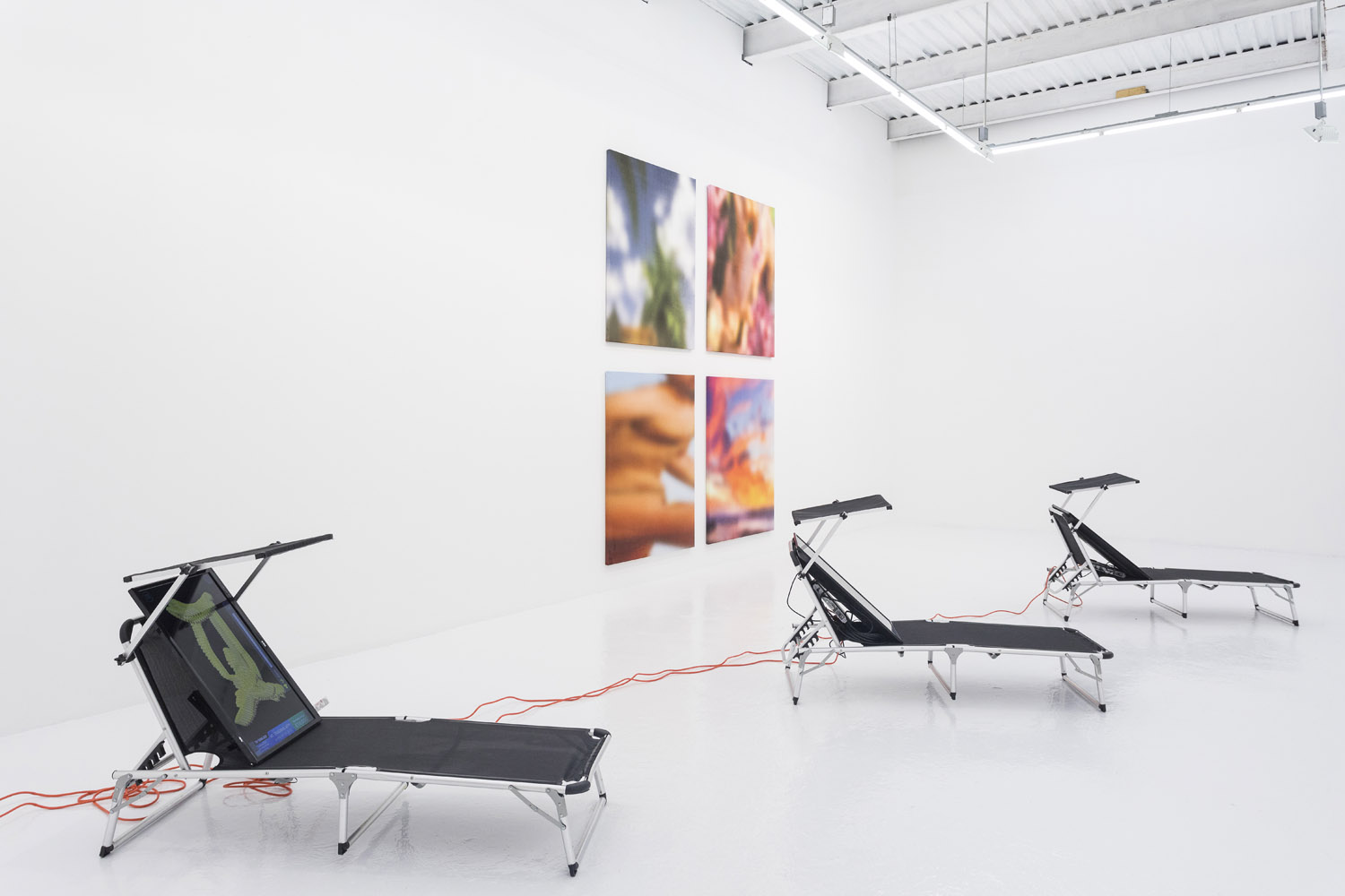 Installed in the gallery are three sun loungers with reclining video screens on them. The videos are screencasts of the artist’s phone as he makes paintings, does some other stuff, circles back, putzes around. Mounted on the surface of the screen is a “privacy vinyl” for windows, abstracting the video. Together with the giant window installations on the wall the artist seeks to convey the continual partial awareness of juggling windows in a digital space; content, location and ideas being pieced together into a worldview.