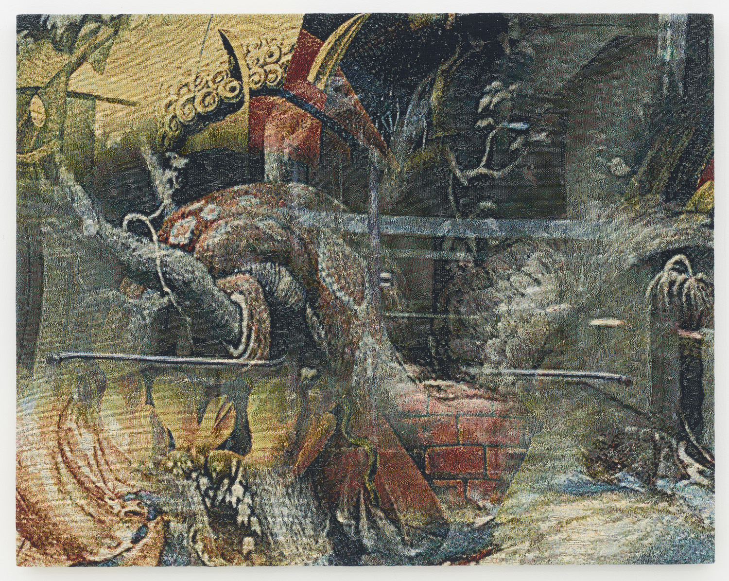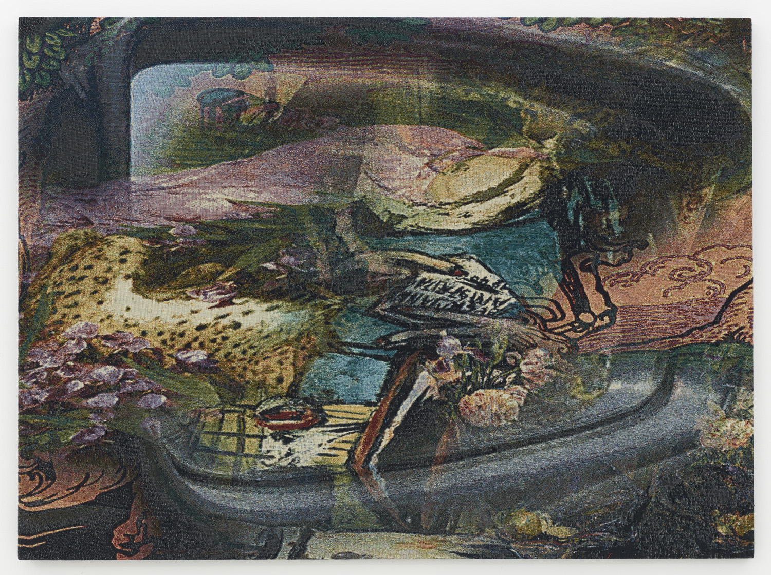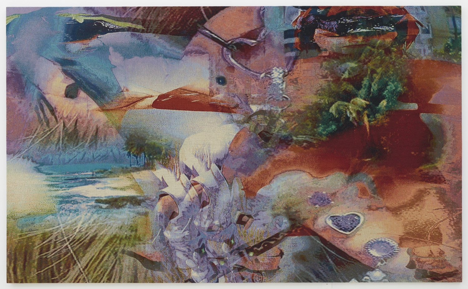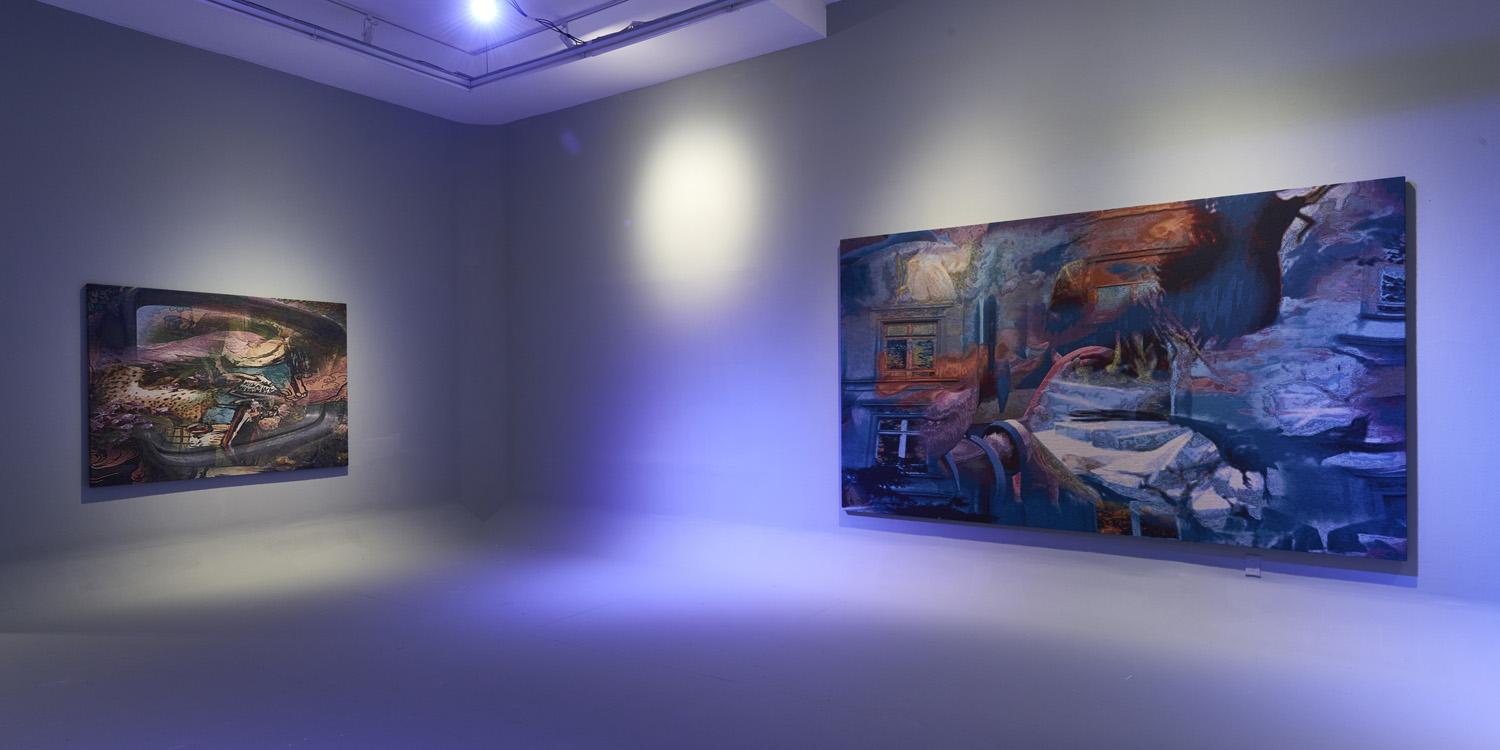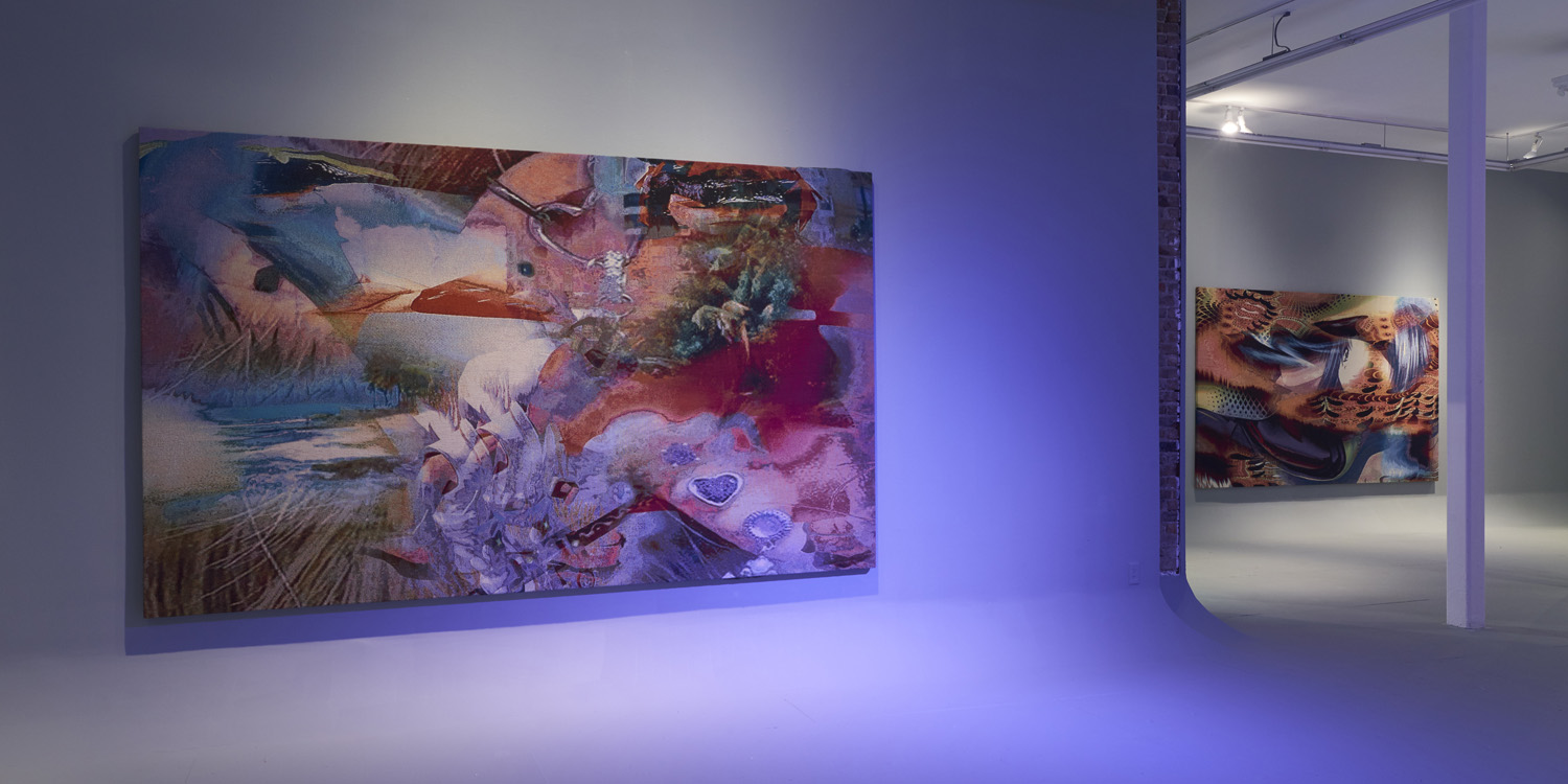 These new works debuted at HEART Museum in Herning, Denmark in a two-person installation titled LETMEIN with Jon Rafman. Having figured out how to transfer a digital painting to a jacquard woven tapestry, Bradley executed elaborately patterned abstract compositions and stretched them like paintings. In a room of custom carpet and computer-generated landscape, Bradley and Rafman let people into the screenic universe through creating immersive immaterial worlds.