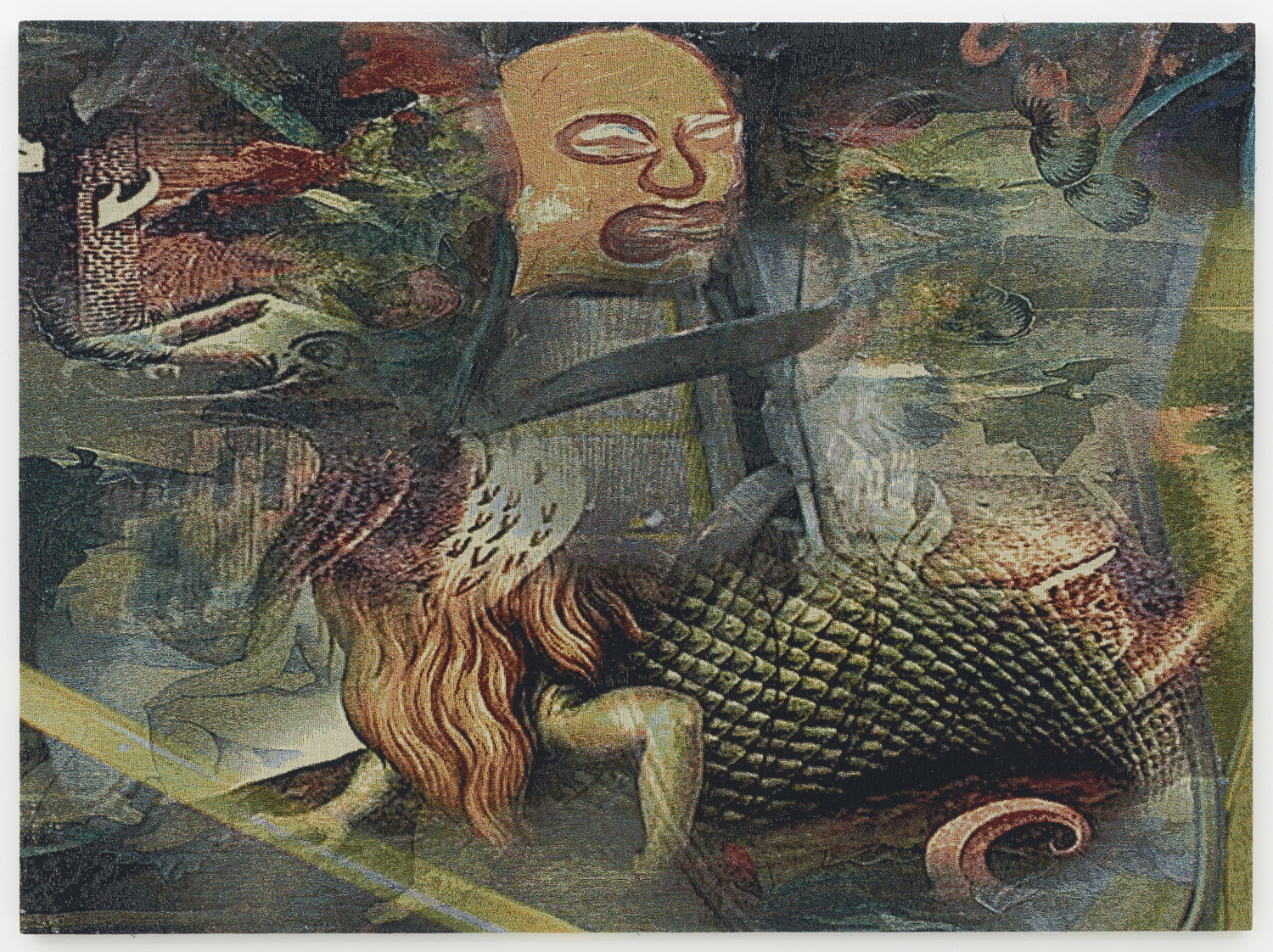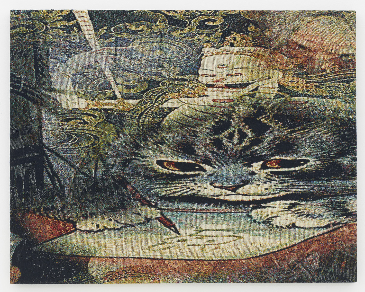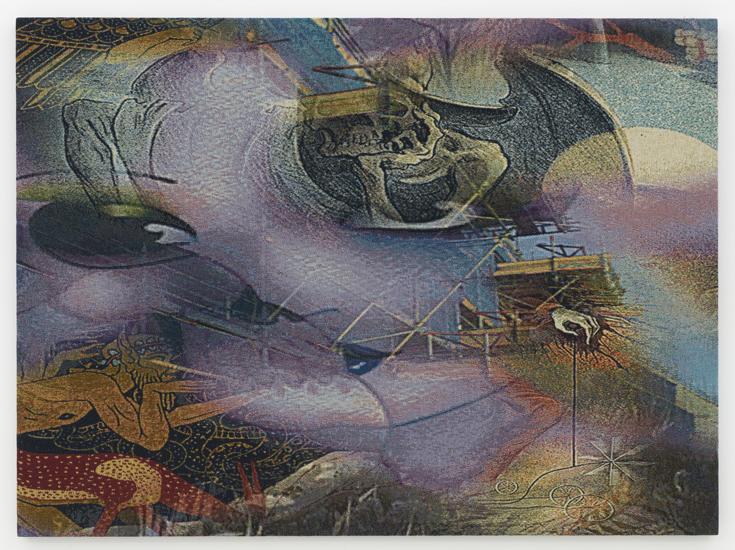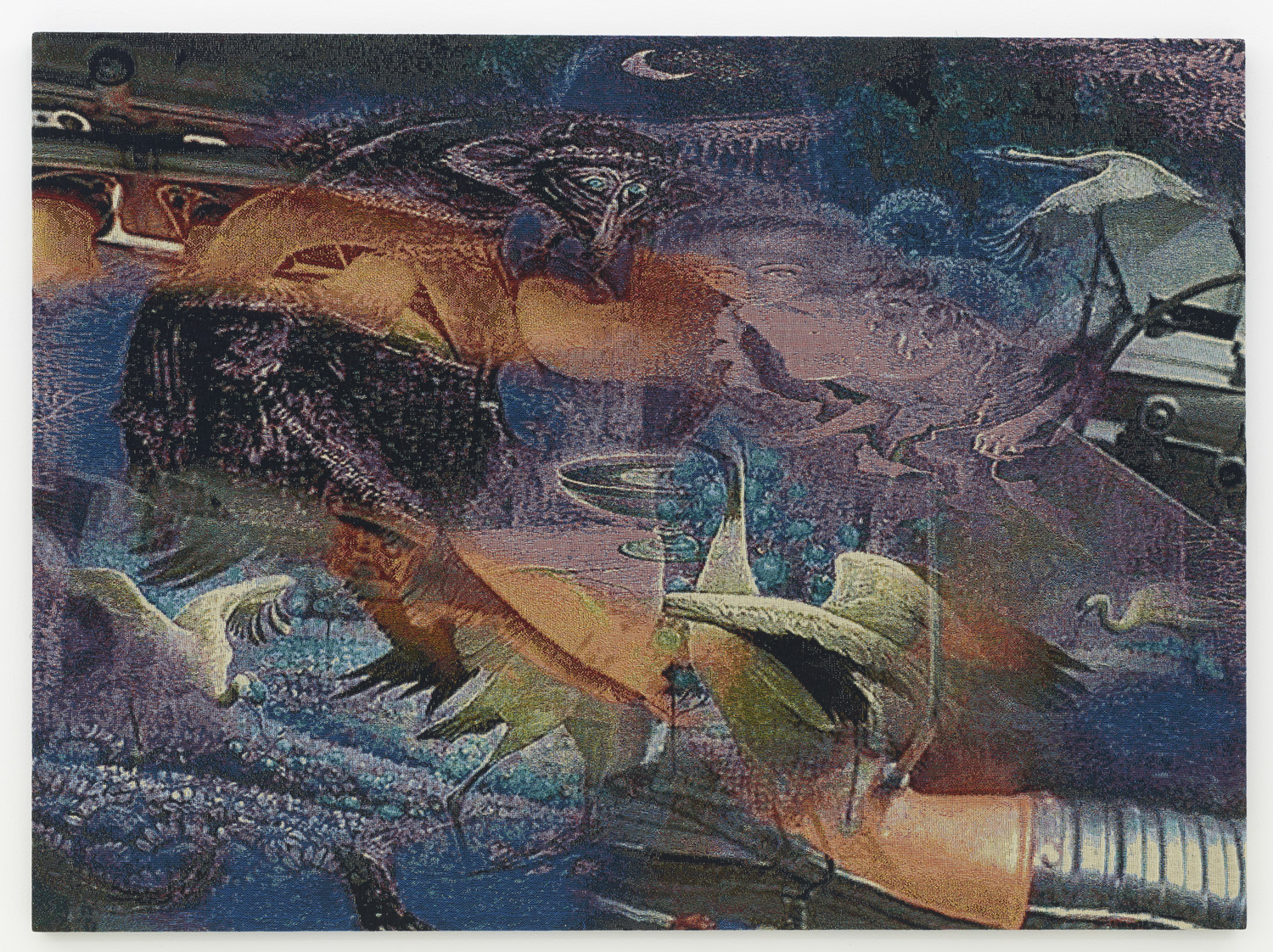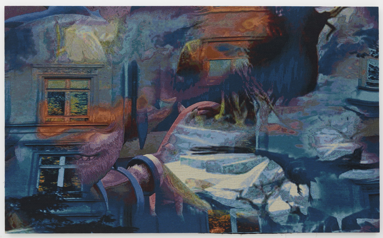 The relationship between computing and weaving has numerous flash points of contact over the past few hundred years, from weaving patterns creating the groundwork for the first computer algorithms to punch card computing mimicking pattern card to code being a type of math weaving and the million other shared metaphors the two very different disciplines each feature. Here, the work is made with each thread being a different color and by the depth of that line within the weave, like a little average color pixel zone, dictating the perceived color at a distance. Instead of printing a digital painting onto a fabric, which is sadly what most digital painting still consists of today, this image is buried and revealed in the thick jacquard, with limited colors of thread a la CMYK making a full spectrum of color.