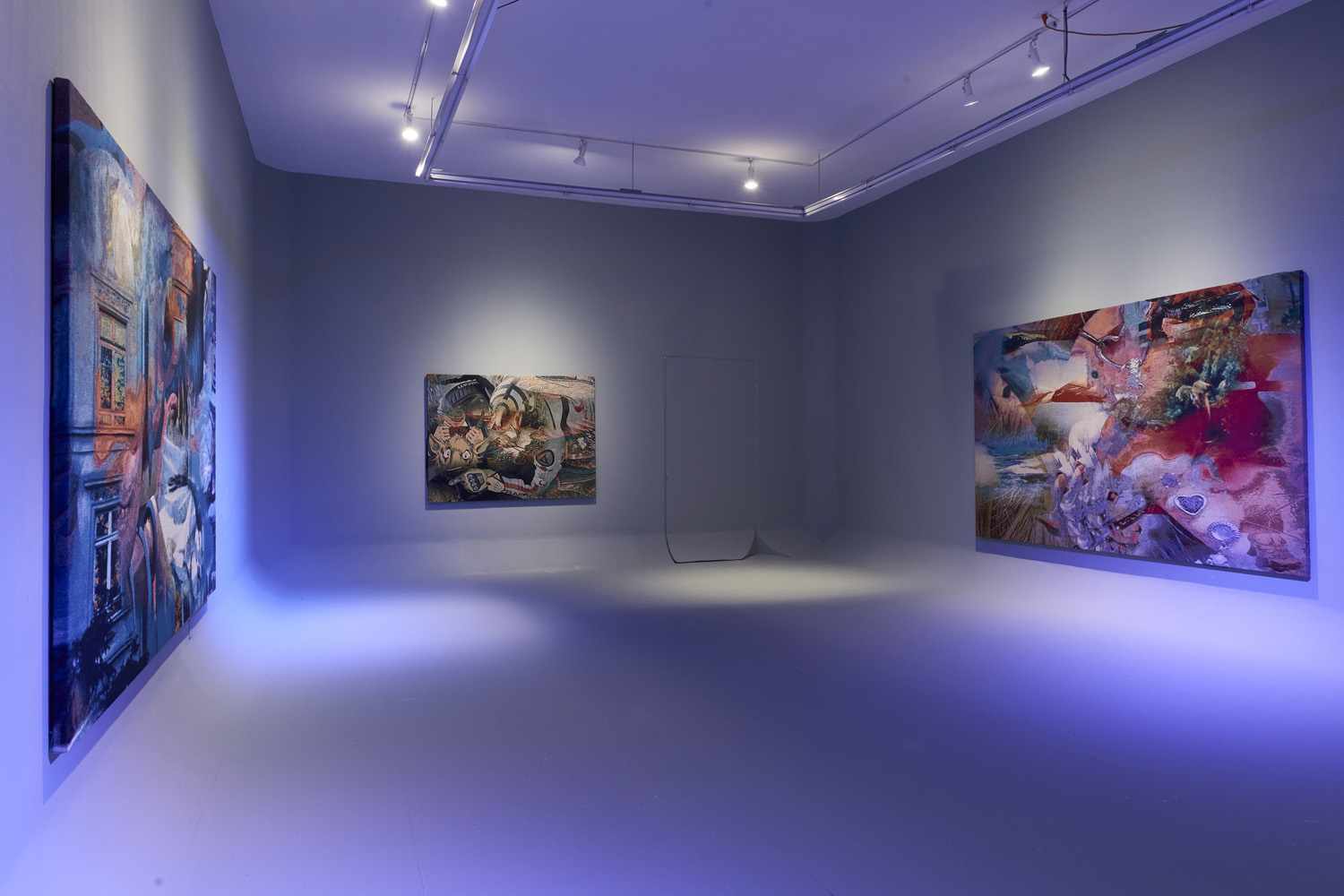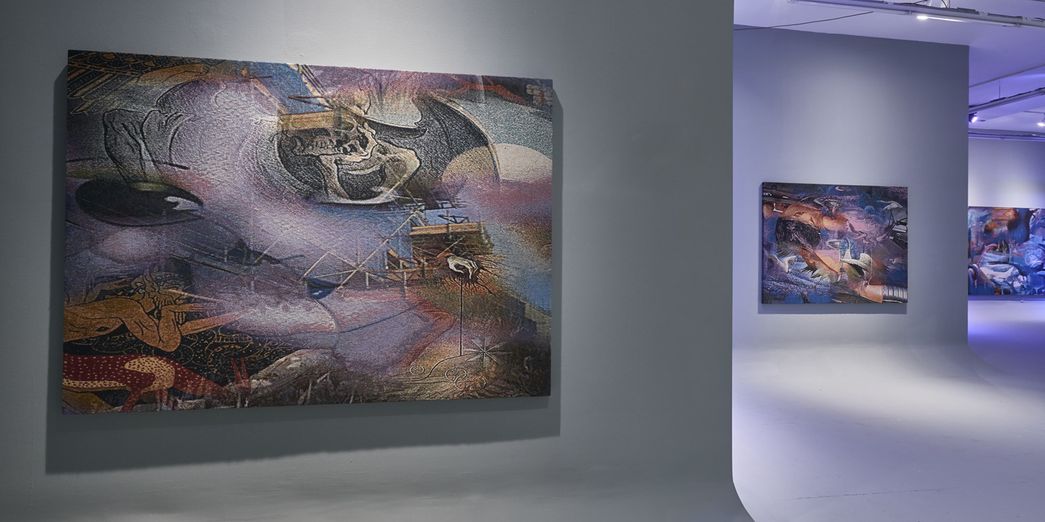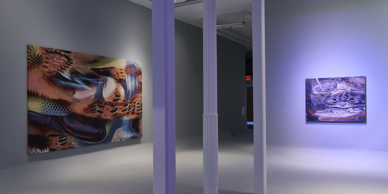 The Hole is proud to present the second solo exhibition at the gallery by Australian artist Ry David Bradley. For his sophomore effort, Bradley transforms the gallery into a CYC studio and hangs eight digitally-conceived classical tapestries. The exhibition is lit by searching LED spotlights selectively revealing and distracting from the artworks as they hunt around the room.