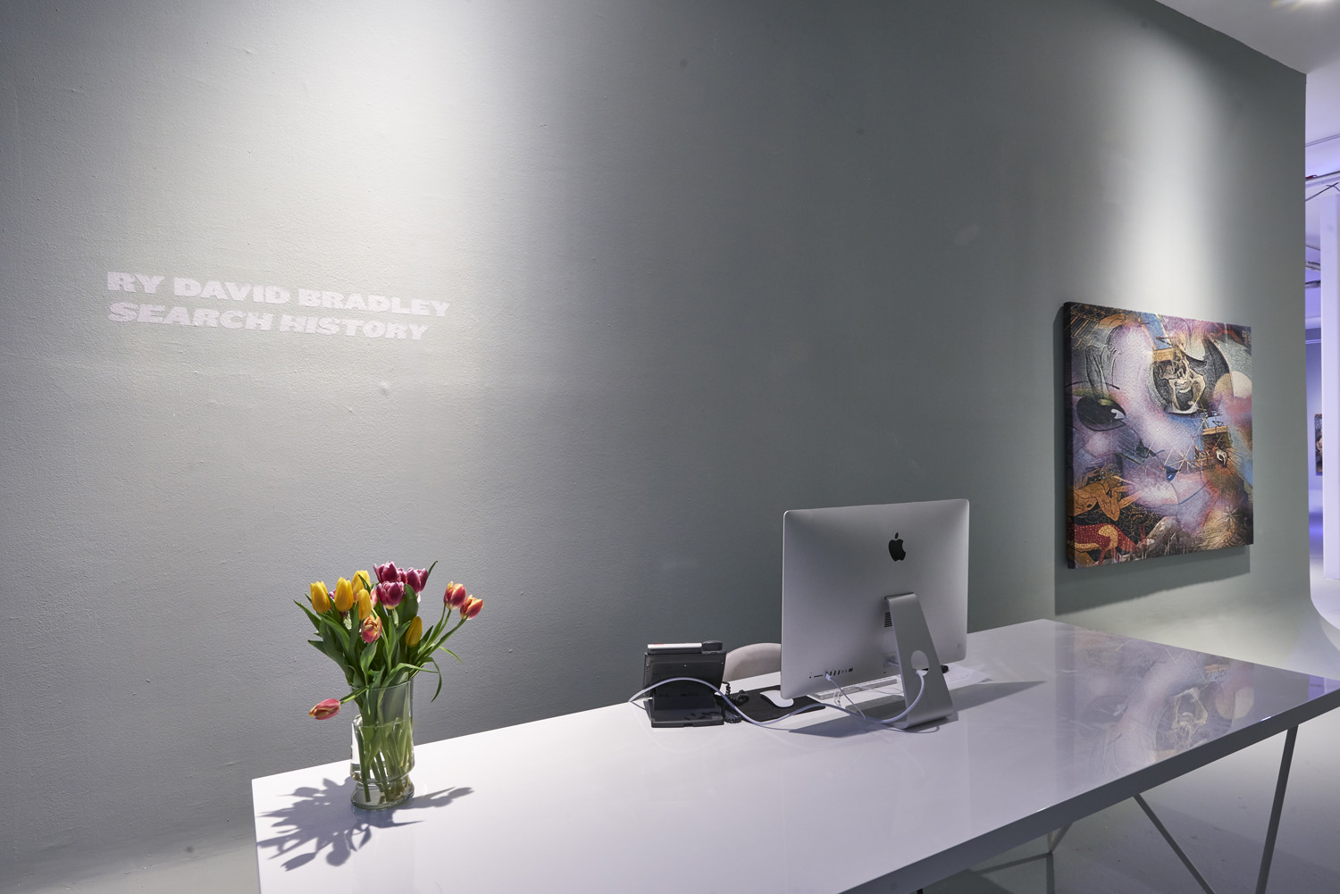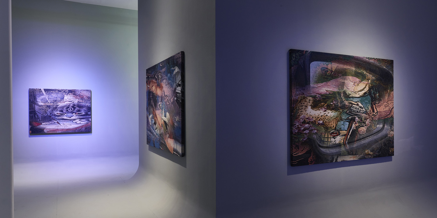 Search History blends more antique ways of image making with a slick futuristic exhibition design and lighting scheme. The walls of the gallery have been curved and smoothed so no corners exist, and the works hover in the grey void of our CYC studio install. The imagery Bradley weaves together with custom digital brushes mixes ancient art with futuristic compositions only possible from a digital platform. The idea of a search history being someone’s digital fingerprint, a unique bread crumb trail through an infinite image forest is suggested by the searching lights trying to track them around the room.