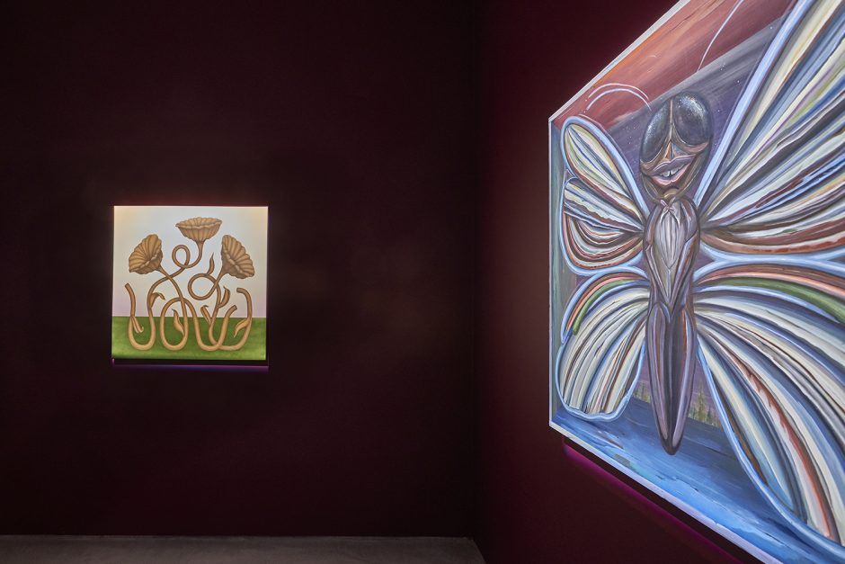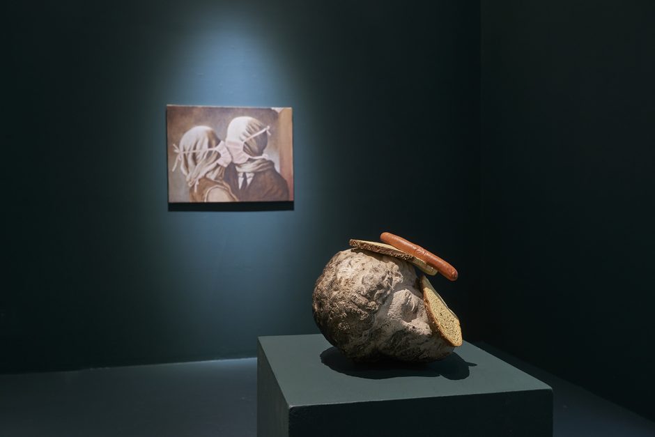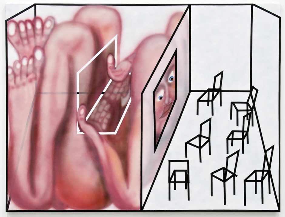 Sadly that essay is for another time (I already passed that class don’t make me take it again!) Here we have thirty-five artists to share with you and very little space left to type. Generally speaking the show groups itself into some shared tendencies, whether it is a dark romance coming from Ariana Papademetropoulos, Tali Lennox, Leonor Fini and Alison Blickle; or a face/mask zone with Aurel Schmidt, Kara Joslyn, Charlene Tyberghein, Louisa Gagliardi; a creepy garden with Nicolas Party, Alexander Harrison, Molly Greene or Ben Sanders; or a more pop cartoony type of disturbing with Aaron Elvis Jupin, Adam Parker Smith, Samual Weinberg and Botond Keresztesi. A major group would be embodied distortions of Brittney Leeanne Williams, Ben Spiers, Cathrin Hoffmann, Jana Euler and many more; one of the recurring body parts of the show is the mouth, starting with the vagina-mouth in Magritte’s Le Viol, through the teeth-baring scream of Emily Mae Smith’s archetypal apple. Louisa Gagliardi’s giant spike piercing through the bottom lip of her digitally painted mouth, the open pink shell in Tali Lennox’s lap or the shark-like over-toothed grin of Weinberg’s pink man: the smiles in the show are the mysterious focus, ending with the shrouded—and masked—mouths of Eric Yahnker’s Magritte homage.