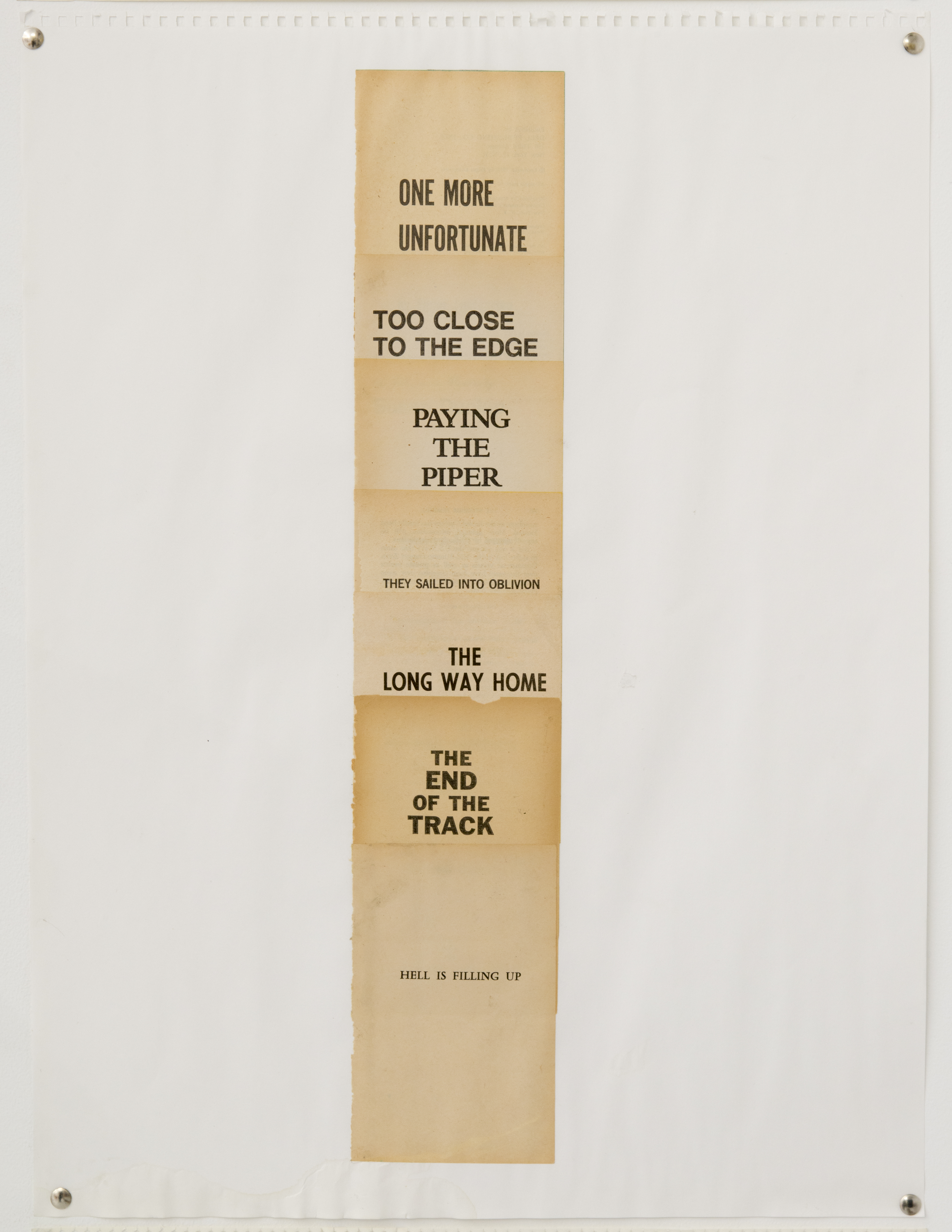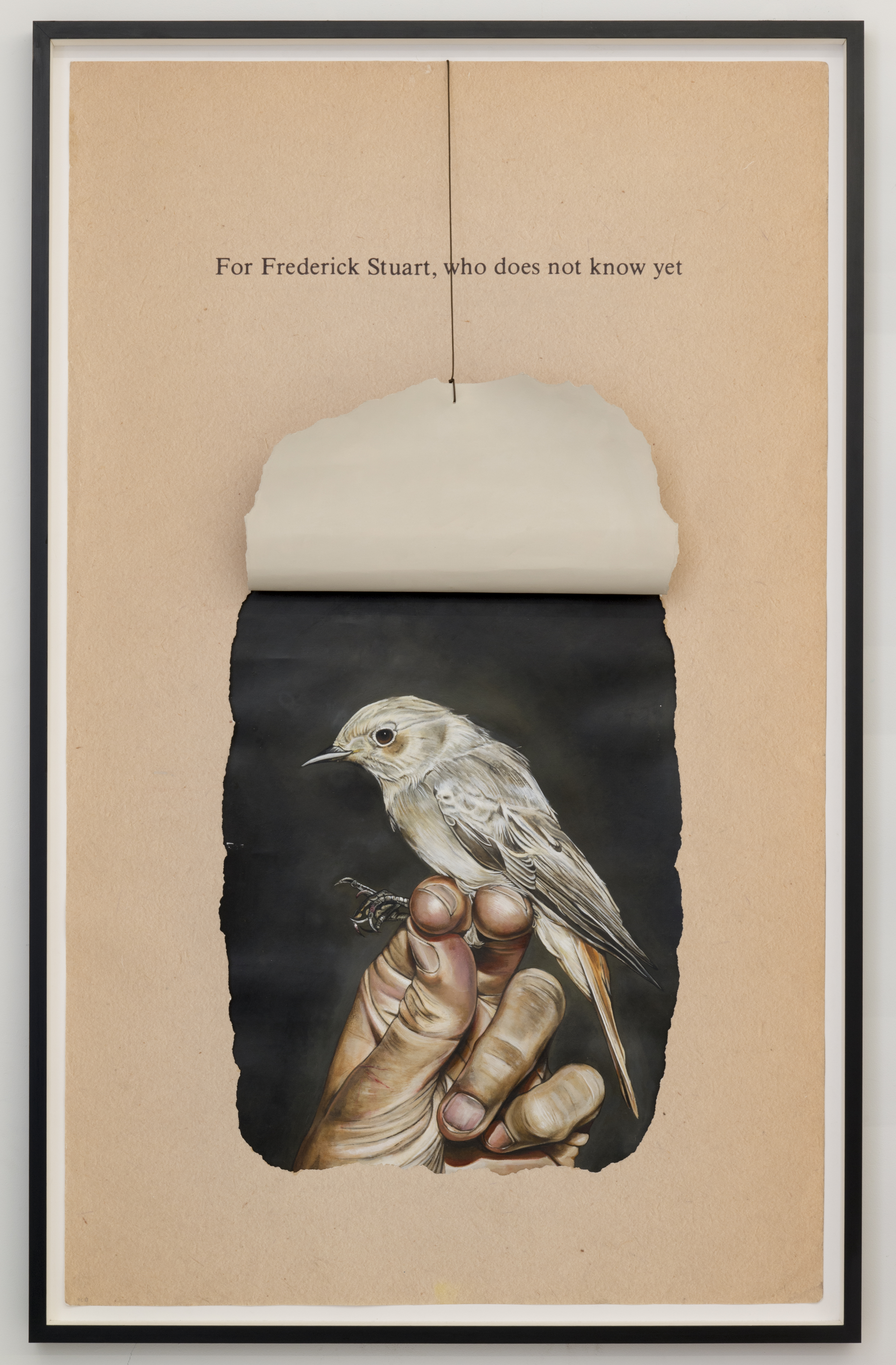 While many works are made from book covers, book pages or books and magazines themselves, many of the works deal in a larger sense with words or semiotics, the shapes of letters or the life of the mind within the realm of “arts and letters”. David Shrigley contributes a lexically disruptive bronze sculpture and a work on paper that hilariously looks at the translation of an artist’s oeuvre into print form via an interview. “Do you draw every day? Yes I draw every day.” Troels Carlsen contributes a trompe l’oeil painting on paper revealing the poetry behind a dedication page of a lost novel; while Jen Mazza investigates what psychological content we bring to a simple painting of a closed Psychology textbook.