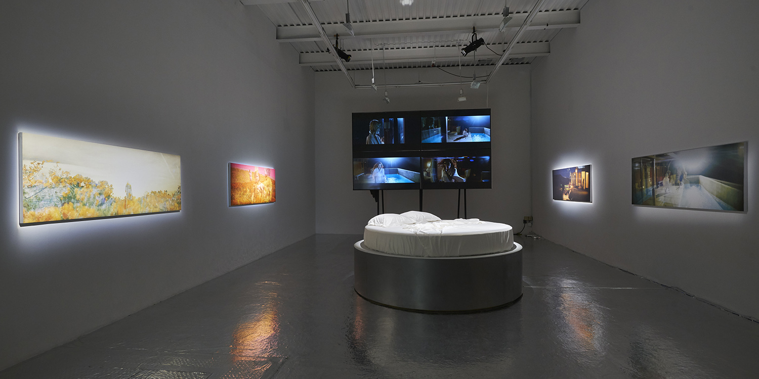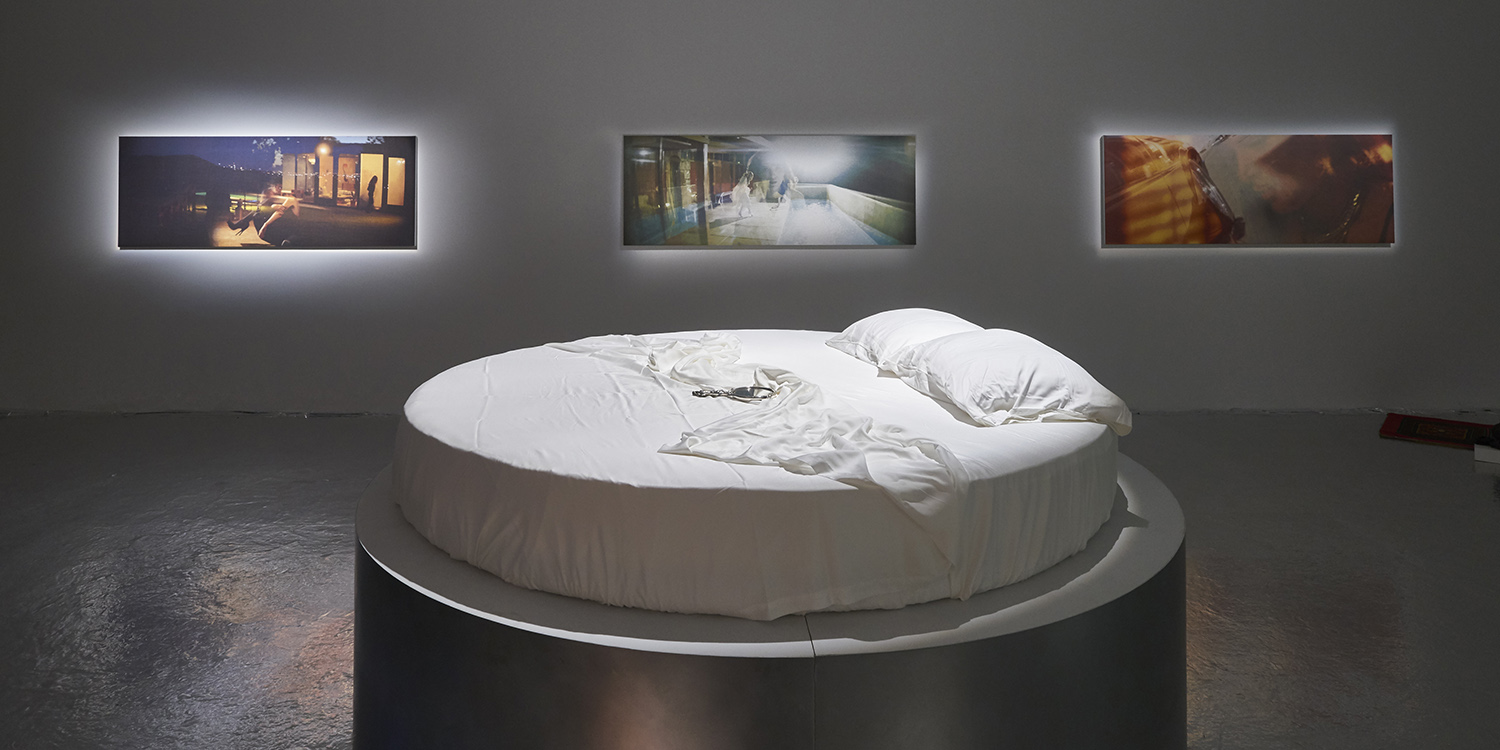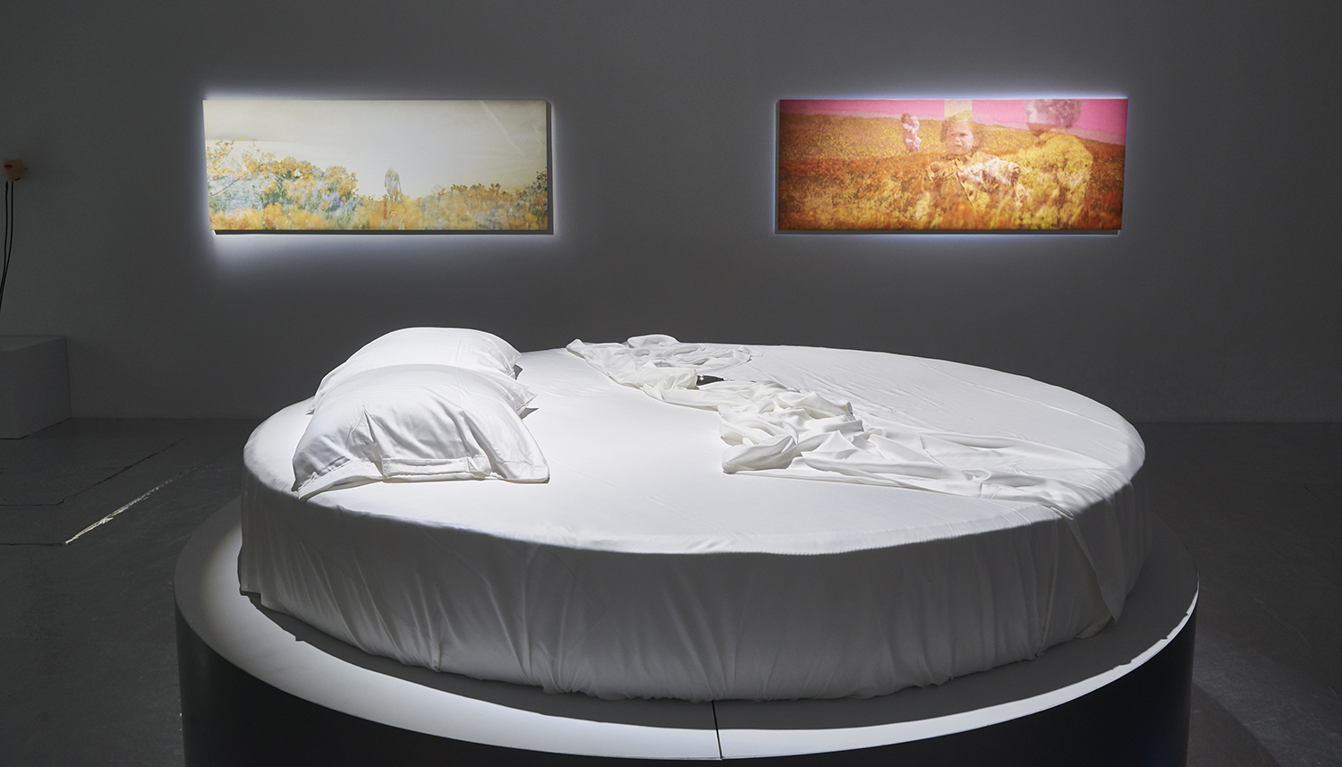 Creating a desert-scape of our subconscious in the film, Subkoff builds an augmented reality through her multi-media installation. The film is about blurring time with longing, pain, beauty, desolation and fear whilst questioning the branded identities of Eve & Adam. The installation introduces a spinning circular bed, a circular mirror installation that looks back at you and other sculptural interventions to induce the sort of hypnotic qualities of the film; to turn the viewer around, literally, and provide multiple reflections of them. Subkoff proposes the following questions: