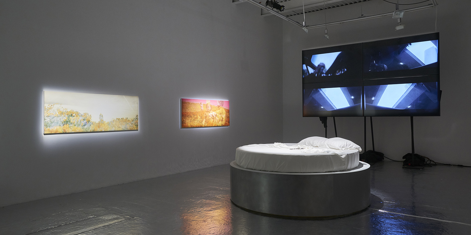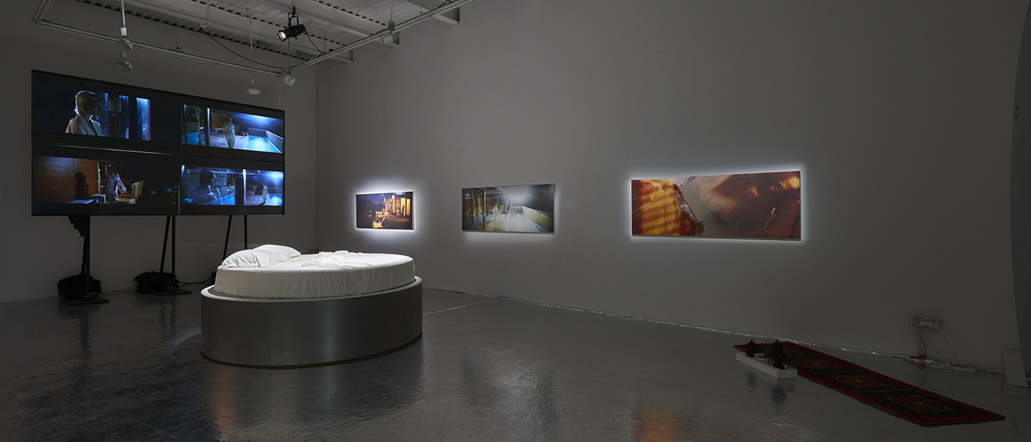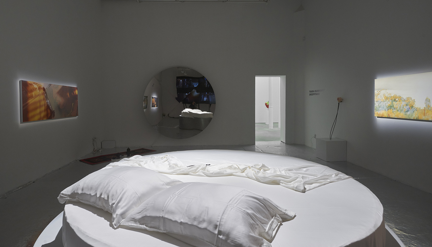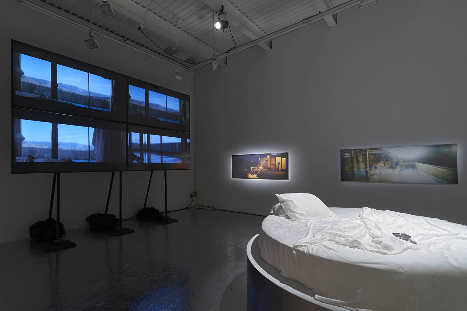 The exhibition consists of a film, rotating bed and mirror installation as well as small sculptures and silkscreened stills. The centerpiece of the show, Deepfake (25min) is a film that switches between one and four frames as it follows the main character Eve around the desert and LA. Eve seems to be experiencing layers of memory and slippages of identity and the viewer is unsure what visual information is reliable and what has been altered.