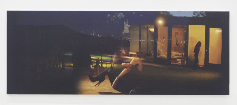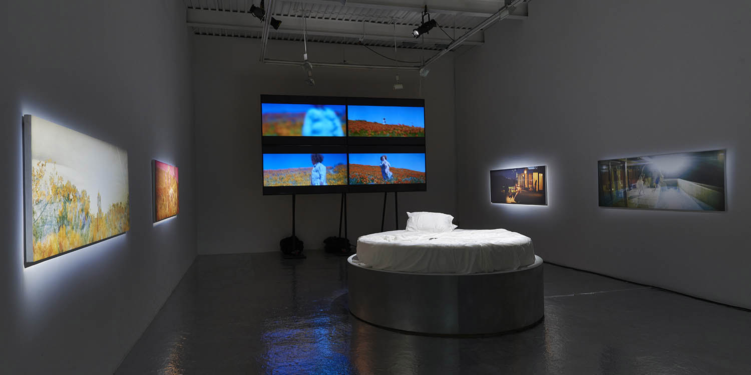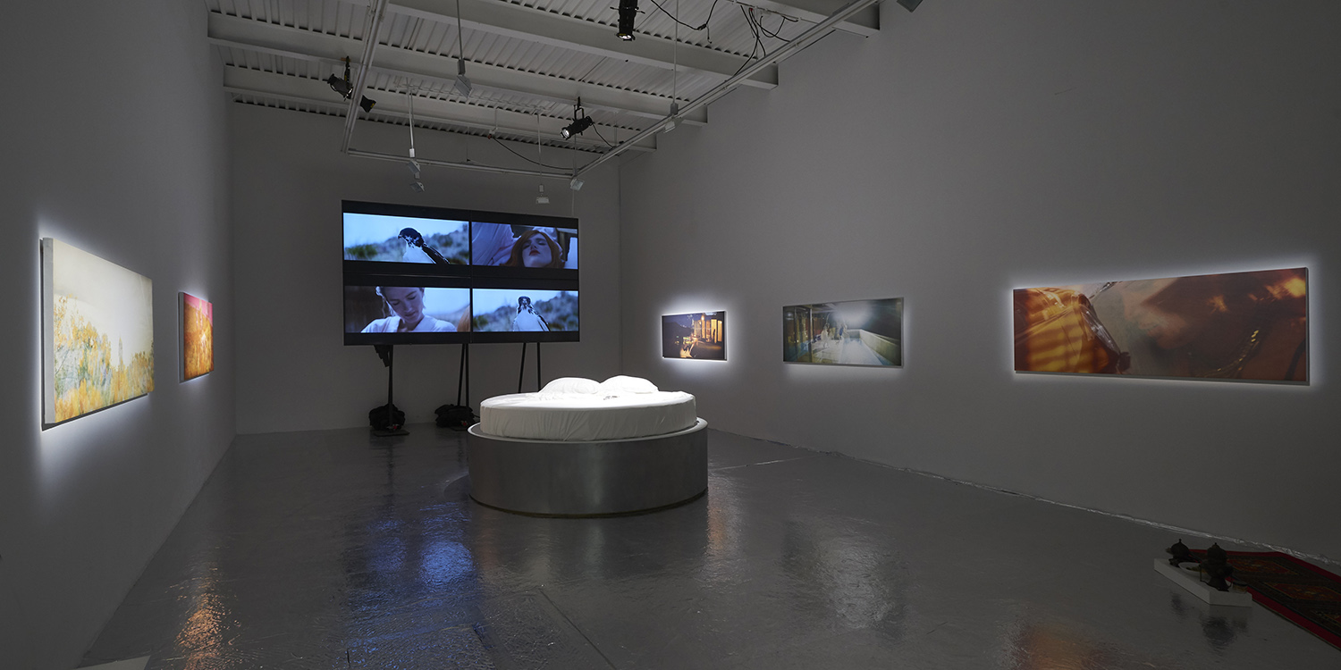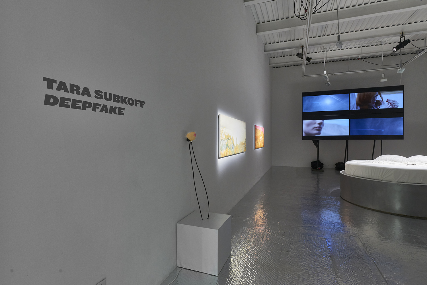 The exhibition consists of a film, rotating bed and mirror installation as well as small sculptures and silkscreened stills. The centerpiece of the show, Deepfake (25min) is a film that switches between one and four frames as it follows the main character Eve around the desert and LA. Eve seems to be experiencing layers of memory and slippages of identity and the viewer is unsure what visual information is reliable and what has been altered.
