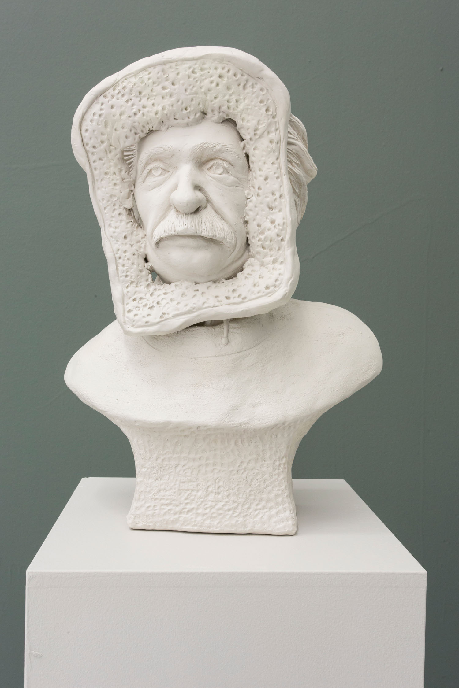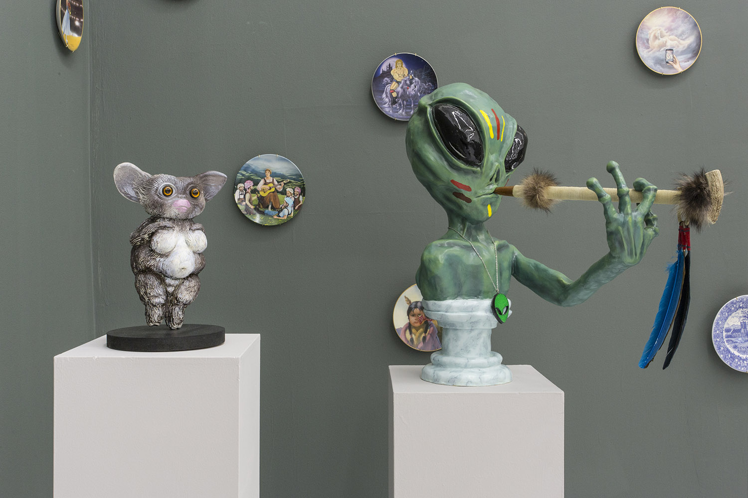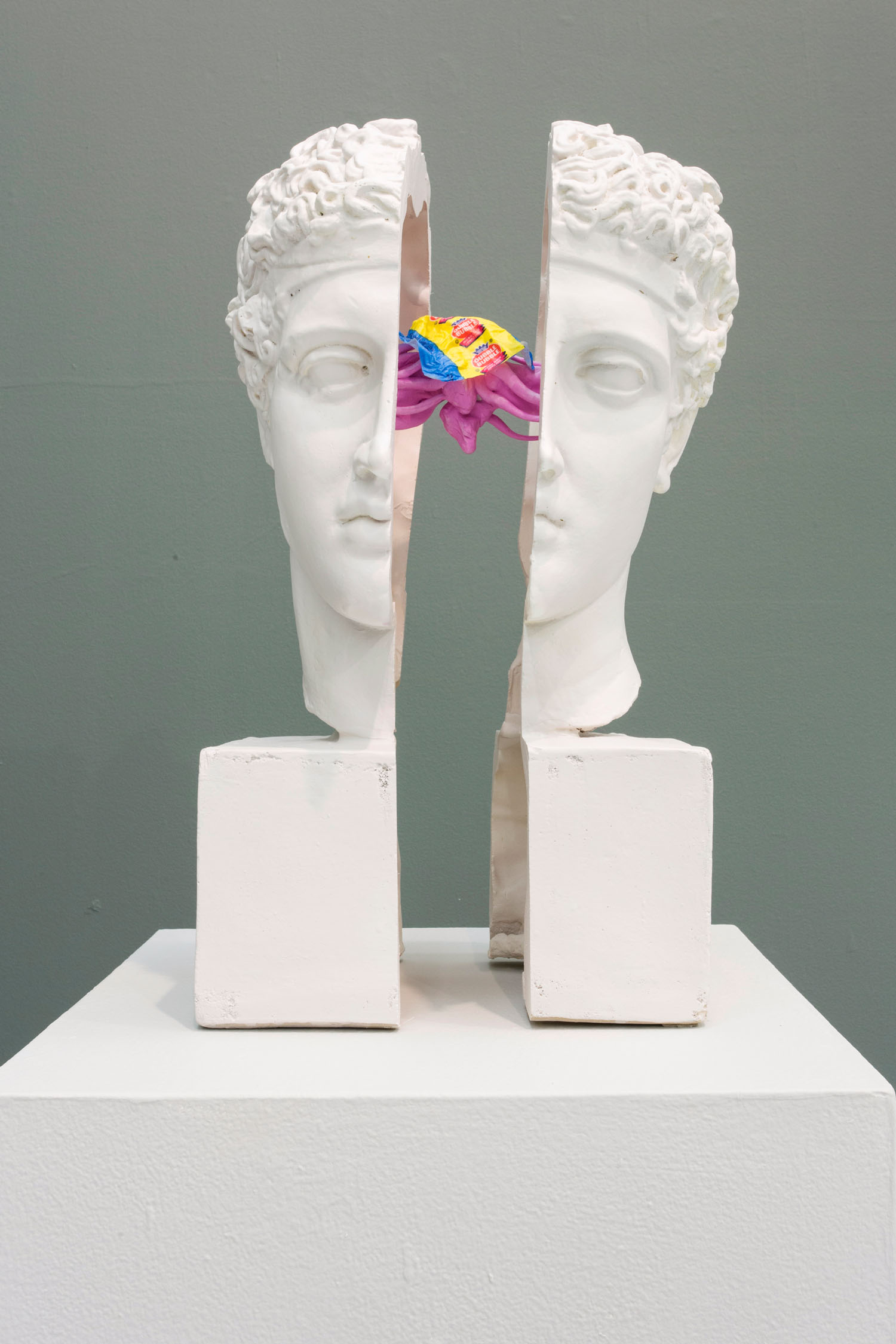 Cultural appropriation is further examined in adulterated busts proliferating on pedestals, where sculpted elements have been added to remix the history depicted–a bust of Einstein reimagined through the “breading” meme–and a replica on the Venus of Willendorf relic meticulously re-sculptued and painted into a zaftig Gremlin.