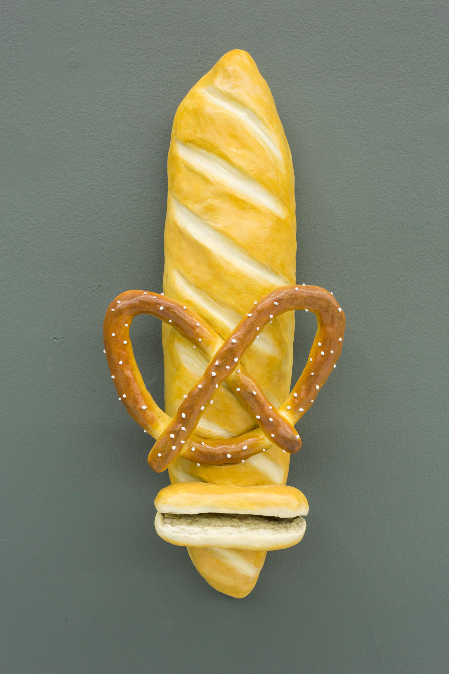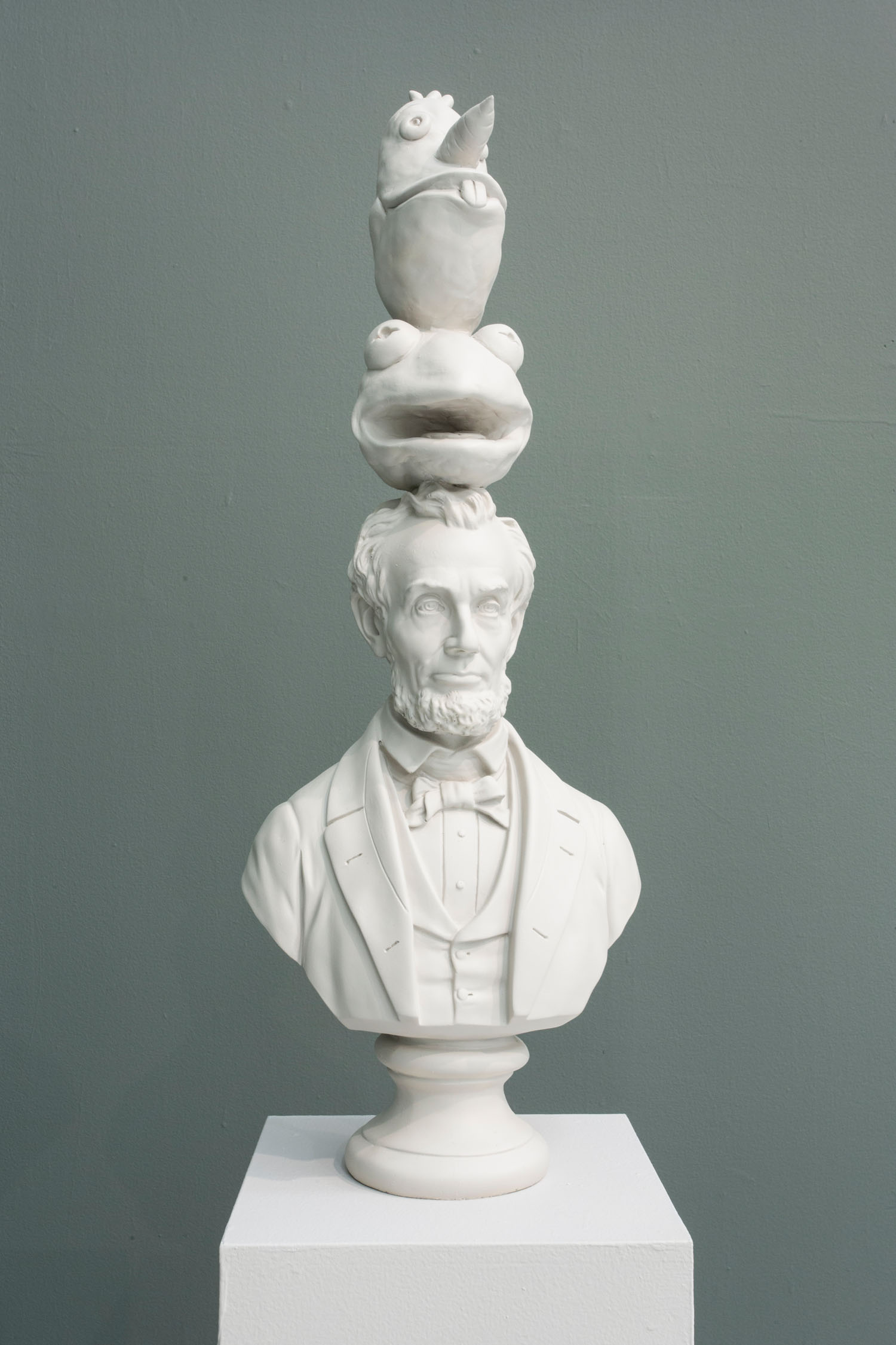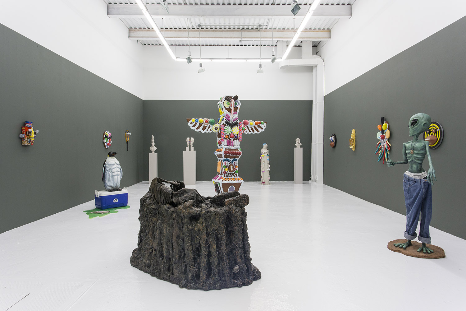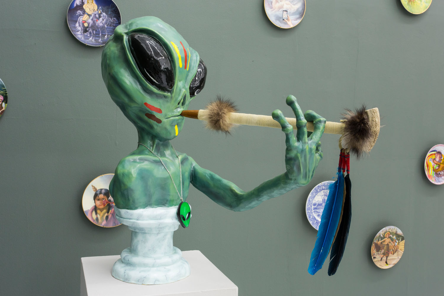 Cultural appropriation is further examined in adulterated busts proliferating on pedestals, where sculpted elements have been added to remix the history depicted–a bust of Einstein reimagined through the “breading” meme–and a replica on the Venus of Willendorf relic meticulously re-sculptued and painted into a zaftig Gremlin.