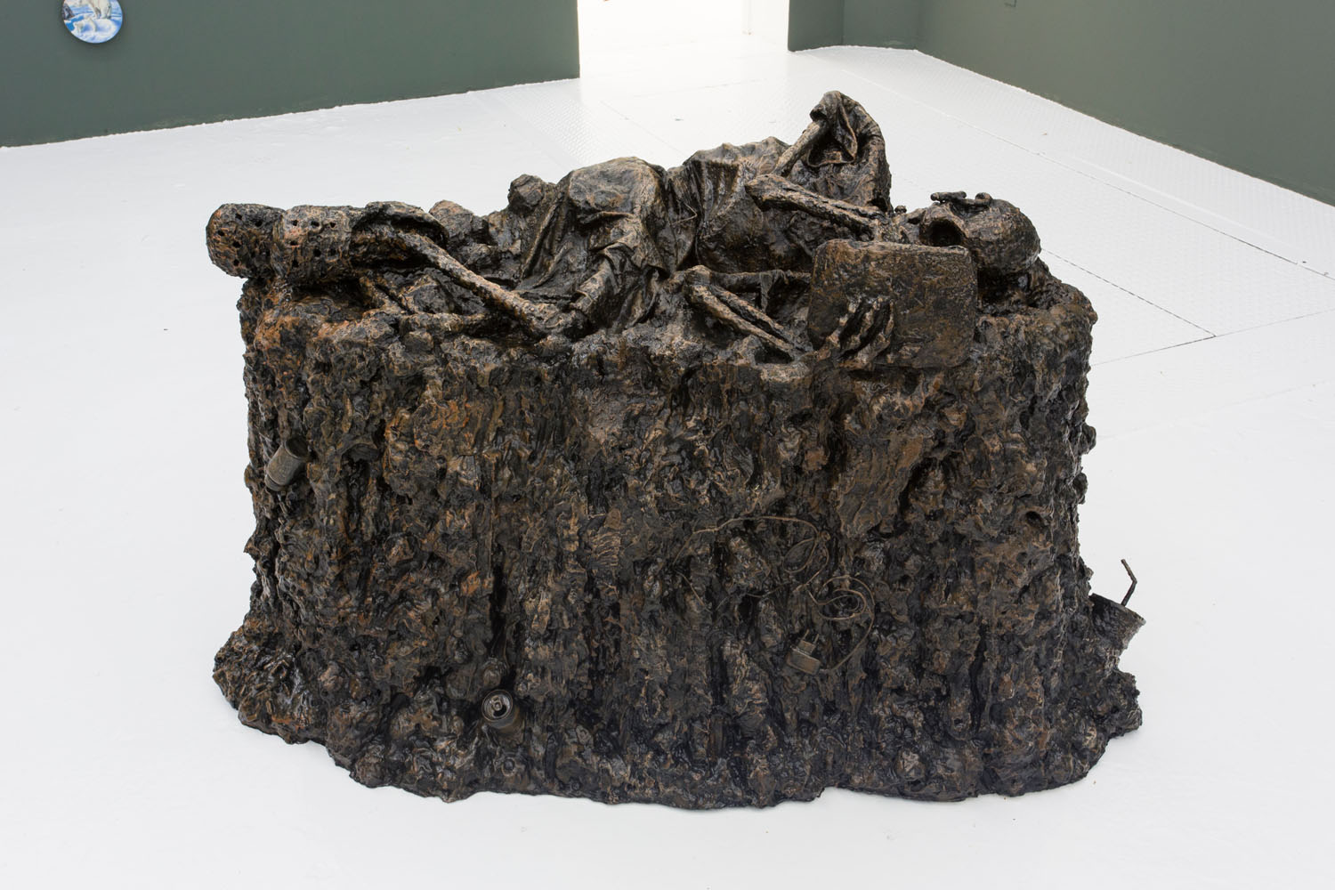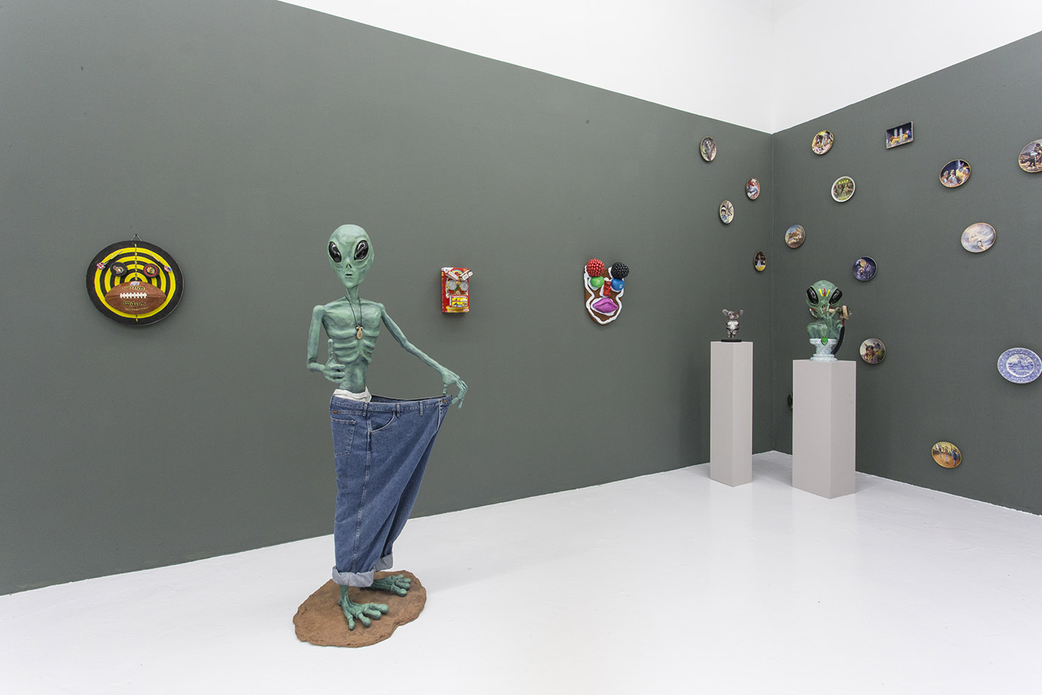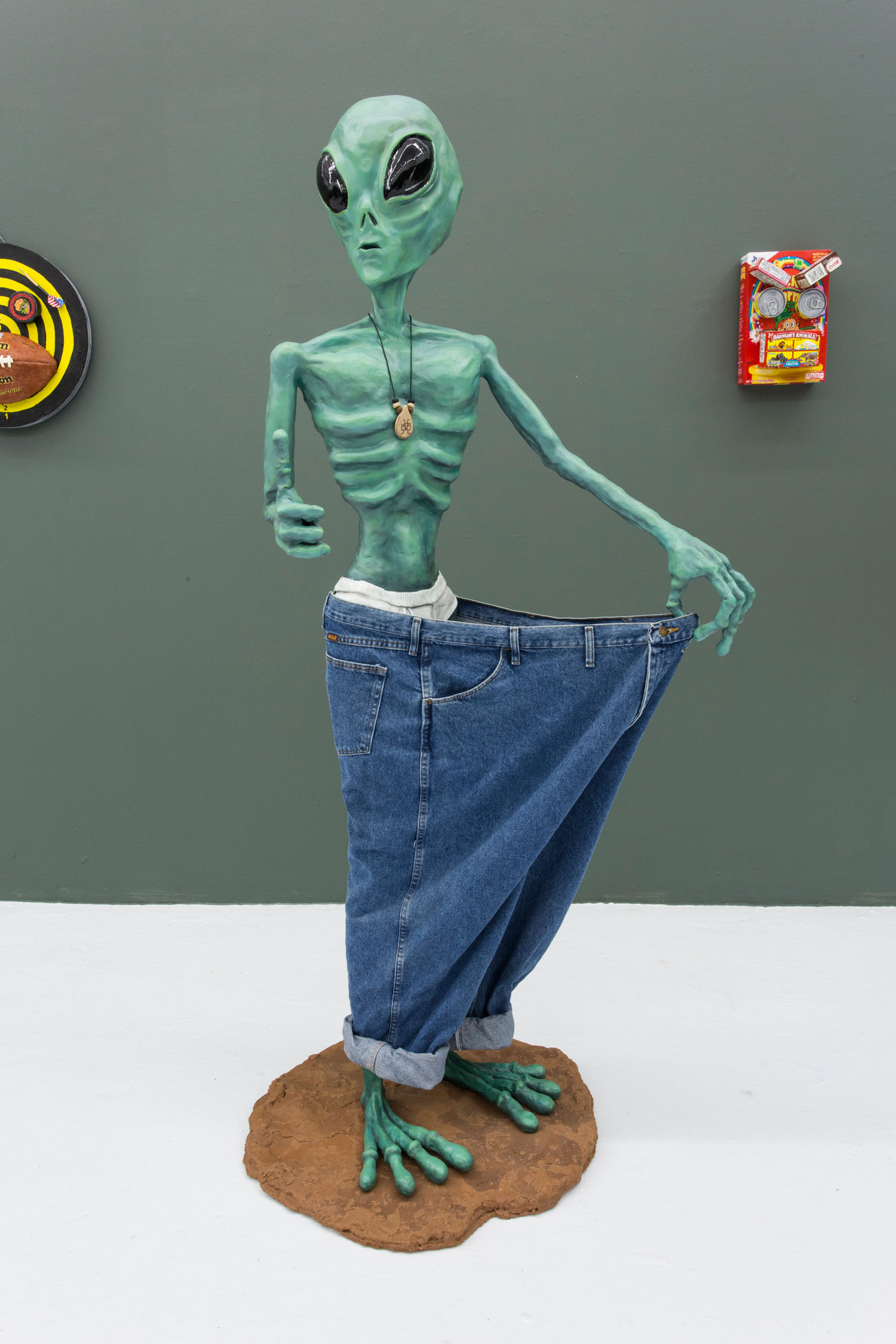 What is all this remixing about? A large sculpture of a skinny stylized alien holding out his enormous jeans à la Jared in a Subway ad crystallizes the self reflexive ridiculousness of the works. Humans love to lose weight and hold up their fat clothes in advertisements to lose weight; an alien must find that insane. Another of the largest sculptures, Charred ’n Charged, enhances this perspective; it depicts a fossilized human skeleton on a sorta funereal mound full of human garbage from coke cans and charger cords. The skeleton appears to be wearing Crocs and clutches an iPad, an inglorious record of our time on earth. Like all elements in the show we are forced to question, “is this what we look like?” and in most cases the embarrassing answer is yes.