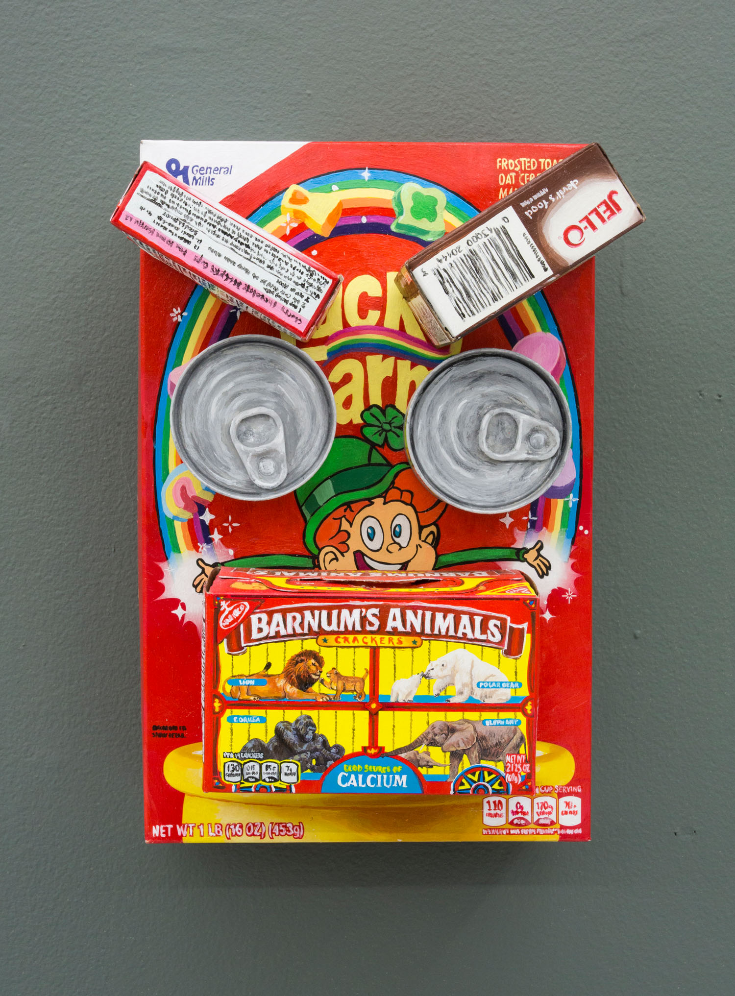 The largest sculpture, M&M Odoodem, Like Totally Totem Polarized, introduces a Google-search visual language that informs their work; a gingerbread house-styled totem pole. Carving the licorice, Mike ’N’ Ikes, gum drops and Snow Caps in a type of self-hardening clay then painting the sculpture, the artists simulate gingerbread and icing architecture festooned with colorful candy. Along the walls gingerbread-styled masks continue this “pantheon” of sorts jumping stylistically around the globe of ancient art and craft with a “because LOL nothing matters” vibe.