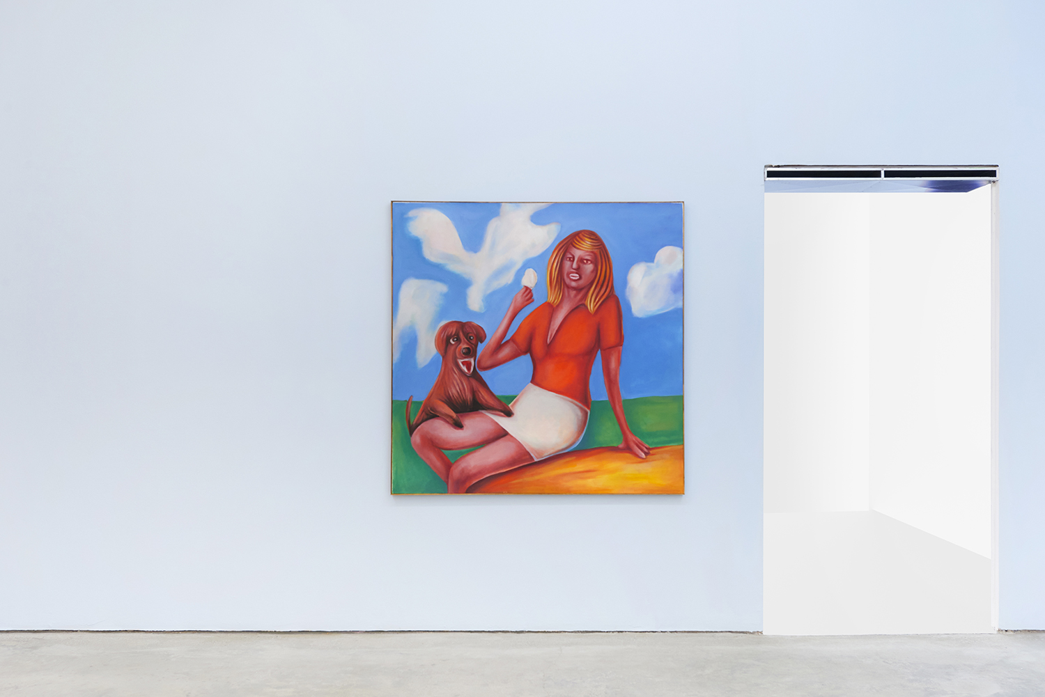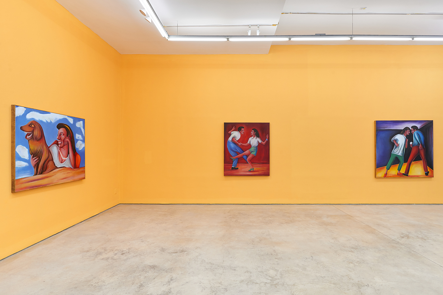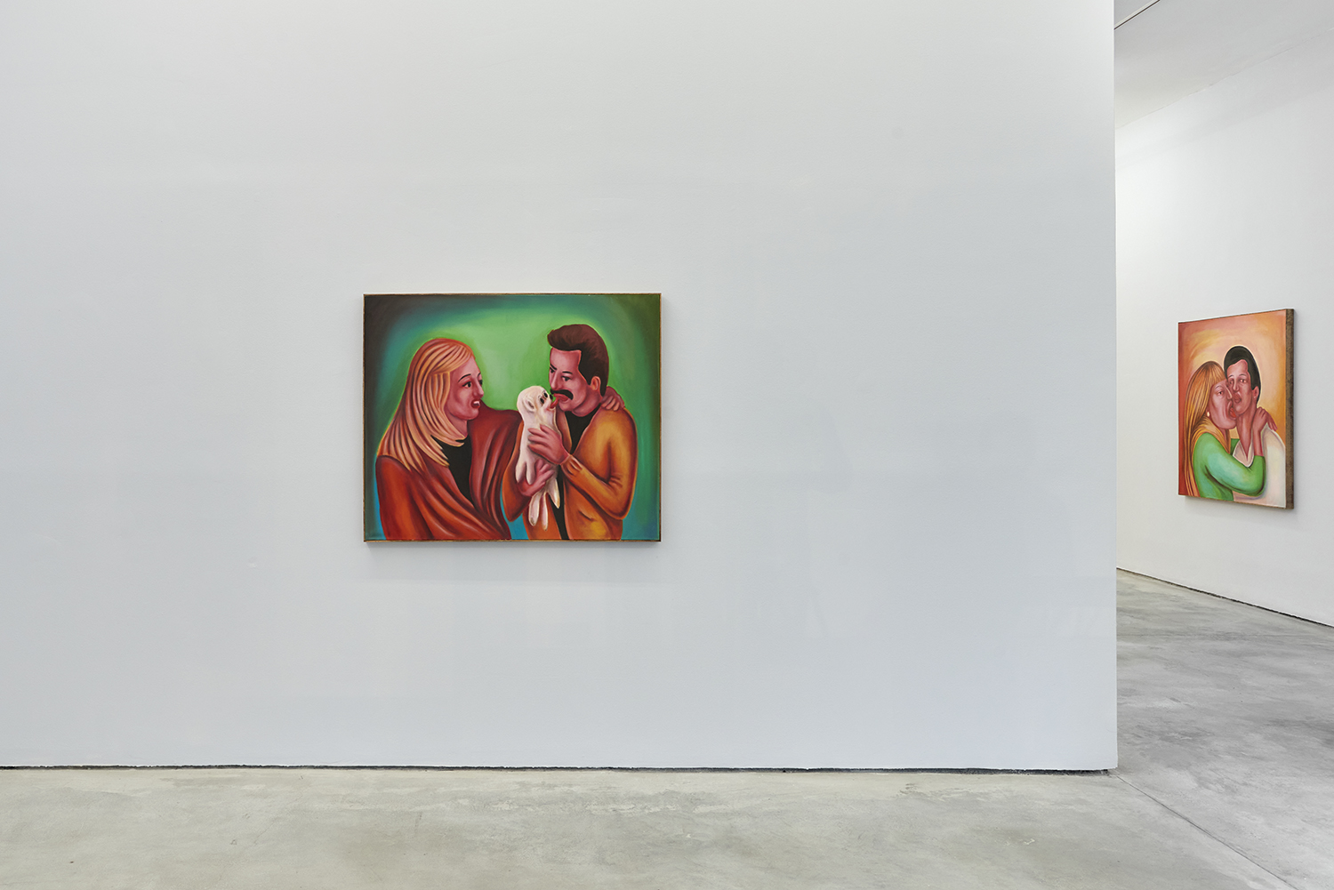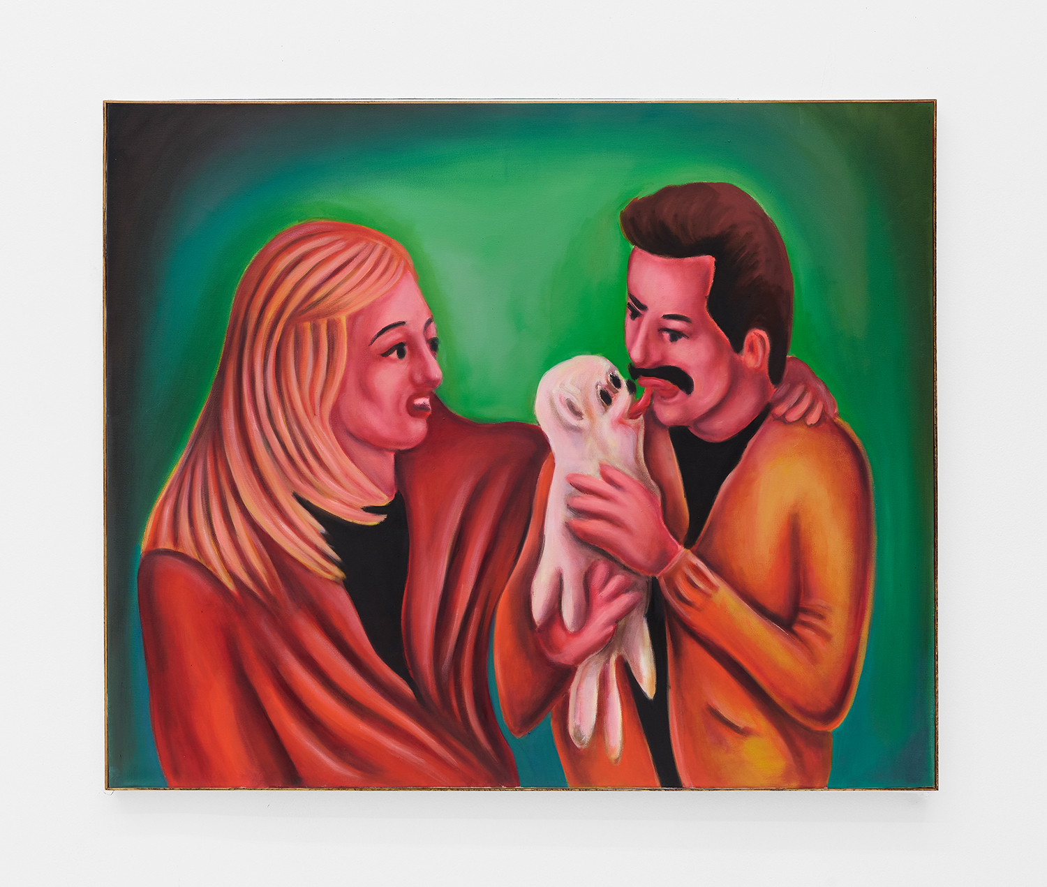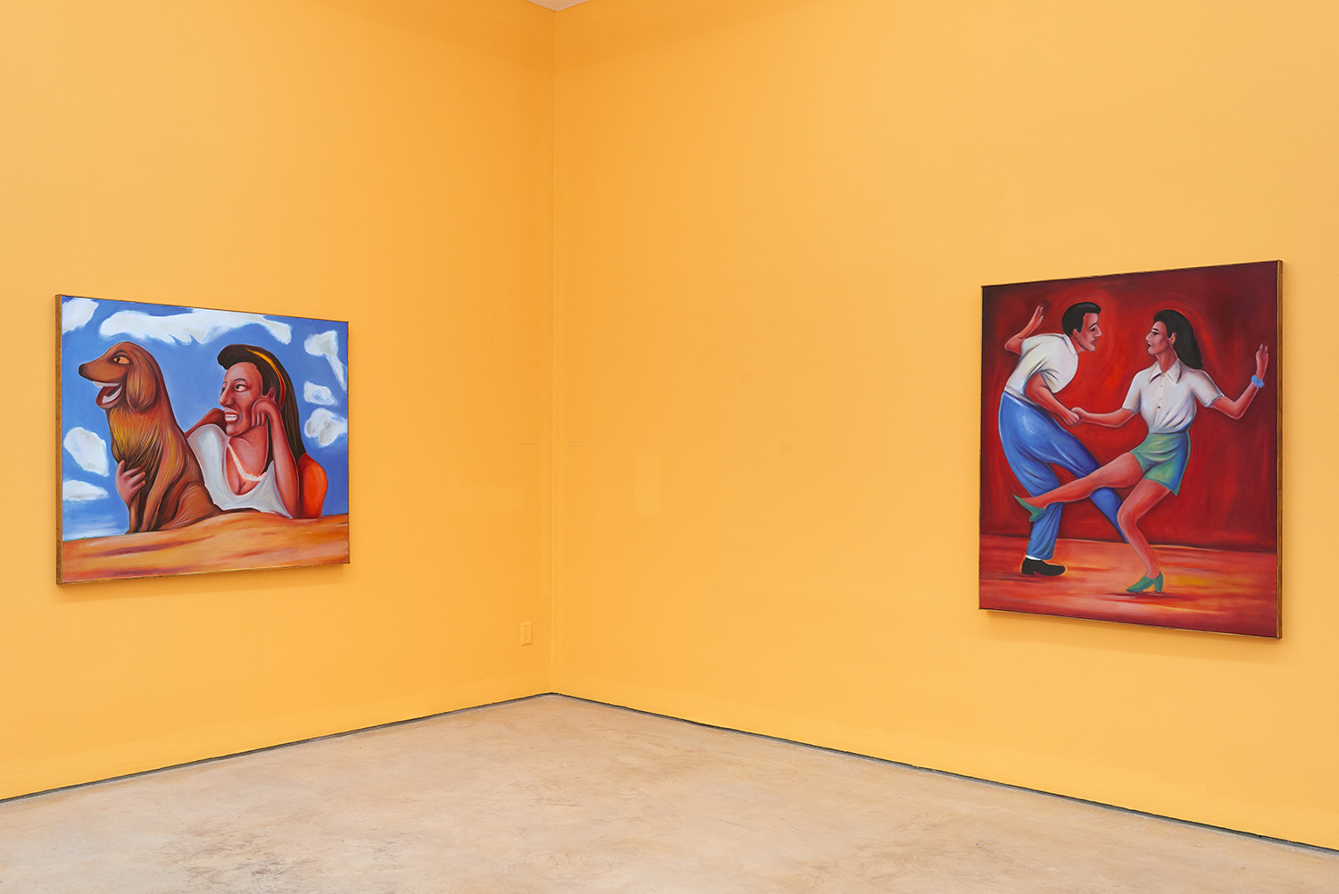 Vassilis’s subjects, from a very popular vaquero to a quartet of slow-dancers, all seem aware of an external gaze, bracing for it. Off-kilter like a thrift store discovery, gnarly like a found photo in a stranger’s family album, these fifteen paintings depict women, couples, dogs, dancing—and lots of ice cream. Scoundrel men, unattractive ladies or the actual puppy dogs offered might be referenced by the title, which here feels like a mandate: “Must Love Dogs.”