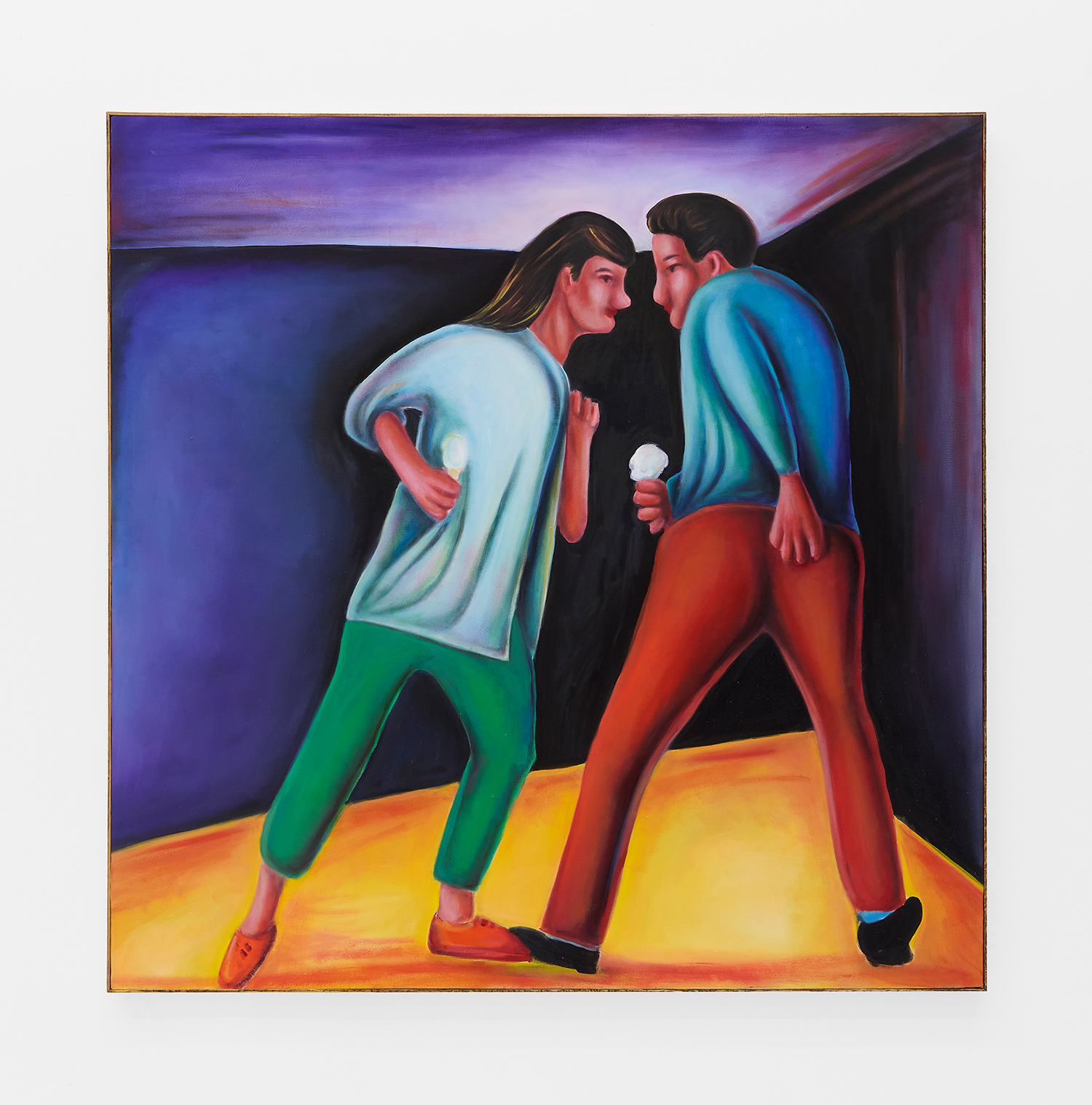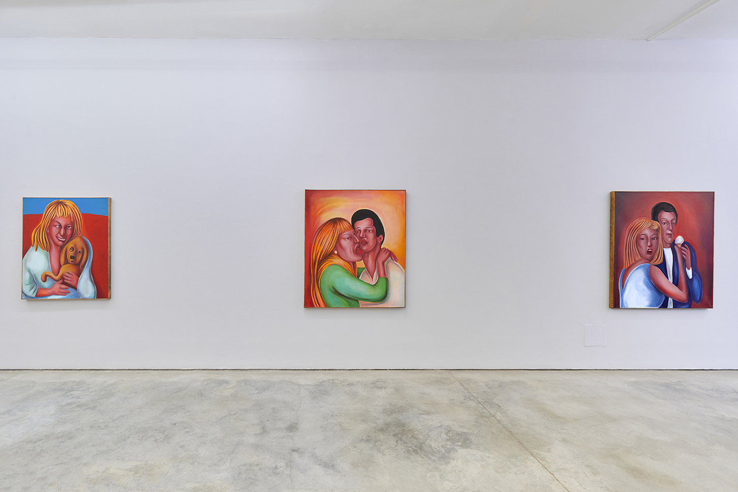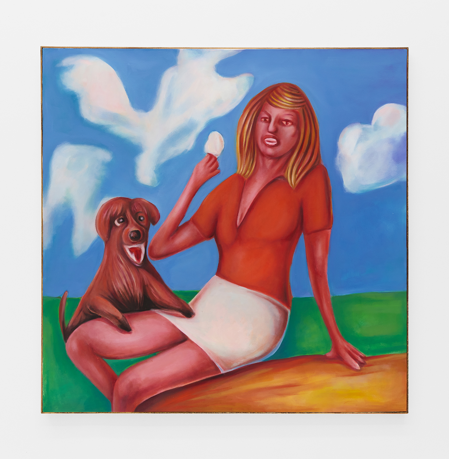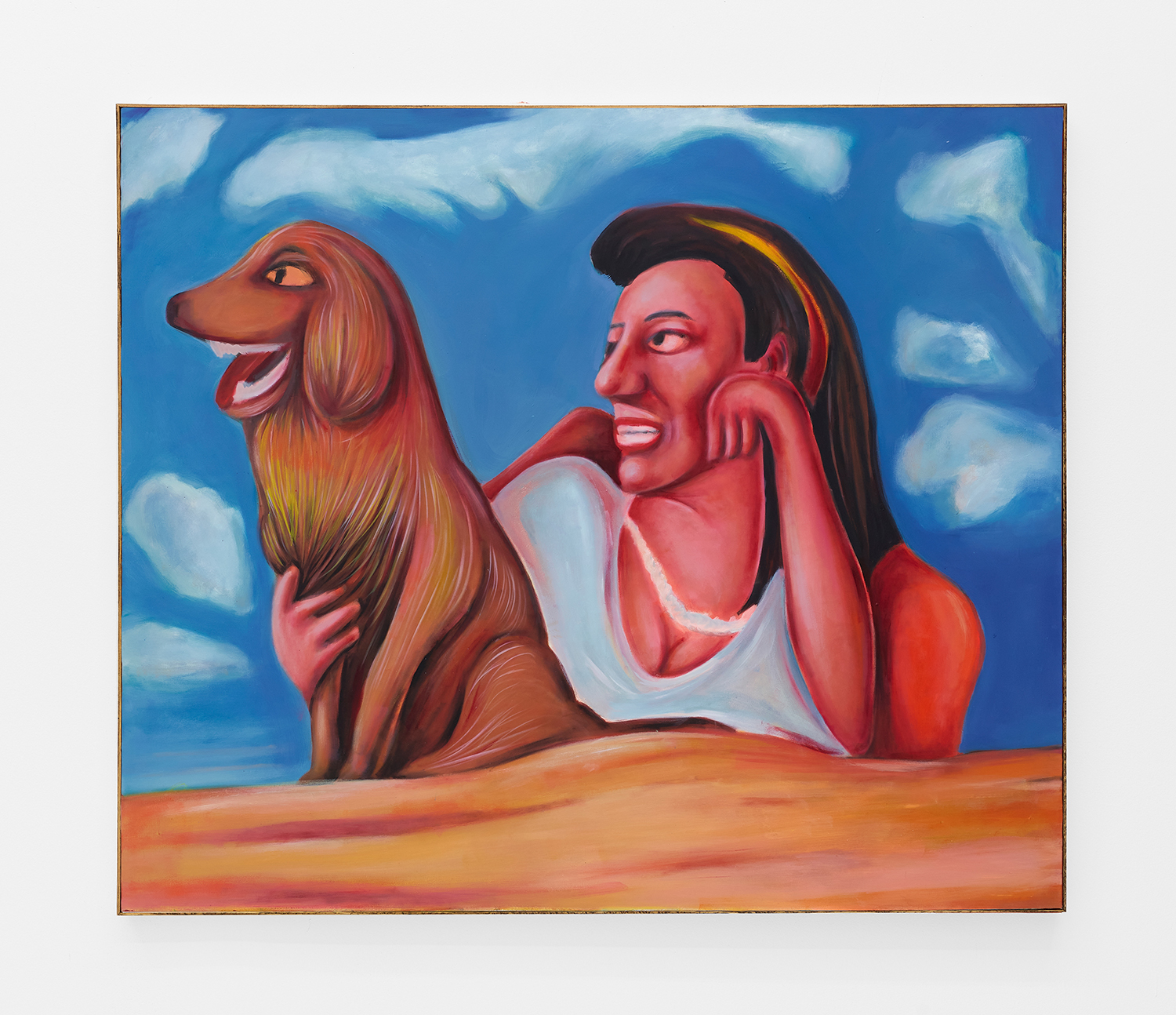 Vassilis’s subjects, from a very popular vaquero to a quartet of slow-dancers, all seem aware of an external gaze, bracing for it. Off-kilter like a thrift store discovery, gnarly like a found photo in a stranger’s family album, these fifteen paintings depict women, couples, dogs, dancing—and lots of ice cream. Scoundrel men, unattractive ladies or the actual puppy dogs offered might be referenced by the title, which here feels like a mandate: “Must Love Dogs.”