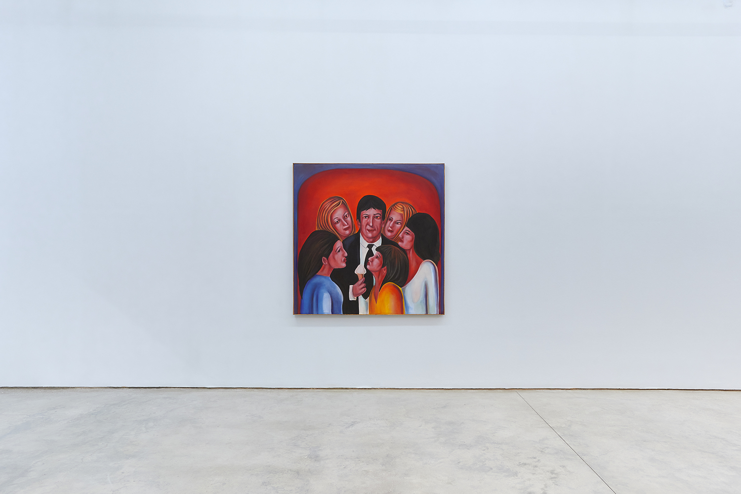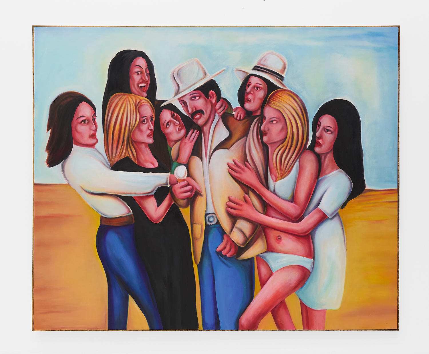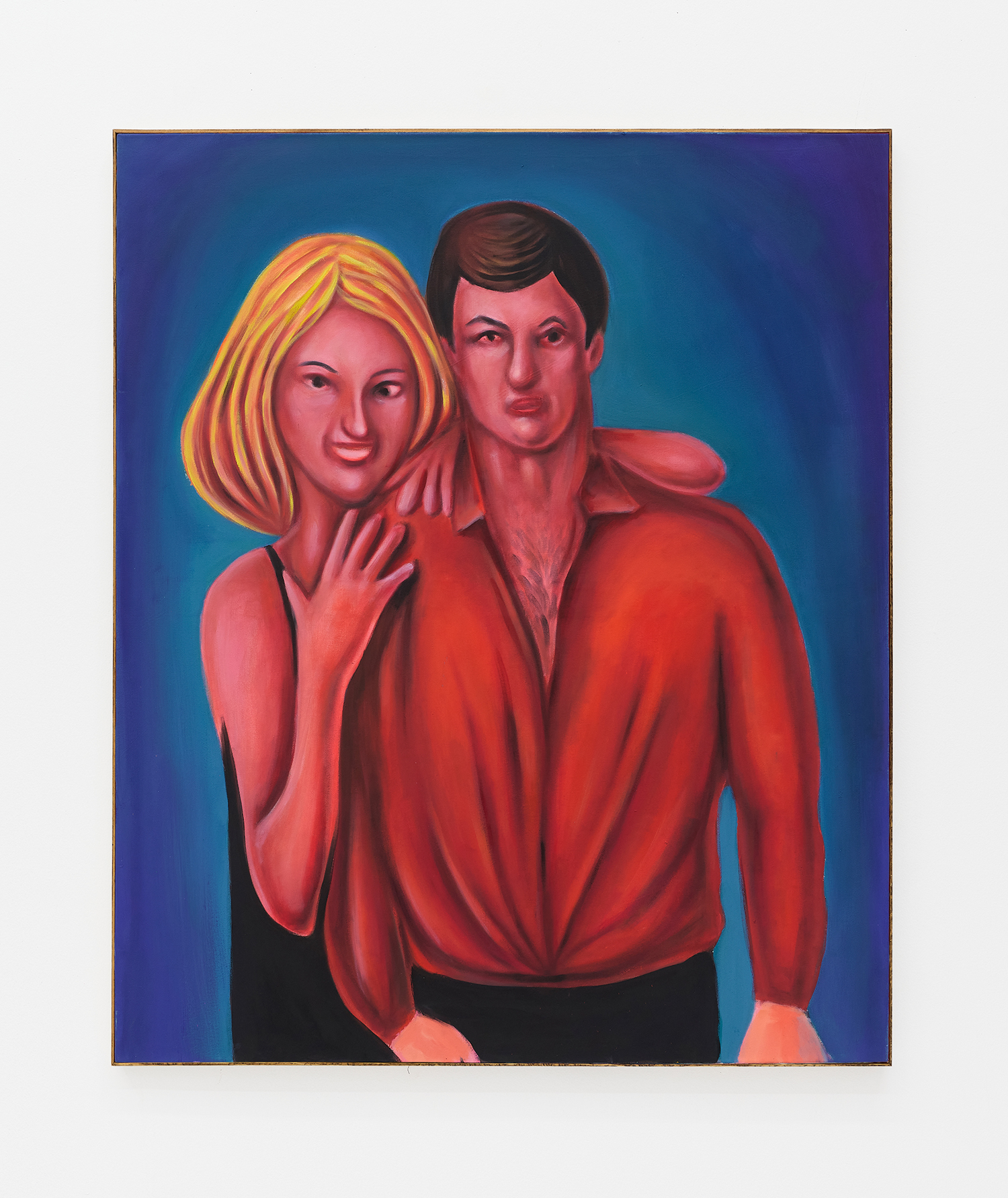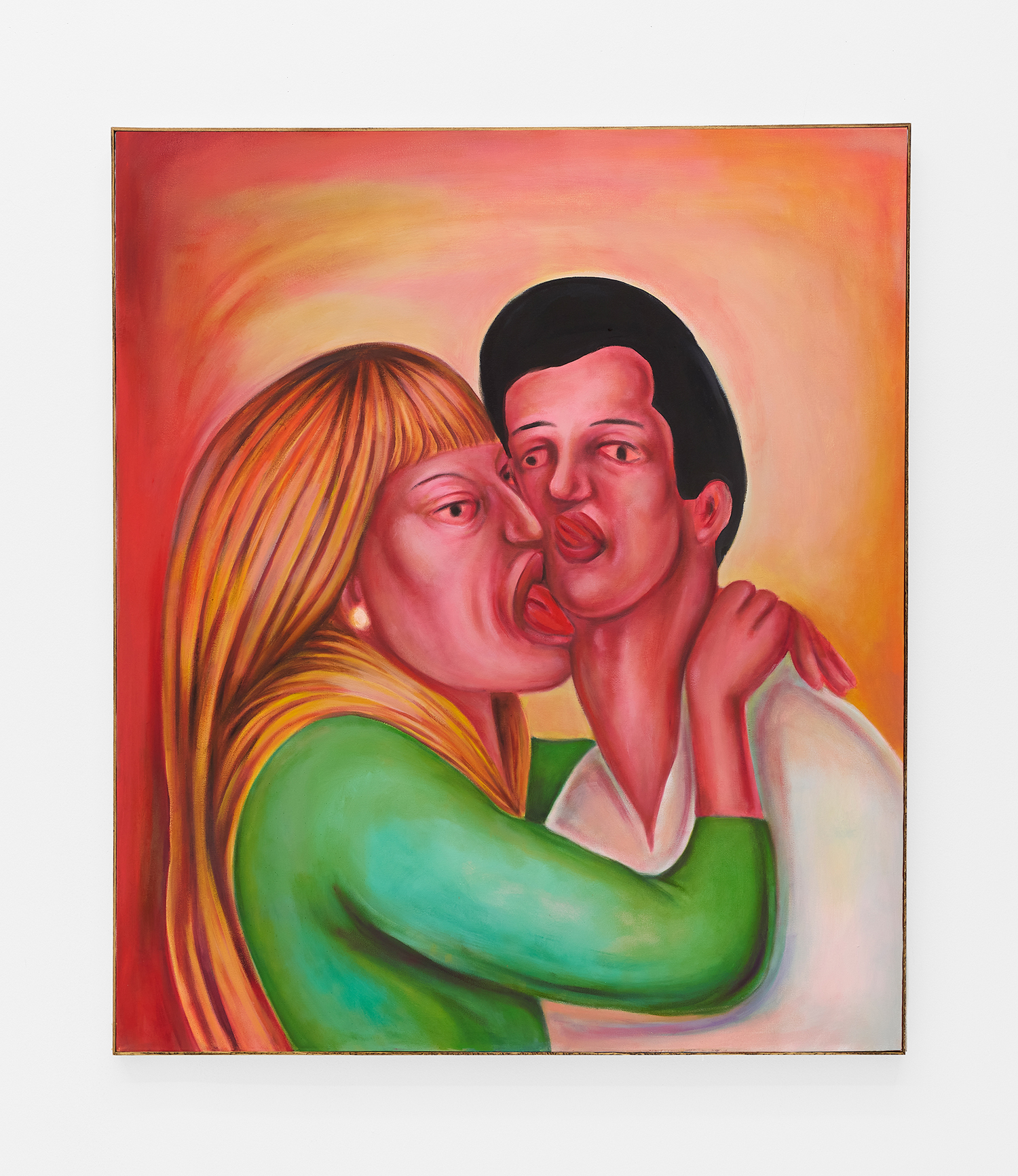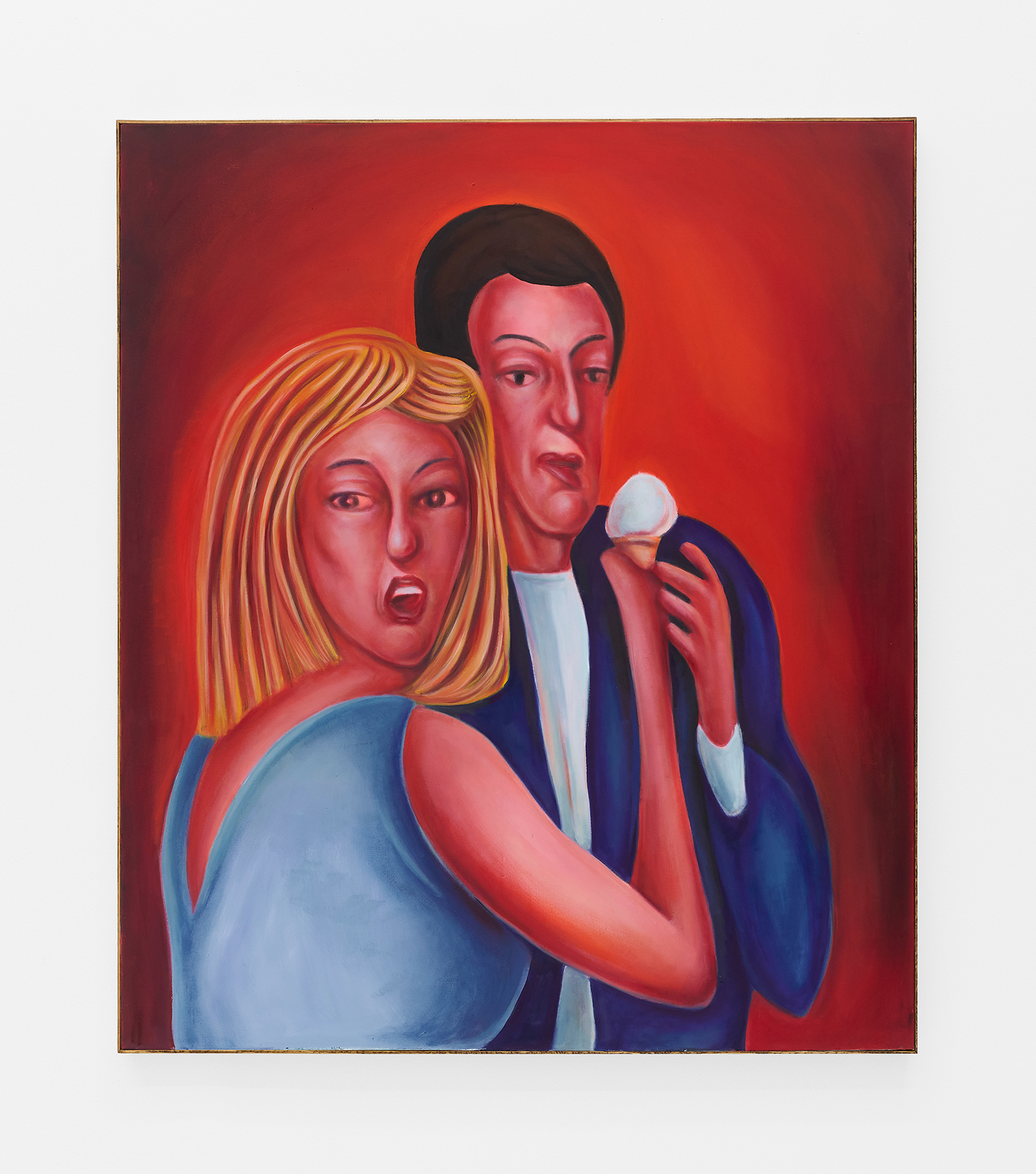 Stylistically, the paintings rethink the formal language of contemporary realism, referencing the sure-handed style of social realists like Thomas Hart Benton and the genre-bending irreverence of George Condo. There is deliberate brutality in the way subjects’ faces are rendered, their lazy red eyes and smushed-putty features seem to confront us with our voyeurism as if it is a joke we share: if you’ve ever accidentally opened the front camera on your phone, you already get it.