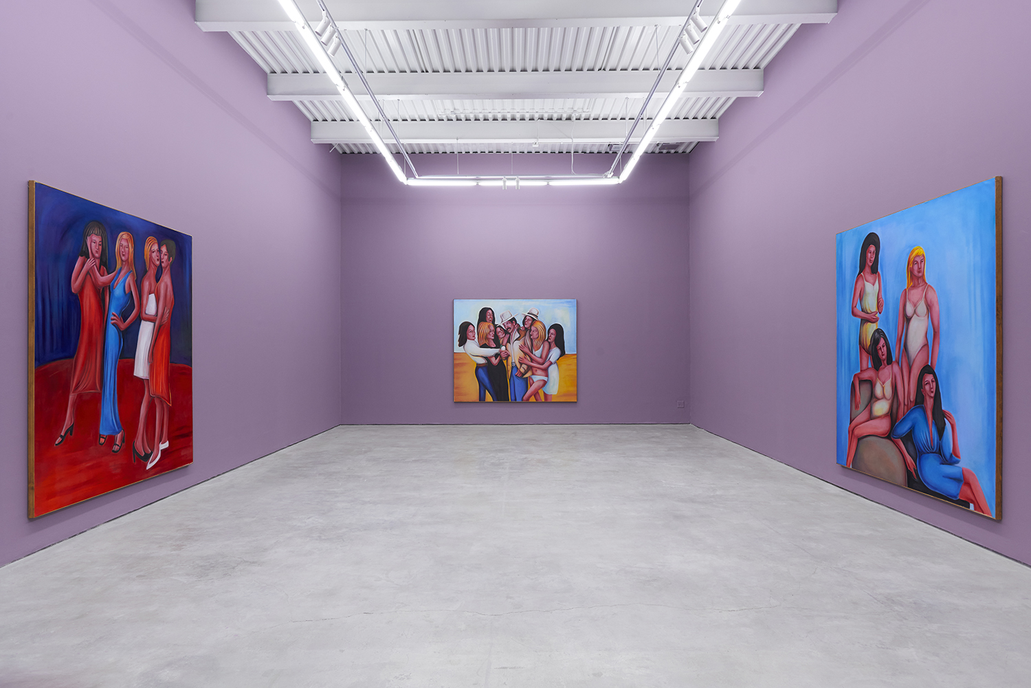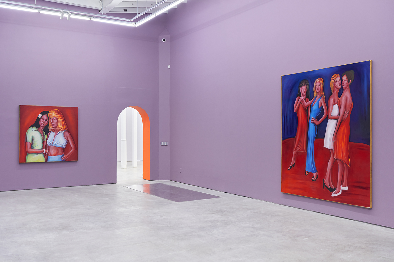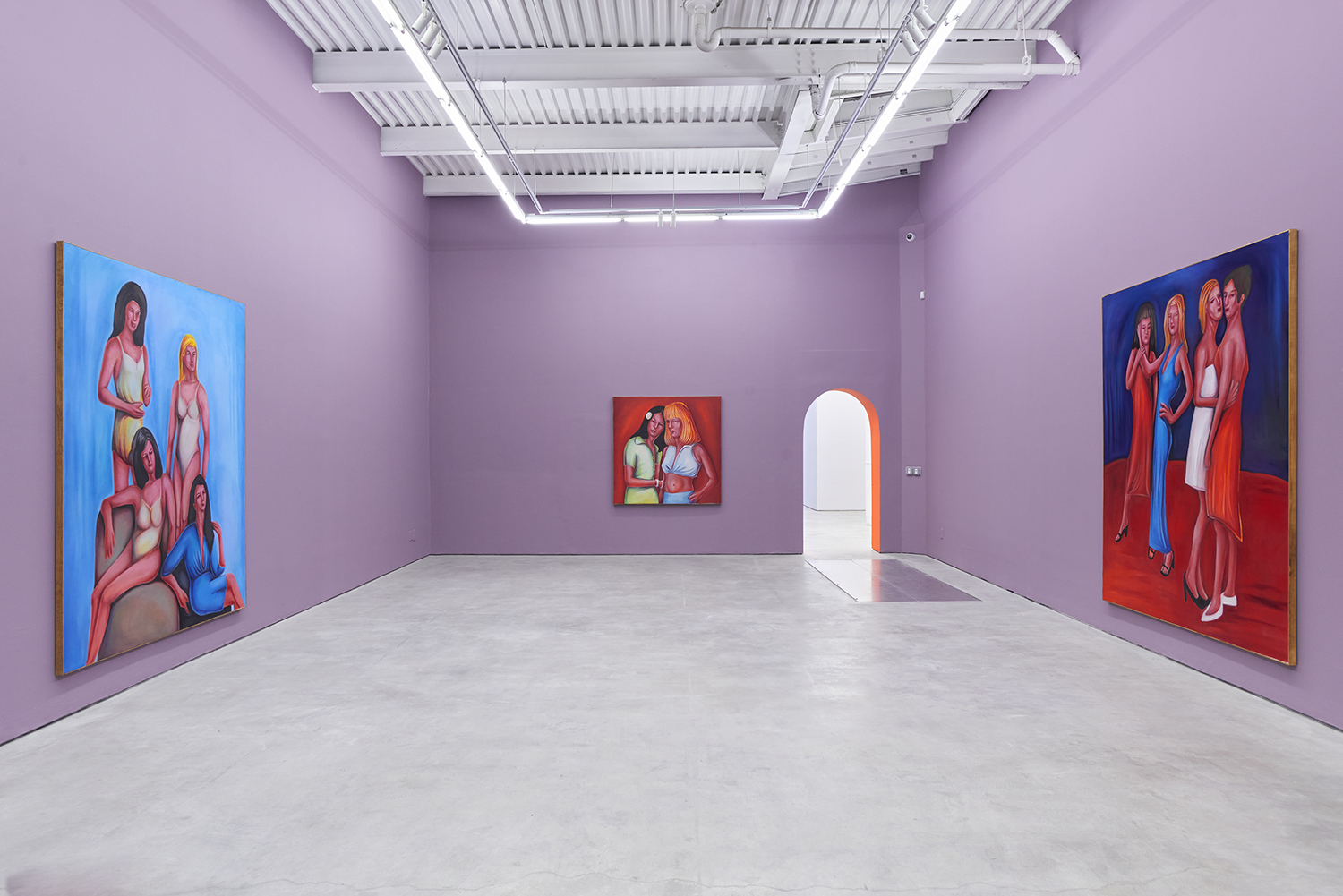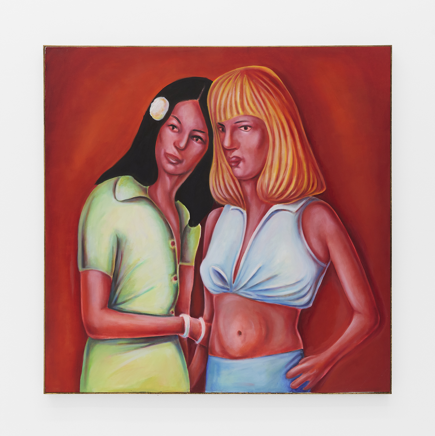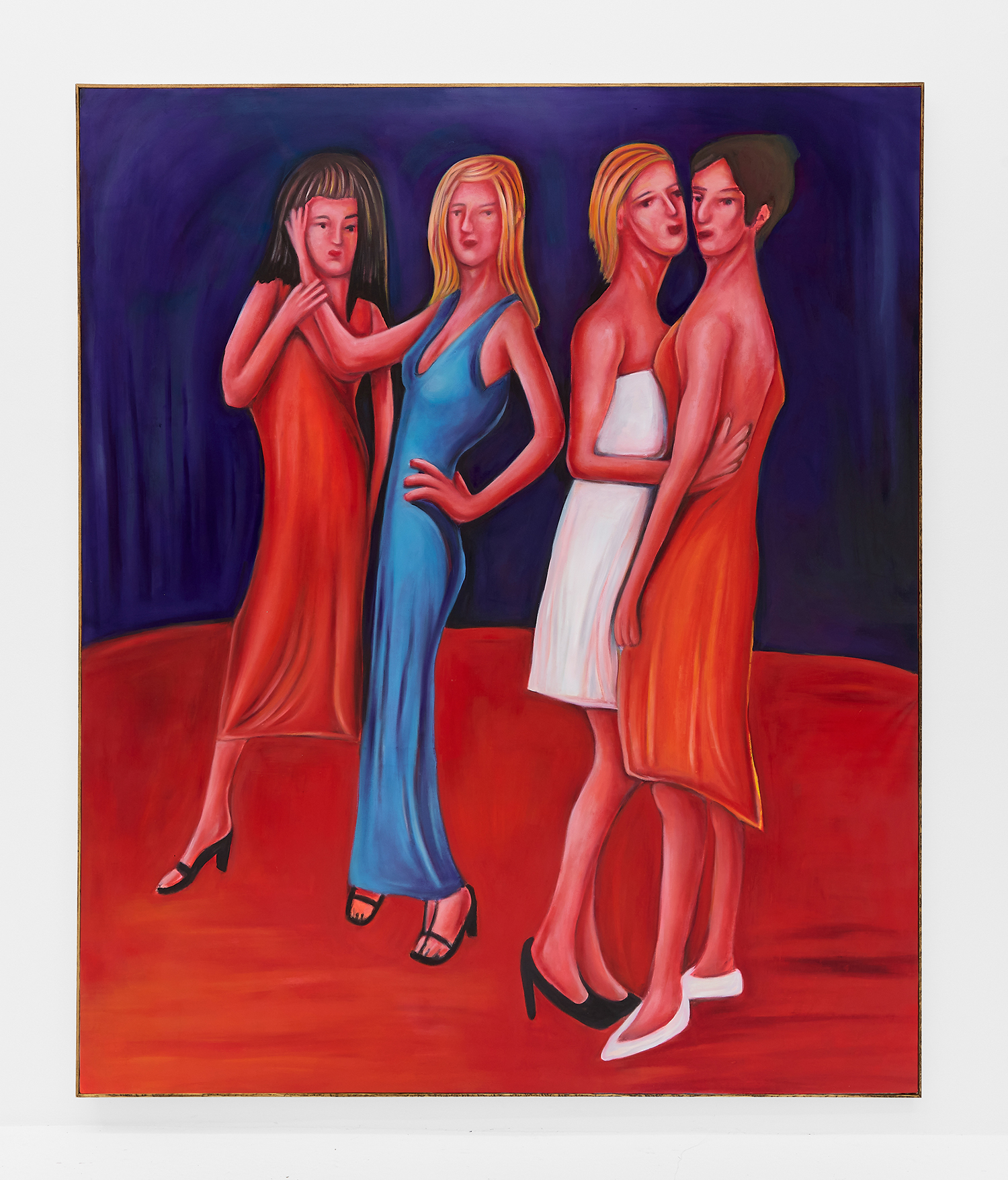 Stylistically, the paintings rethink the formal language of contemporary realism, referencing the sure-handed style of social realists like Thomas Hart Benton and the genre-bending irreverence of George Condo. There is deliberate brutality in the way subjects’ faces are rendered, their lazy red eyes and smushed-putty features seem to confront us with our voyeurism as if it is a joke we share: if you’ve ever accidentally opened the front camera on your phone, you already get it.