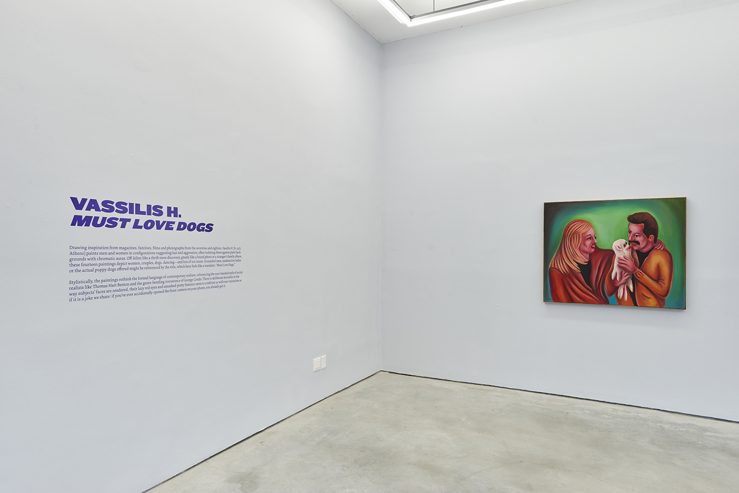 NEW YORK, N.Y. — The Hole is delighted to announce the first New York show of paintings by Greek artist Vassilis H. (b. 1977, Athens), entitled Must Love Dogs. Drawing inspiration from magazines, fanzines, films and photographs from the seventies and eighties, Vassilis paints men and women in configurations suggesting themes of lust and aggression, often isolating them against plain backgrounds with chromatic auras.