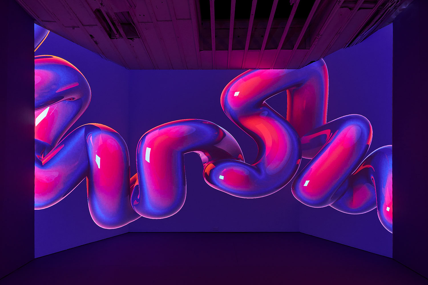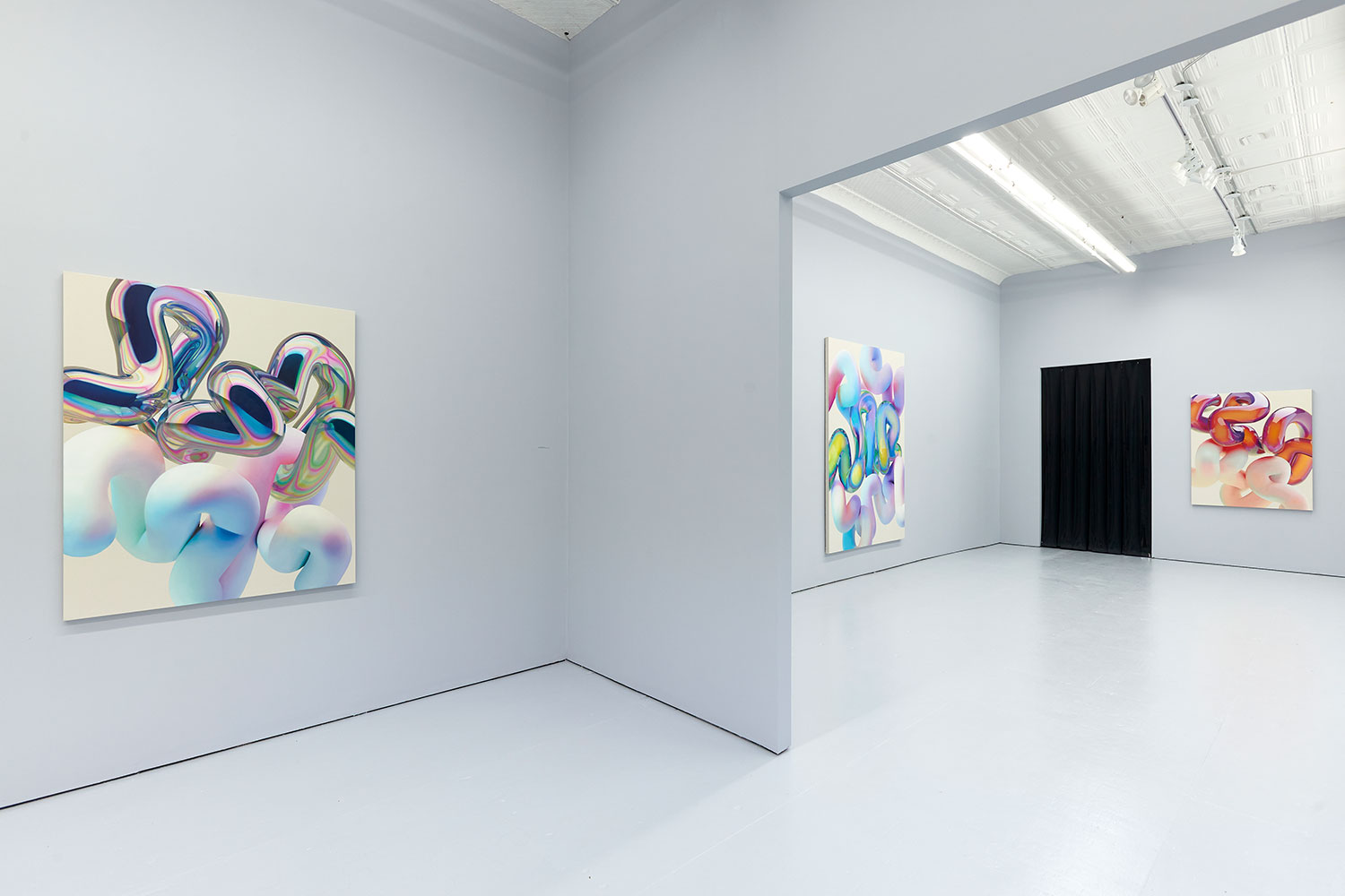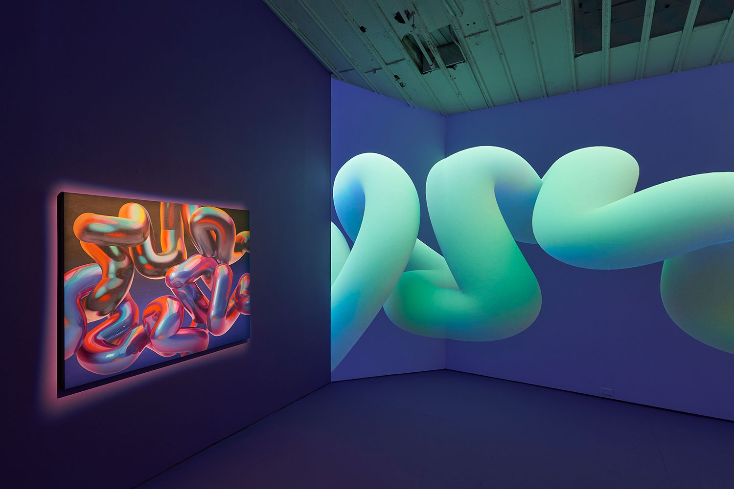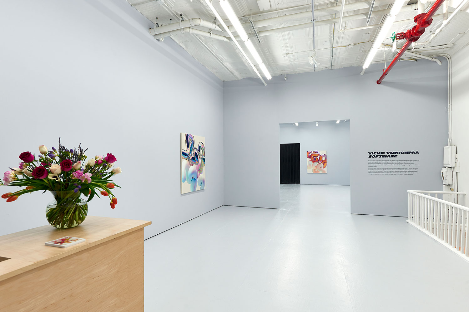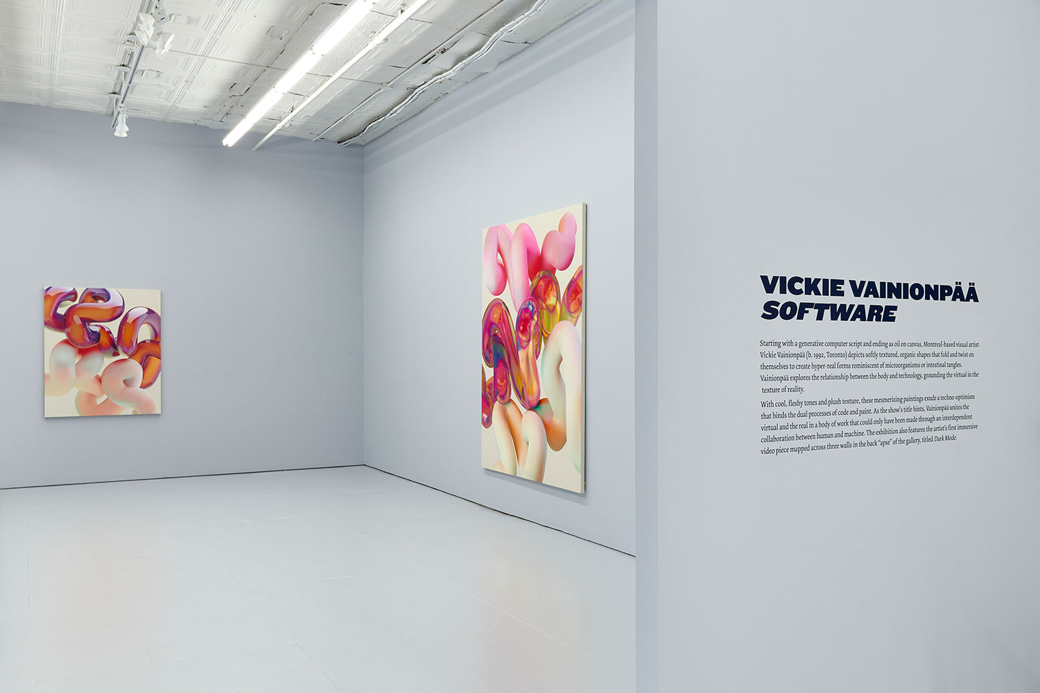 A continuation of Vainionpää’s Soft Body Dynamics series, the paintings for Software feature curvilinear shapes that bend and protrude, twisting into biomorphic forms that are non-representational yet familiar. With their cool, fleshy tones and plush texture, a certain exuberance exists in the work, giving way to a sense of techno-optimism that binds the dual process of code and paint. In addition to this series of paintings, the exhibition will also feature the artist’s first immersive video piece mapped across three walls in the back "apse" of the gallery, titled Dark Mode. Contrasting Vainionpää’s traditionally light, ethereal, and optimistic style of painting, the video installation plays with colors, textures, and lighting that are moody and nocturnal. The 5-minute long 4K looping video is accompanied by a unique synth score written specifically for the project by Montreal musician Nick Schofield to create a sensory experience.