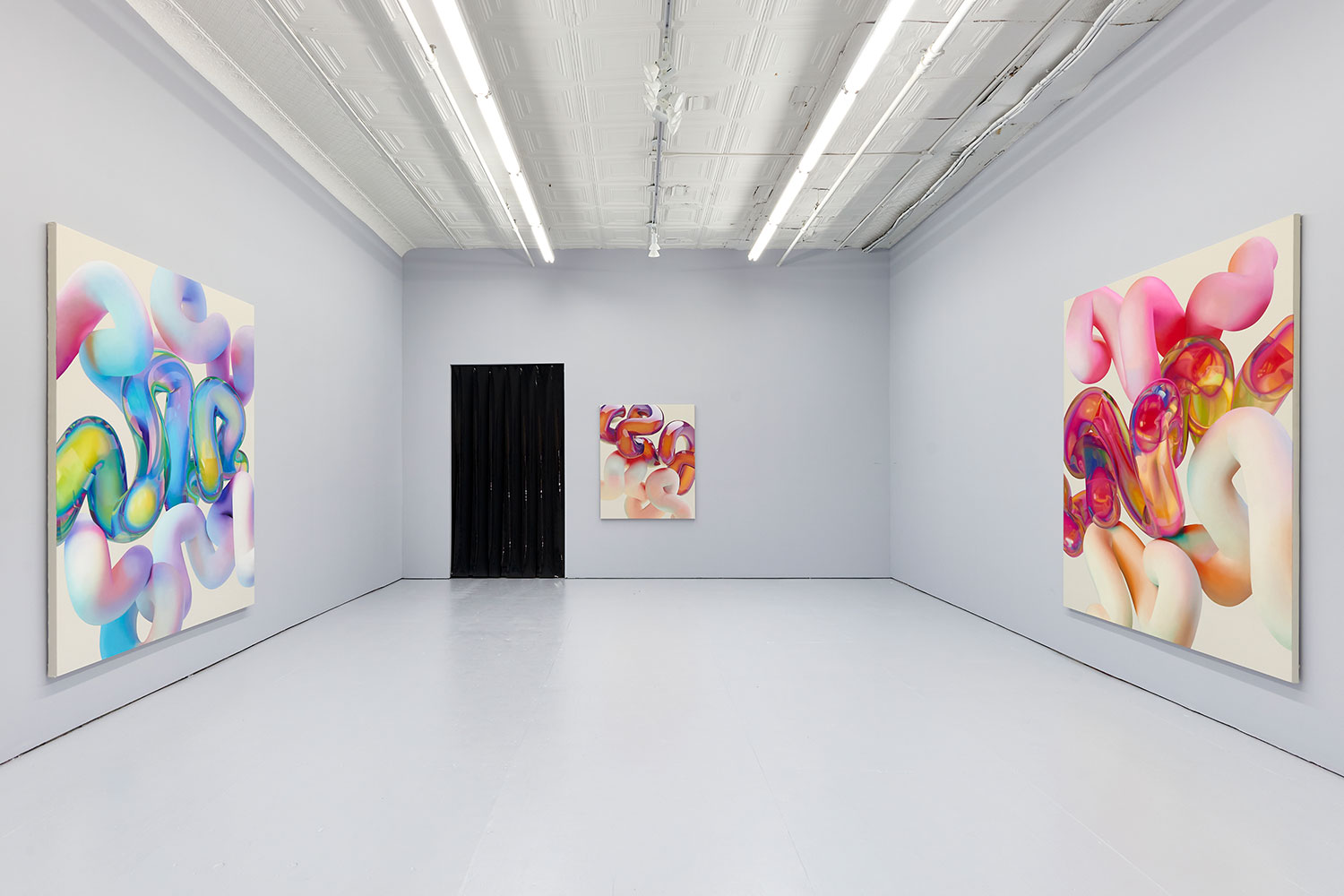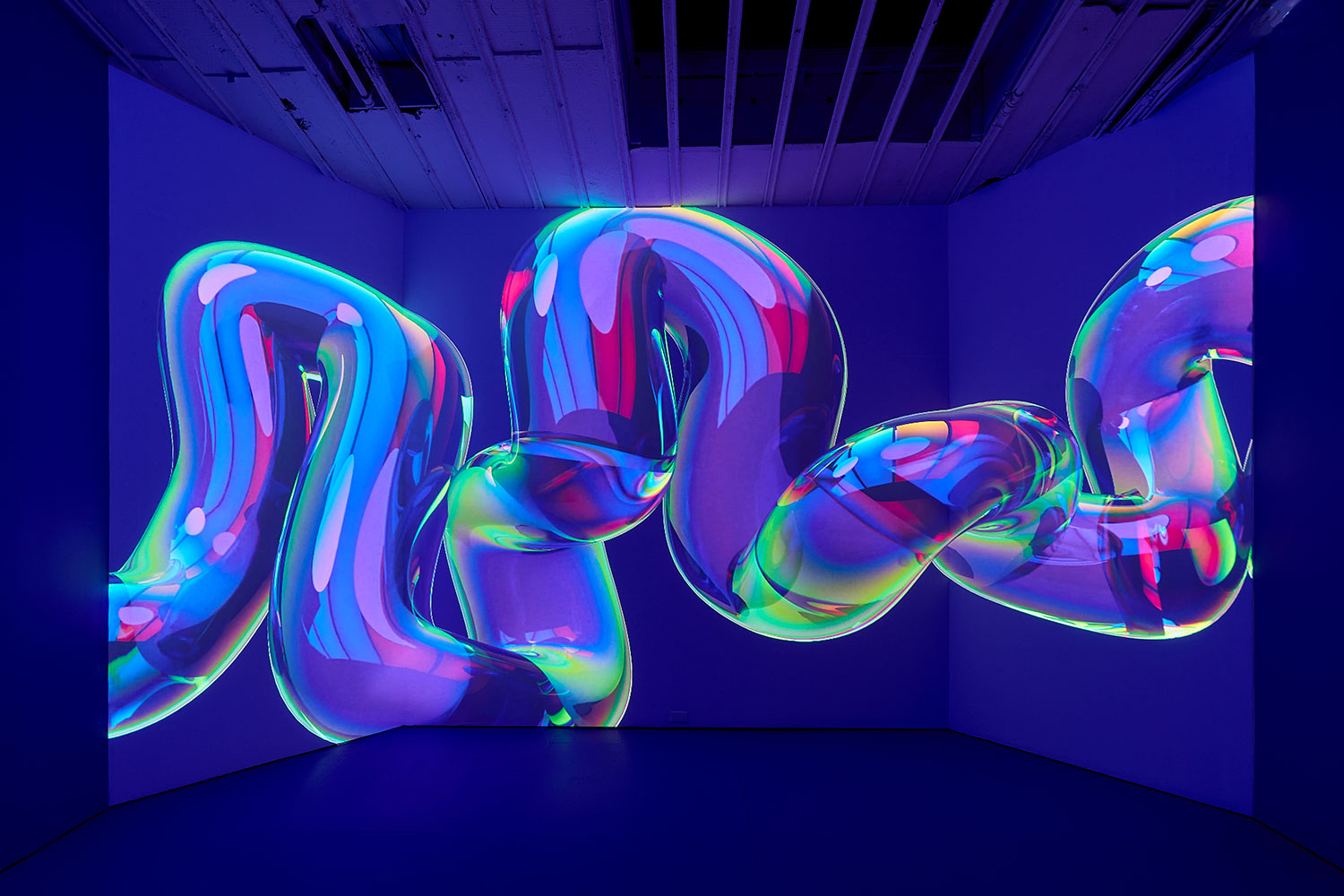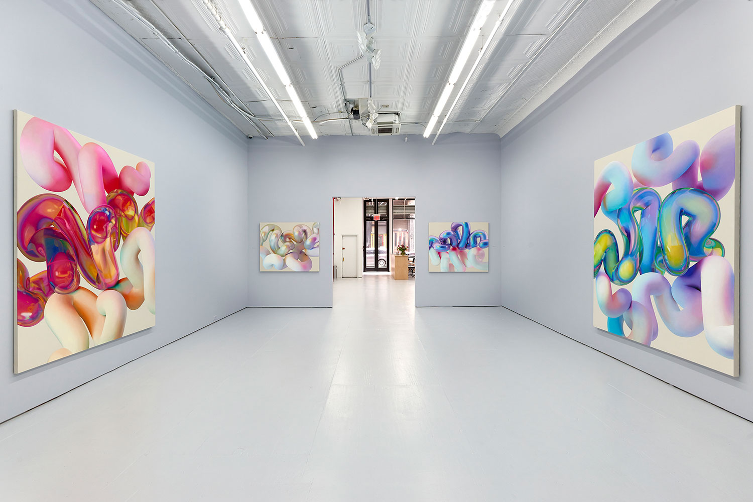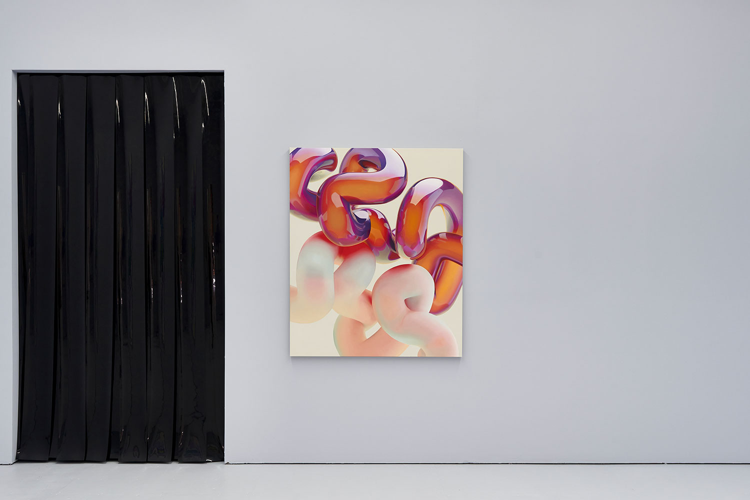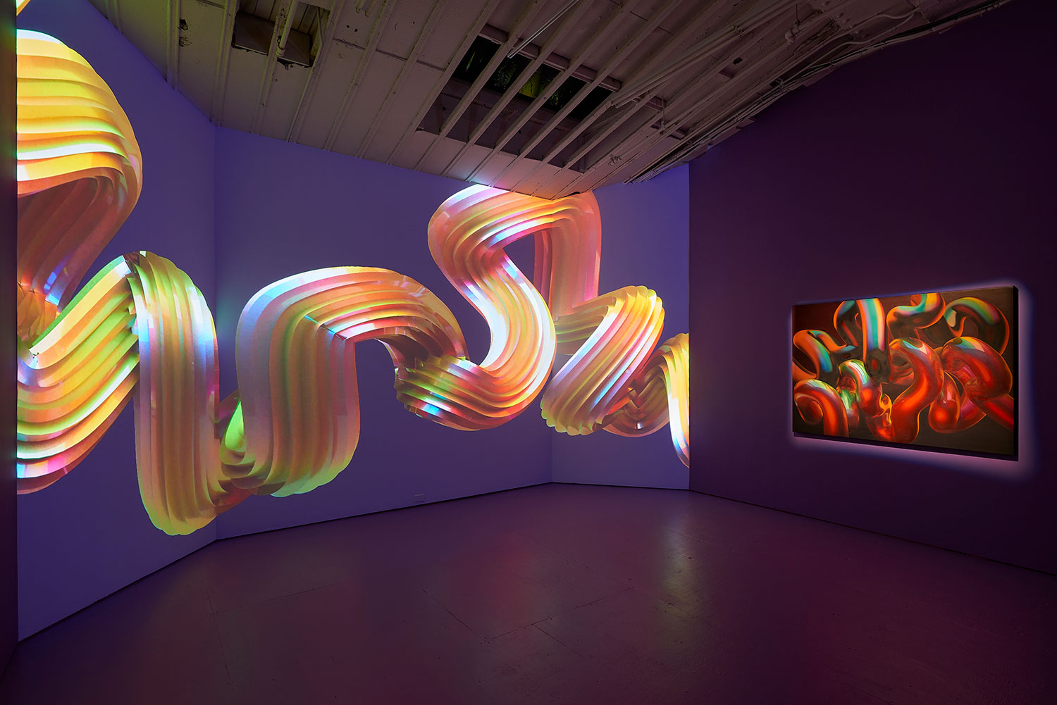 A continuation of Vainionpää’s Soft Body Dynamics series, the paintings for Software feature curvilinear shapes that bend and protrude, twisting into biomorphic forms that are non-representational yet familiar. With their cool, fleshy tones and plush texture, a certain exuberance exists in the work, giving way to a sense of techno-optimism that binds the dual process of code and paint. In addition to this series of paintings, the exhibition will also feature the artist’s first immersive video piece mapped across three walls in the back "apse" of the gallery, titled Dark Mode. Contrasting Vainionpää’s traditionally light, ethereal, and optimistic style of painting, the video installation plays with colors, textures, and lighting that are moody and nocturnal. The 5-minute long 4K looping video is accompanied by a unique synth score written specifically for the project by Montreal musician Nick Schofield to create a sensory experience.