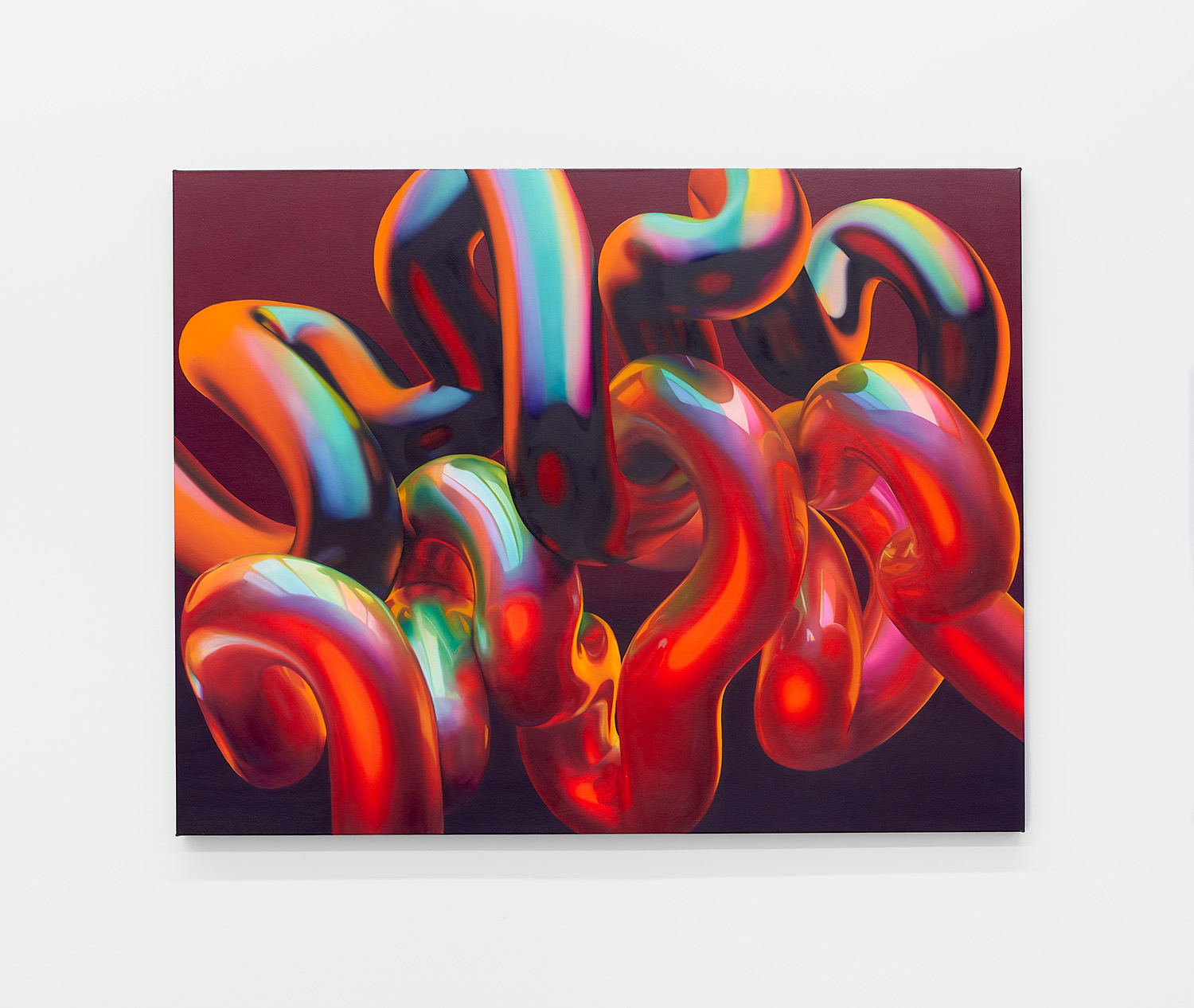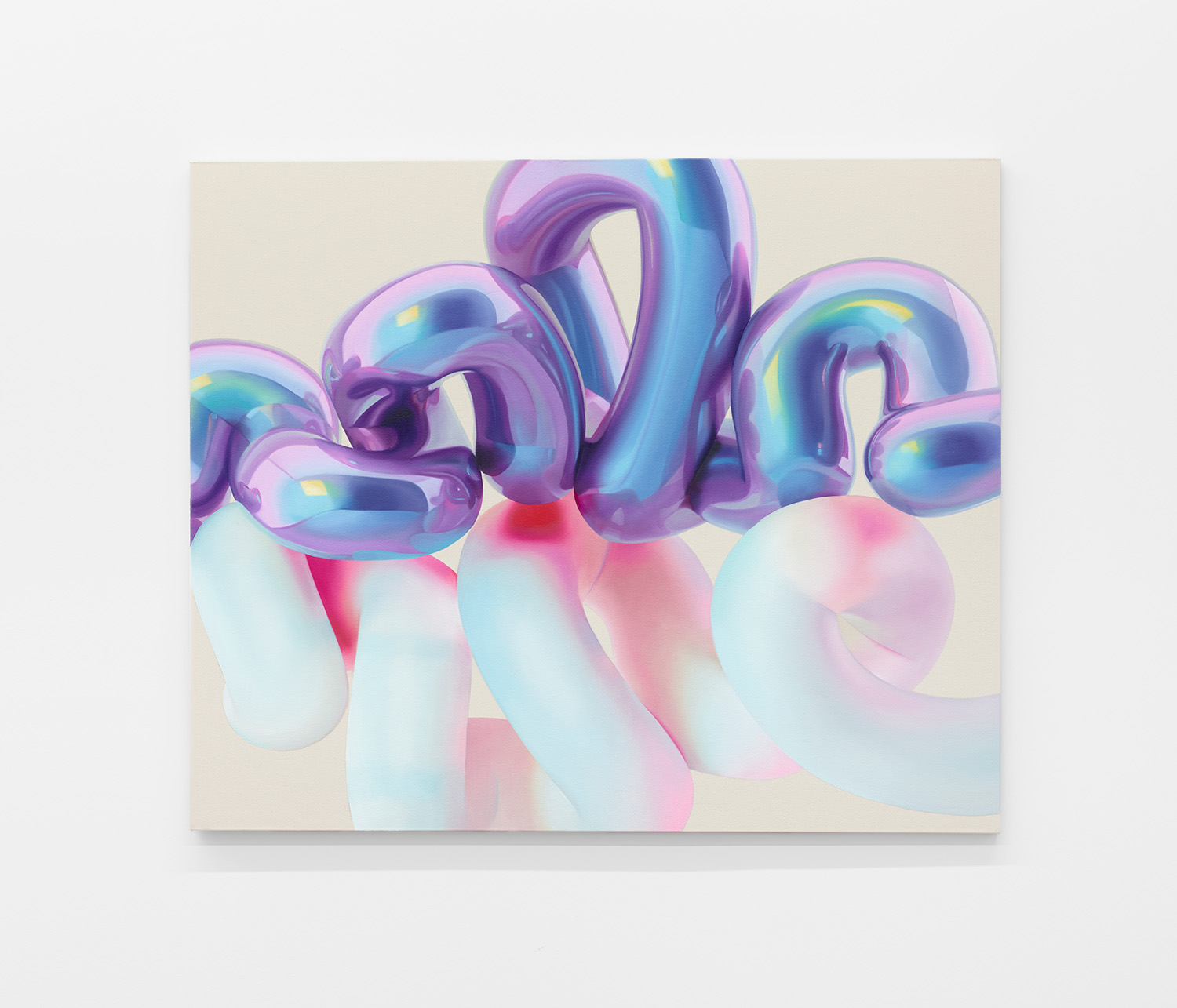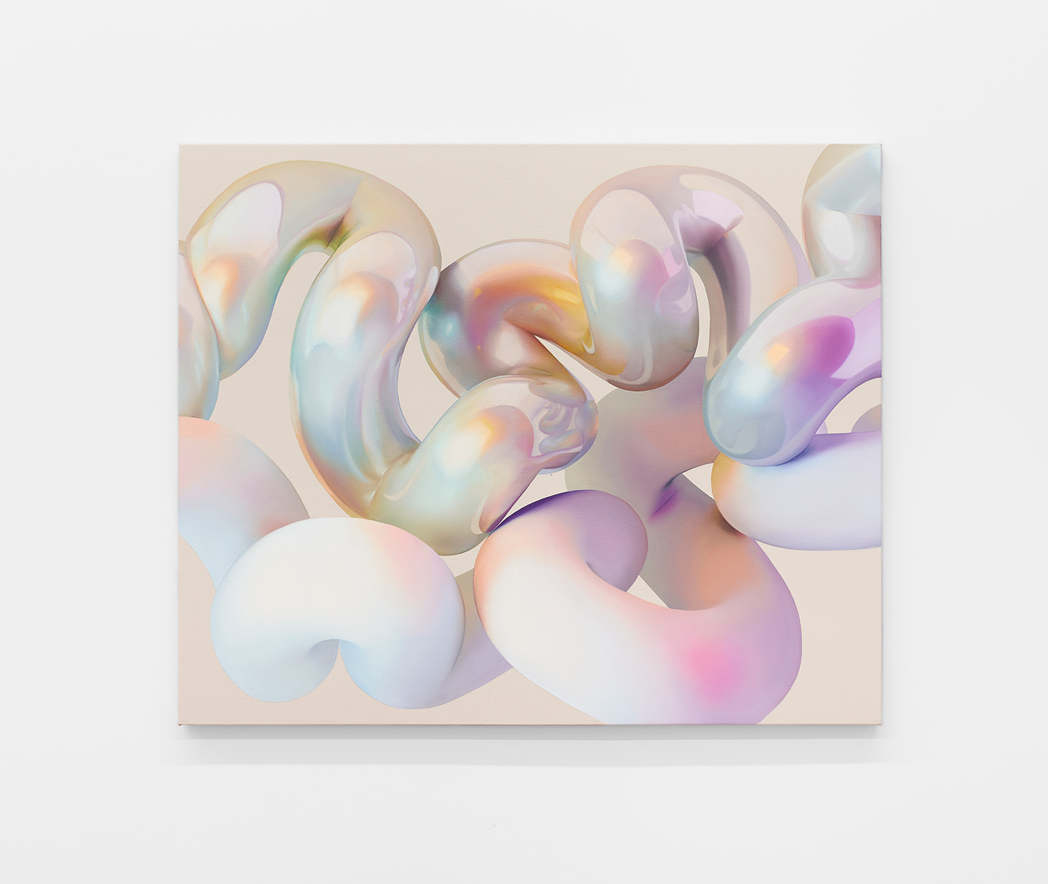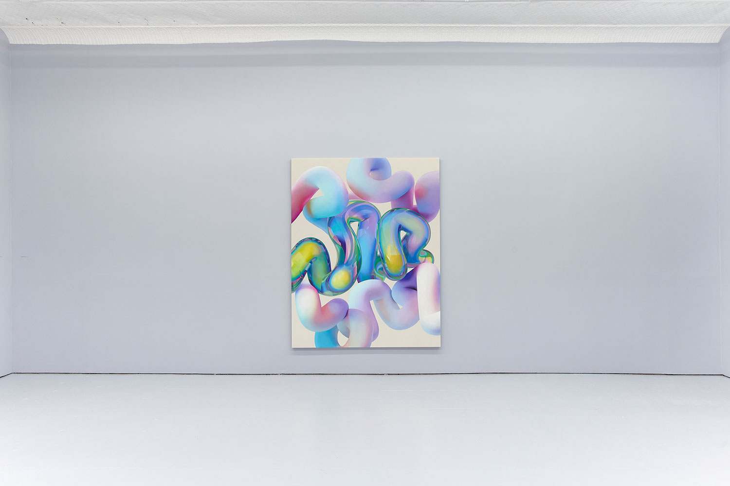 Vickie Vainionpää’s practice considers the impact of technology on the process of painting and investigates the relationship between natural forces and digital processes. In her ongoing Soft Body Dynamics series, twisting, tubular forms are systematically created using generative 3D modeling software. The software randomly generates a set number of splines per day, from which the artist selects to create final compositions which are painted by hand using oil on linen. By embracing new digital means of reading space and content, the works draw attention to the ever-changing relationship between the human body and digital technology.