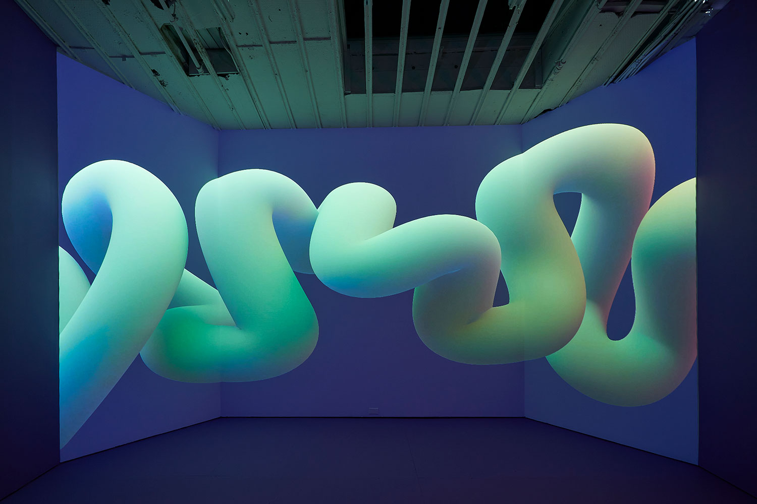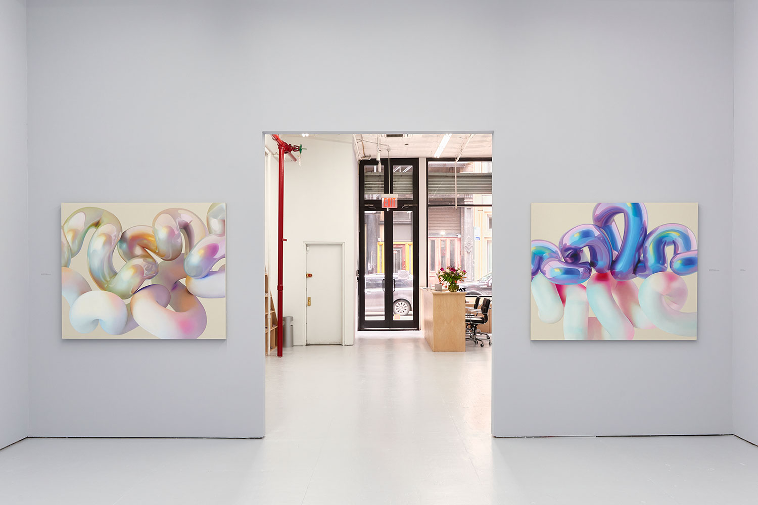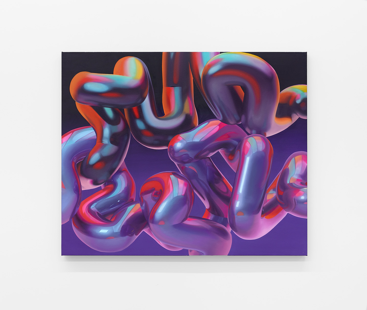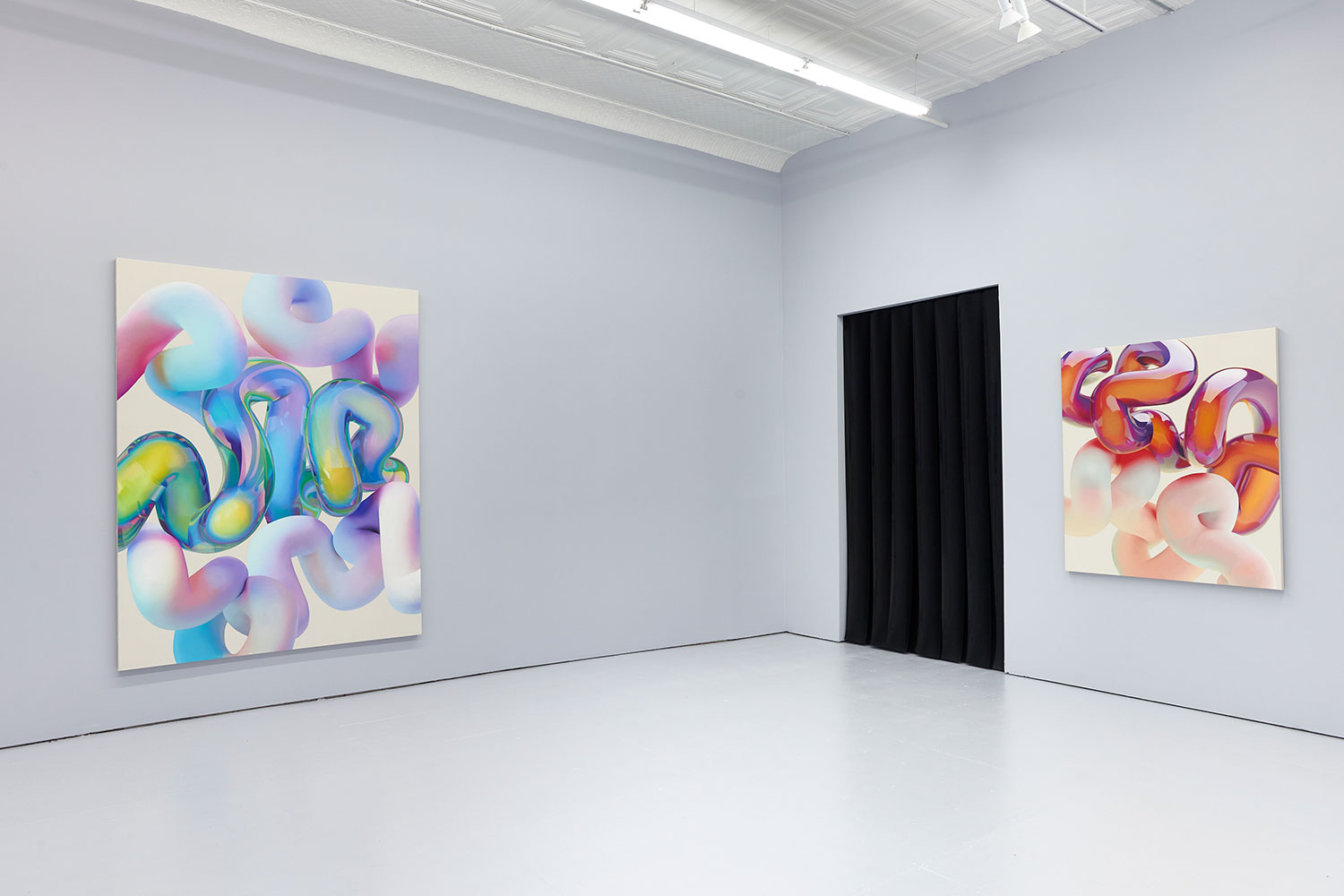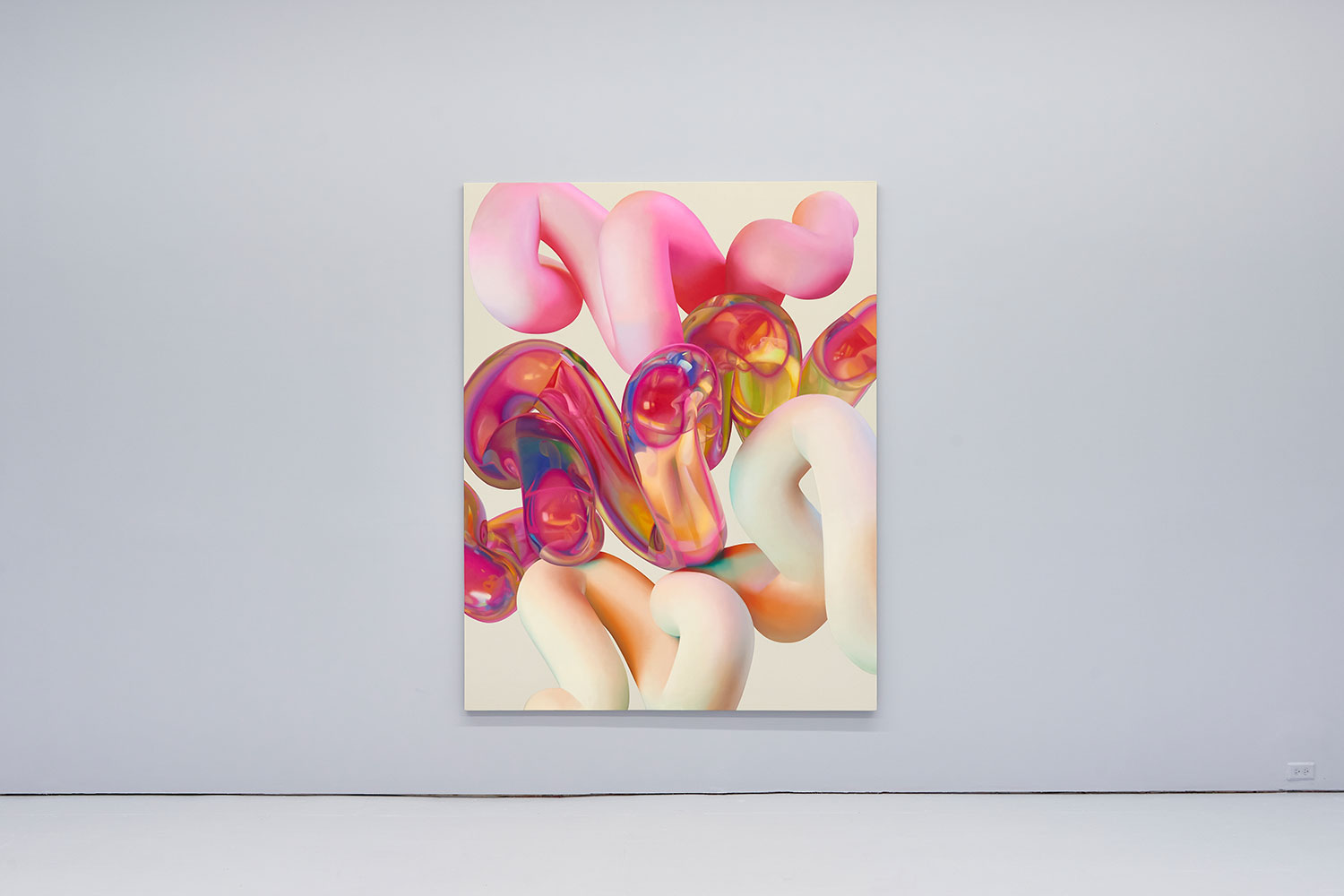Vickie Vainionpää’s practice considers the impact of technology on the process of painting and investigates the relationship between natural forces and digital processes. In her ongoing Soft Body Dynamics series, twisting, tubular forms are systematically created using generative 3D modeling software. The software randomly generates a set number of splines per day, from which the artist selects to create final compositions which are painted by hand using oil on linen. By embracing new digital means of reading space and content, the works draw attention to the ever-changing relationship between the human body and digital technology.