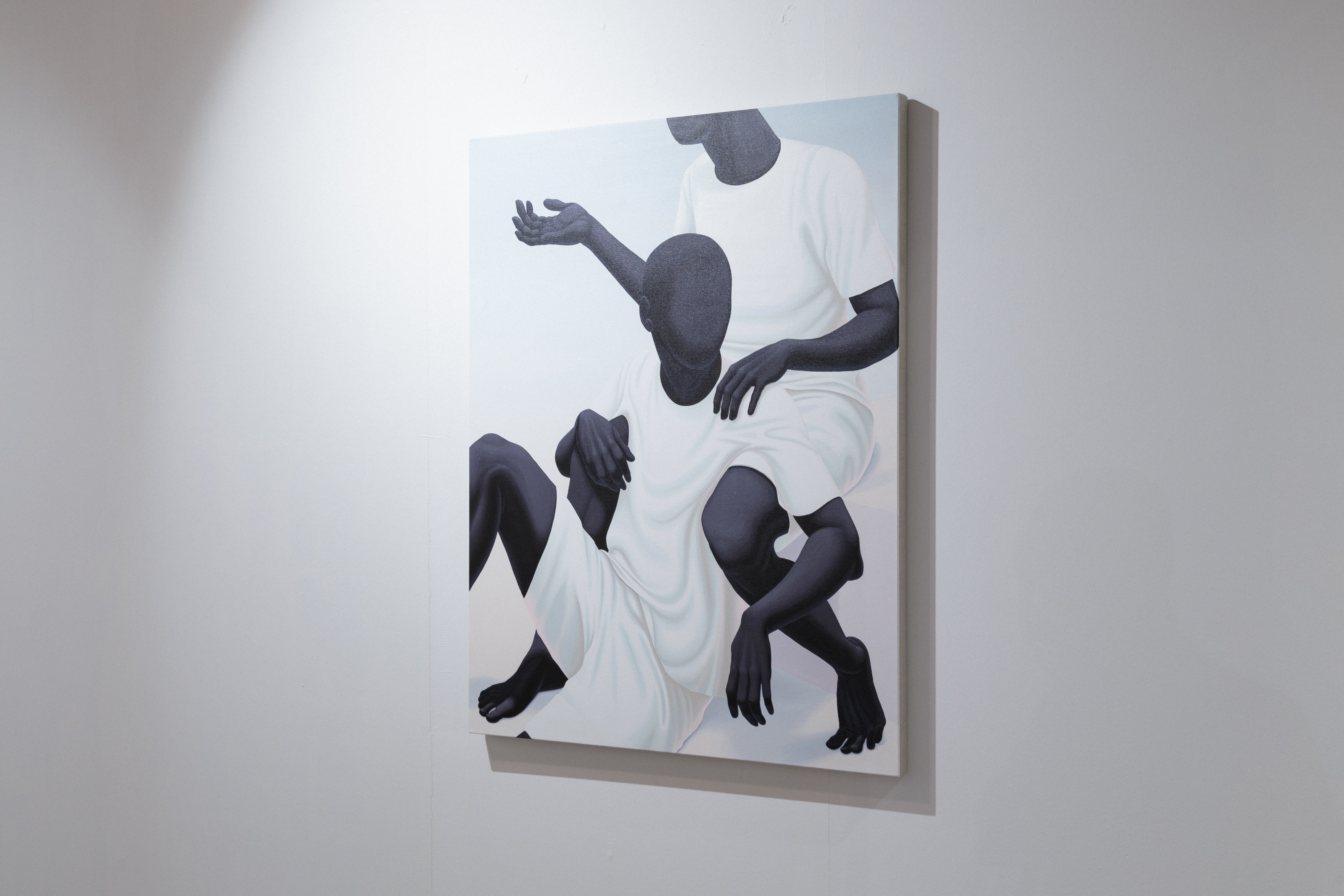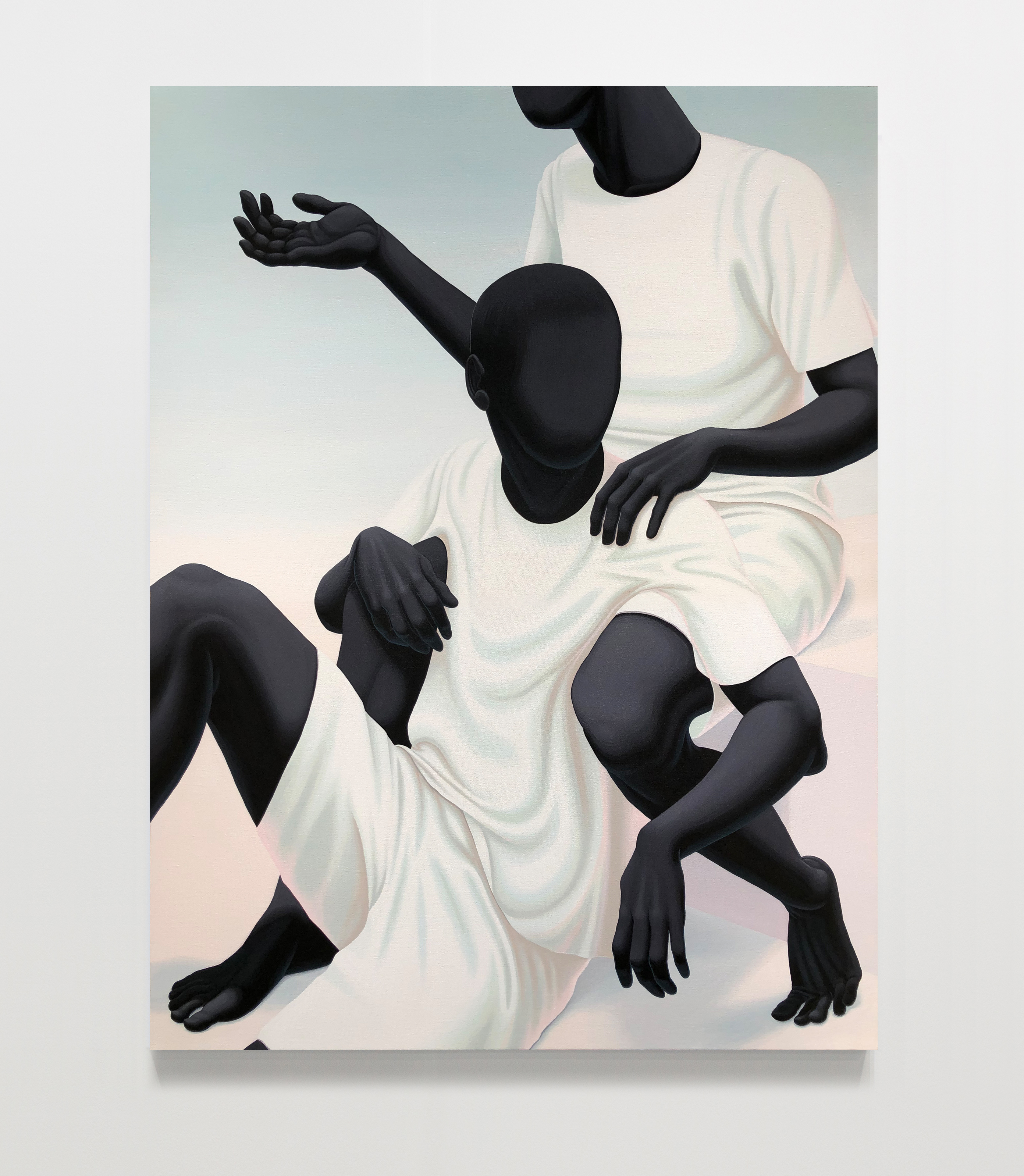 Alex Gardner is a figure painter working in acrylic on linen to make intense and memorable scenes. His entangled ink-black bodies are draped with dramatic folding white cotton separates and posed in pastel environments where the reflections of color produce subtle gradients and thoughtful tonal shifts. As in Mannerist paintings, they capture drama with their bodies through the distortion of torsion. Expression is only through body language. Gender is hinted at, but as with the skin, the clothes, and the environments, all cultural signifiers are smoothed over to de-individuate and universalize. In these paintings, the artist paints bodies that all genders and races could see themselves in. Mimicking snippets of classical painting, he is not just inserting his contemporary identity into art history, but also opening up these art historical perspectives for all viewers to connect with. Gardner graduated with a BFA from California State University, Long Beach, and lives and works in Long Beach, California. His first solo show with The Hole was in 2017.