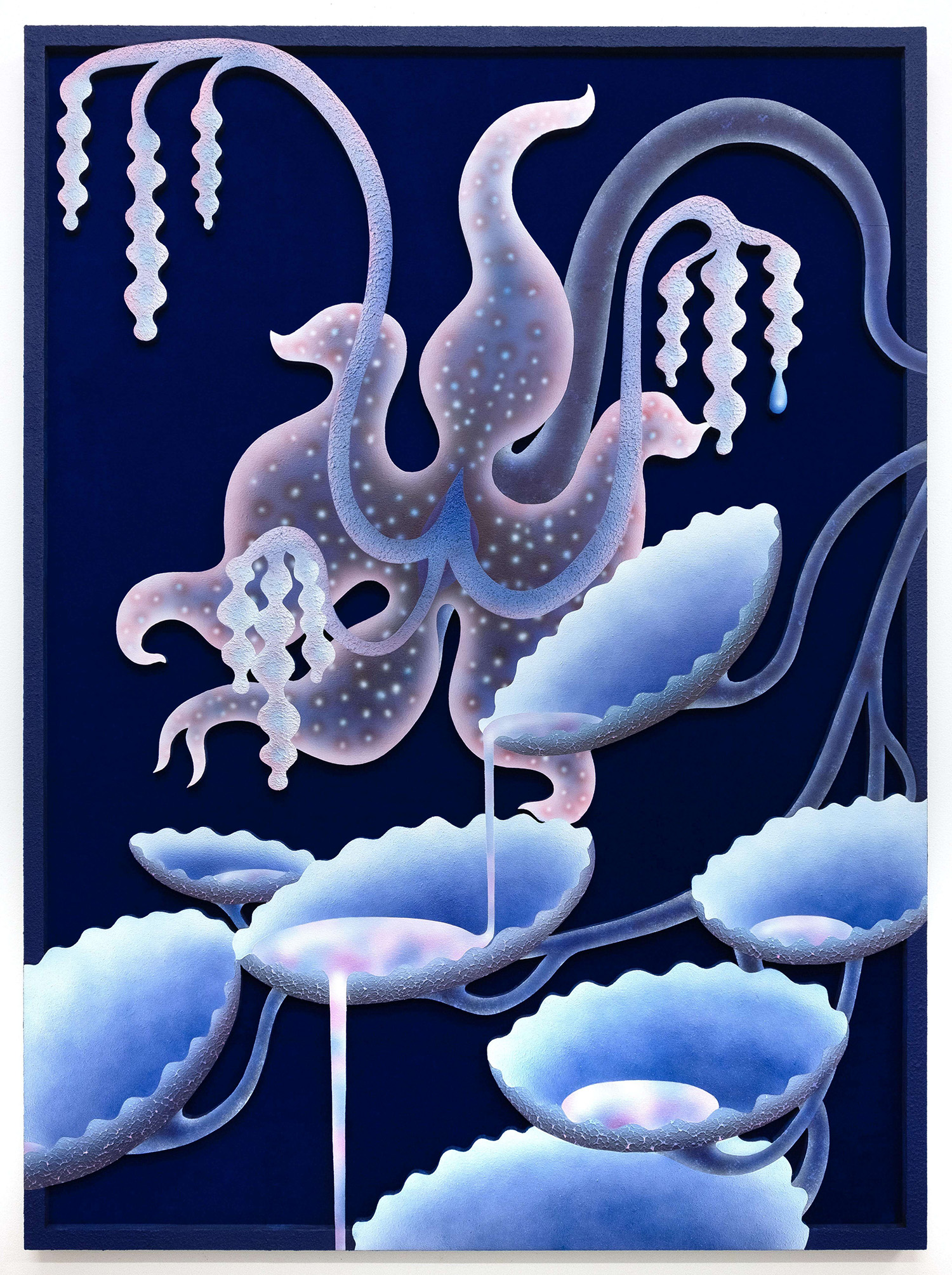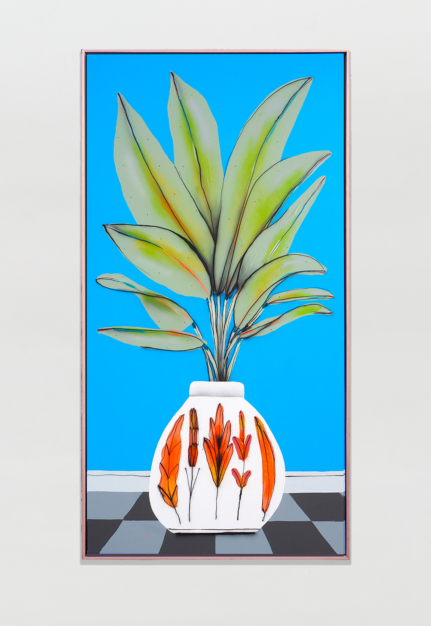 Tom Gerrard, Pot Plant Blue 1, 2021. Synthetic polymer and spray paint on framed artist board, 48 x 24 inches, 122 x 61 cm.