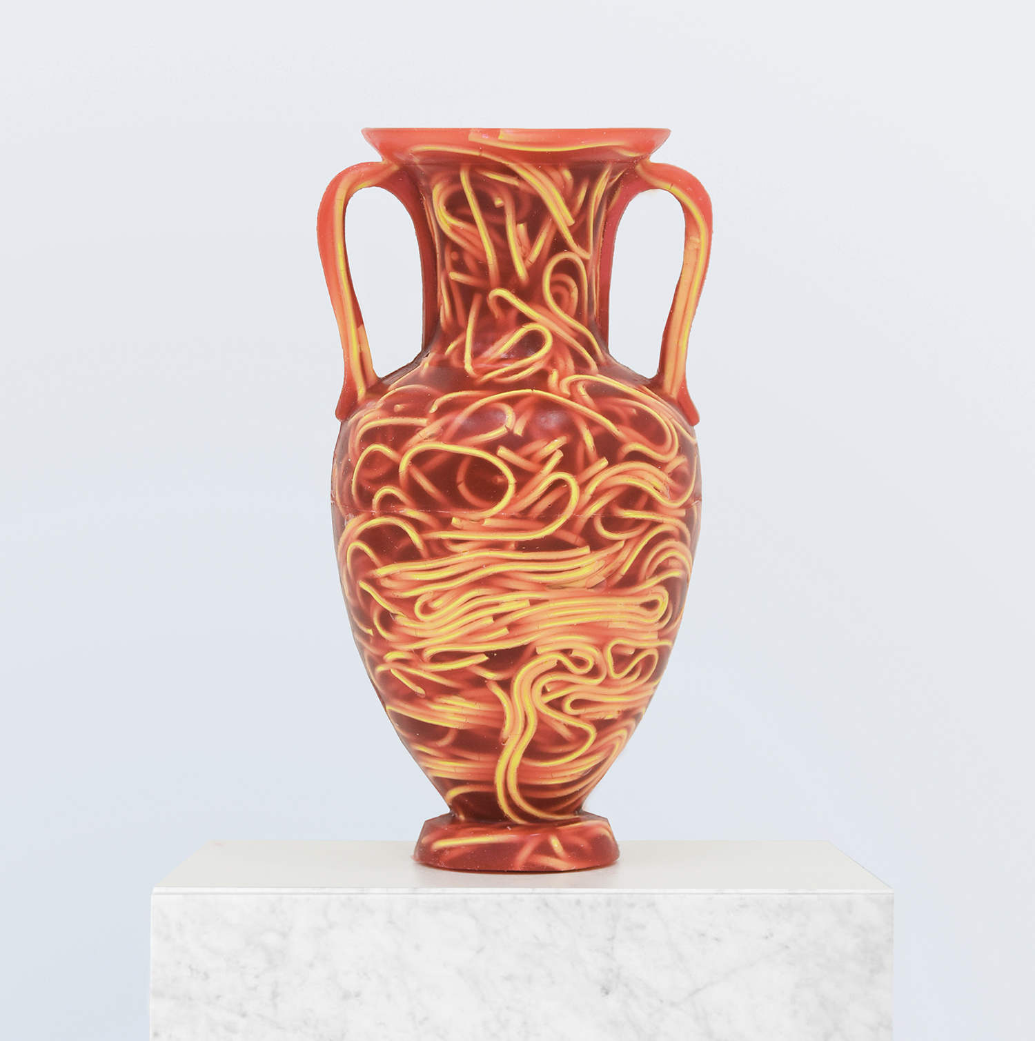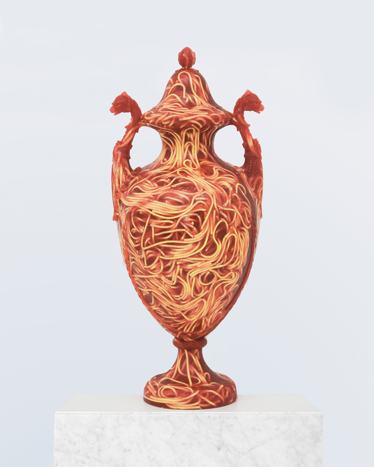 Adam Parker Smith, Amphora, 2021. Resin, polymer clay, Vase: 12 x 4 x 5 inches, 31 x 10 x 13 cm. Pedestal: 32 x 12 x 12 inches, 81 x 31 x 31 cm. Edition of 5, 1AP.
