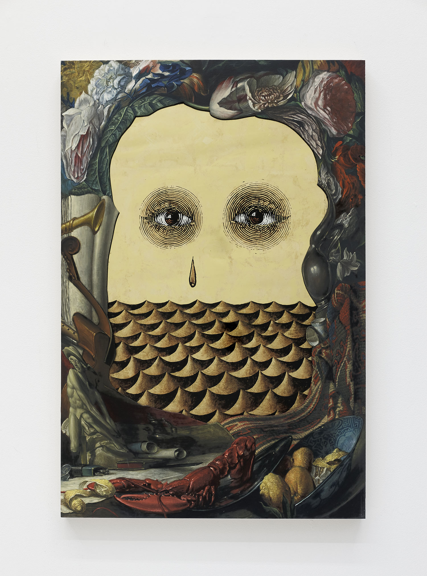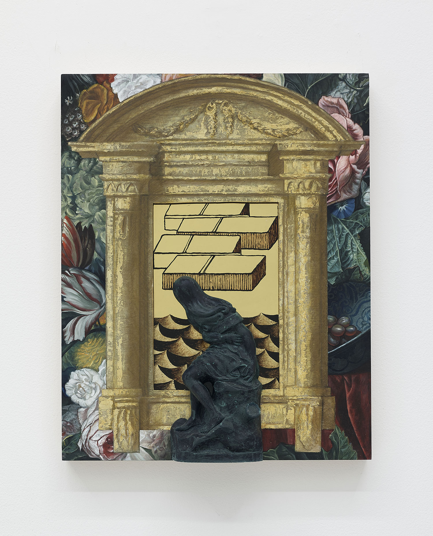 Matthew Hansel, If Seeing is Believing, What is Doubting?, 2020. Oil on panel, reverse painting and gold leafed glass, 36 x 24 x 1.5 inches, 91 x 61 x 4 cm.