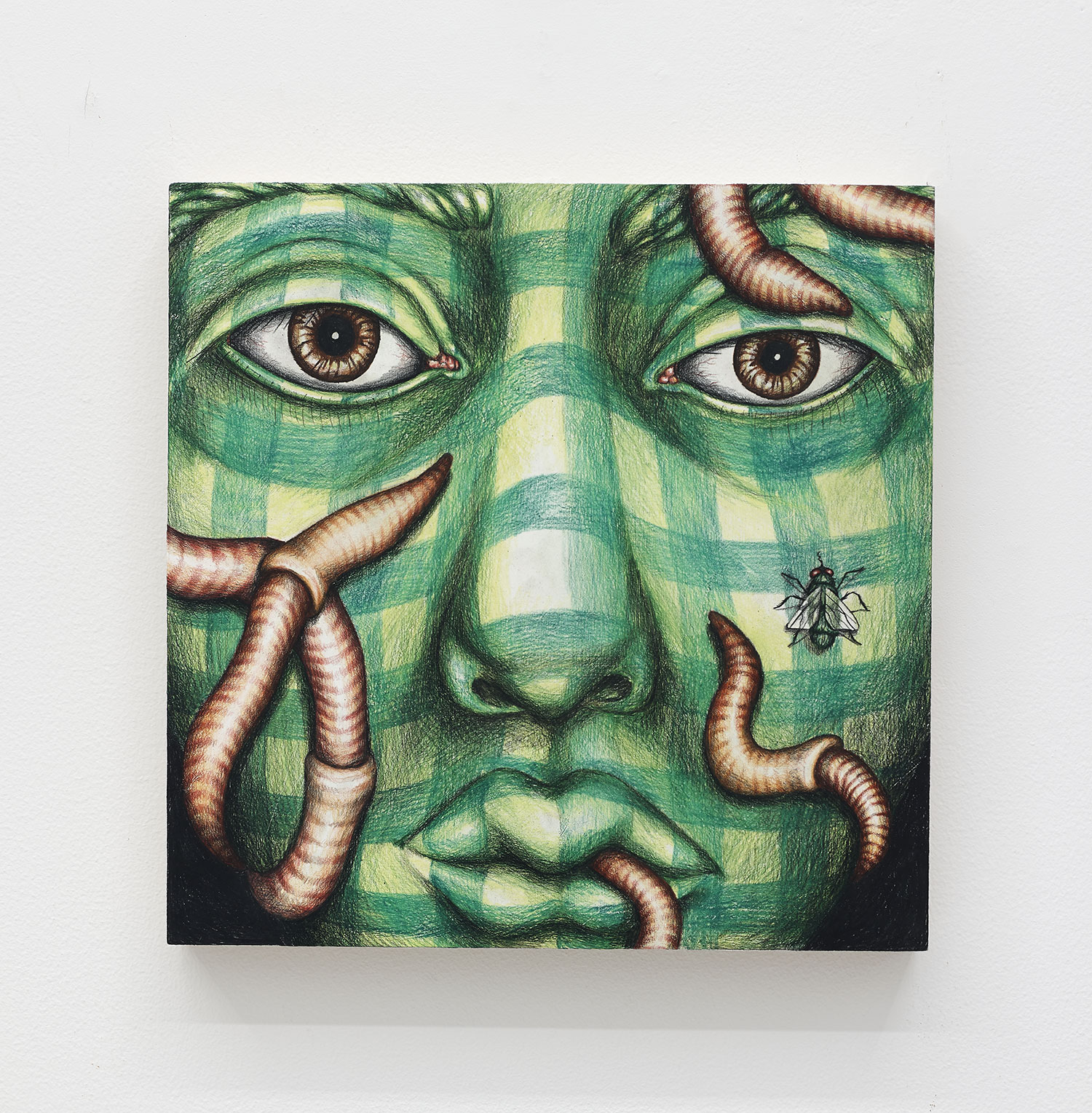 Samantha Rosenwald, Dust to Dust, 2021. Colored pencil on wood panel, 14 x 14 inches, 36 x 36 cm.
