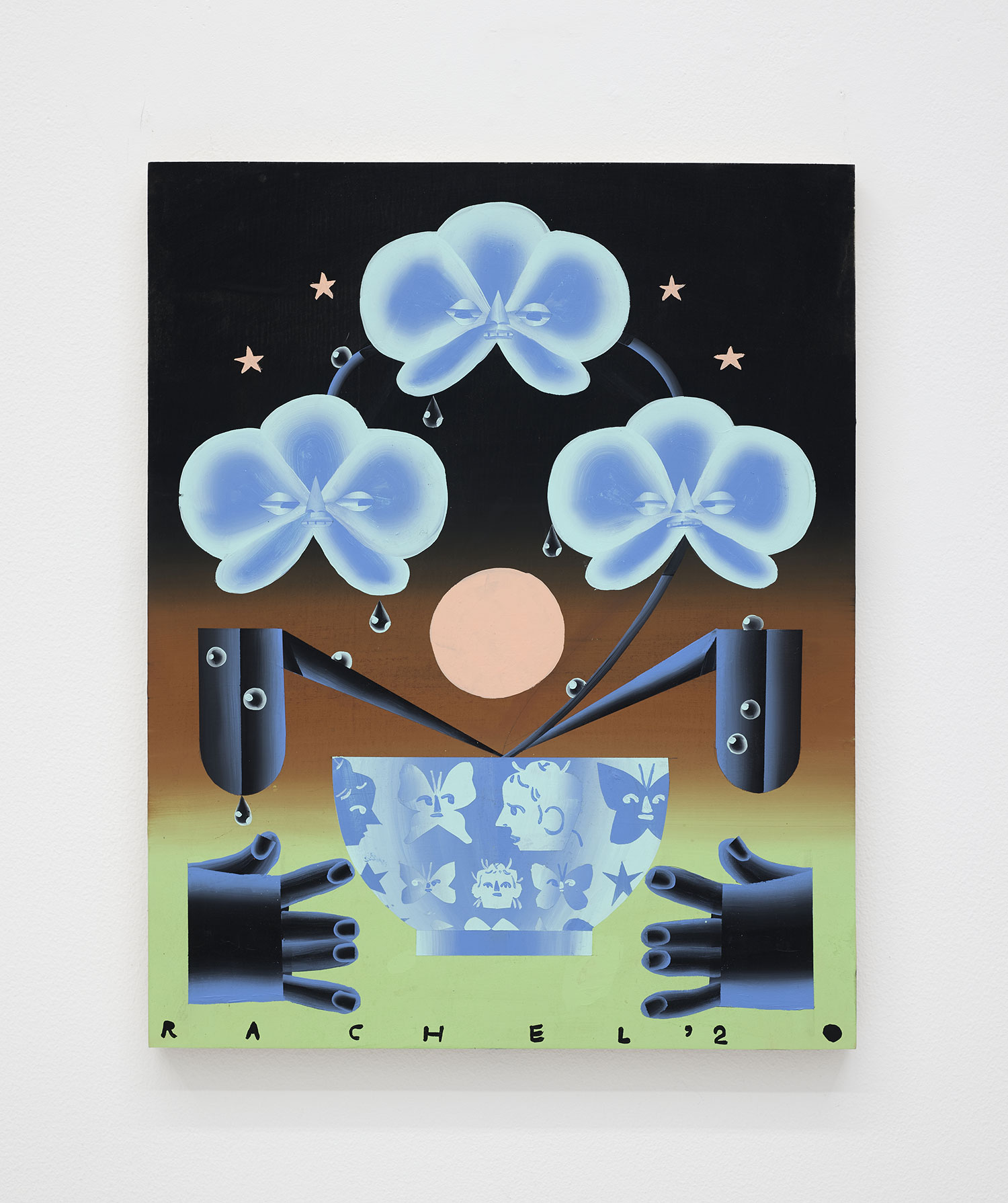 Rachel Hayden, Orchid in Decorative Bowl, 2020. Acrylic on panel. 20 x 16 inches, 51 x 41 cm.