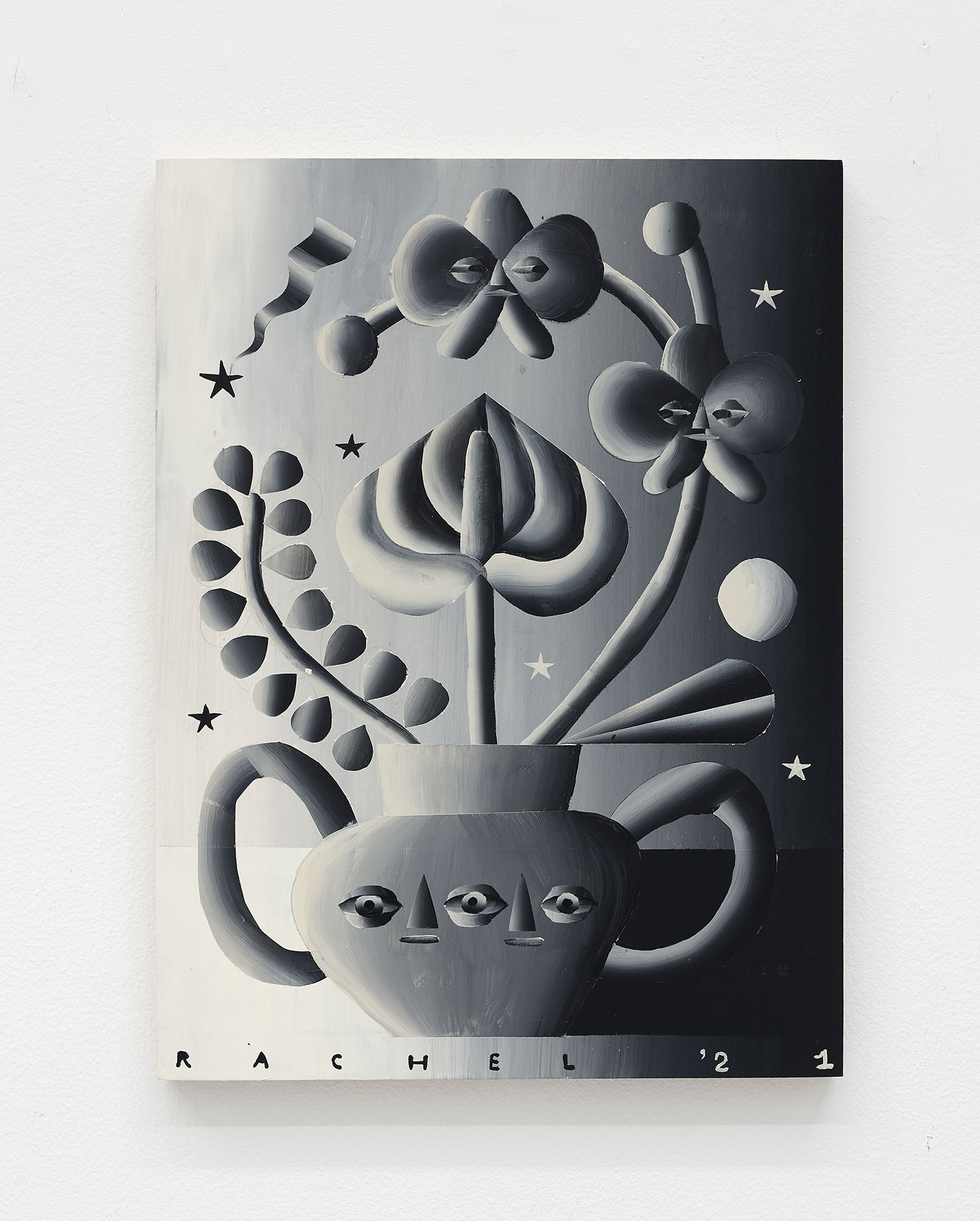 Rachel Hayden, Black and White Still Life, 2021. Acrylic on panel. 16 x 12 inches, 41 x 31 cm.